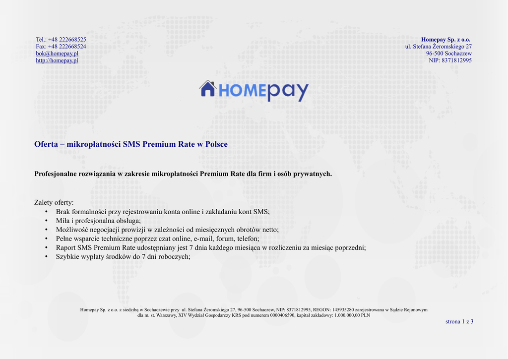Tel.: +48 222668525 Fax: +48 222668524 [email protected] http://homepay.pl Homepay Sp. z o.o. ul. Stefana Żeromskiego 27 96-500 Sochaczew NIP: 8371812995 Oferta – mikropłatności SMS Premium Rate w Polsce Profesjonalne rozwiązania w zakresie mikropłatności Premium Rate dla firm i osób prywatnych. Zalety oferty: • Brak formalności przy rejestrowaniu konta online i zakładaniu kont SMS; • Miła i profesjonalna obsługa; • Możliwość negocjacji prowizji w zależności od miesięcznych obrotów netto; • Pełne wsparcie techniczne poprzez czat online, e-mail, forum, telefon; • Raport SMS Premium Rate udostępniany jest 7 dnia każdego miesiąca w rozliczeniu za miesiąc poprzedni; • Szybkie wypłaty środków do 7 dni roboczych; Homepay Sp. z o.o. z siedzibą w Sochaczewie przy ul. Stefana Żeromskiego 27, 96-500 Sochaczew, NIP: 8371812995, REGON: 145935280 zarejestrowana w Sądzie Rejonowym dla m. st. Warszawy, XIV Wydział Gospodarczy KRS pod numerem 0000406590, kapitał zakładowy: 1.000.000,00 PLN strona 1 z 3 Tel.: +48 222668525 Fax: +48 222668524 [email protected] http://homepay.pl Homepay Sp. z o.o. ul. Stefana Żeromskiego 27 96-500 Sochaczew NIP: 8371812995 Tabela opłat i prowizji Progi prowizji mikropłatności SMS Premium Rate przygotowane zostały w sposób optymalny i zapewniający równowagę rynku SMS PR w Polsce. Zobacz jakie progi prowizji dla Ciebie przygotowaliśmy. Jeśli nie spełniają Twoich oczekiwań – skontaktuj się z nami i zapytaj o indywidualną ofertę! Obrót netto Prowizja dla Partnera netto 1 PLN – 25.000 PLN 48,00% 25.001 PLN – 50.000 PLN 49,00% 50.001 PLN – 100.000 PLN 50,00% 100.001 PLN – 200.000 PLN 51,00% 200.001 PLN + 52,00% Do każdej ceny netto należy doliczyć 23% lokalnego podatku VAT. Homepay Sp. z o.o. z siedzibą w Sochaczewie przy ul. Stefana Żeromskiego 27, 96-500 Sochaczew, NIP: 8371812995, REGON: 145935280 zarejestrowana w Sądzie Rejonowym dla m. st. Warszawy, XIV Wydział Gospodarczy KRS pod numerem 0000406590, kapitał zakładowy: 1.000.000,00 PLN strona 2 z 3 Tel.: +48 222668525 Fax: +48 222668524 [email protected] http://homepay.pl Homepay Sp. z o.o. ul. Stefana Żeromskiego 27 96-500 Sochaczew NIP: 8371812995 Dostępne taryfy Sprawdź jakie taryfy dostępne są w naszym serwisie. Tabela zawiera numery ogólne, 18+, ceny netto SMS-ów oraz prowizję należną Partnerowi. Numer ogólny Numer 18+ Cena netto Prowizja dla Partnera netto 7055 - 0,50 zł 0,24 zł 7155 71856 1,00 zł 0,48 zł 7255 72876 2,00 zł 0,96 zł 7355 73868 3,00 zł 1,44 zł 7455 74926 4,00 zł 1,92 zł 7555 - 5,00 zł 2,40 zł 7655 76806 6,00 zł 2,88 zł 7955 - 9,00 zł 4,32 zł 91455 - 14,00 zł 6,72 zł 91955 91986 19,00 zł 9,12 zł 92555 92596 25,00 zł 12,00 zł Do każdej ceny netto należy doliczyć 23% lokalnego podatku VAT. Homepay Sp. z o.o. z siedzibą w Sochaczewie przy ul. Stefana Żeromskiego 27, 96-500 Sochaczew, NIP: 8371812995, REGON: 145935280 zarejestrowana w Sądzie Rejonowym dla m. st. Warszawy, XIV Wydział Gospodarczy KRS pod numerem 0000406590, kapitał zakładowy: 1.000.000,00 PLN strona 3 z 3
