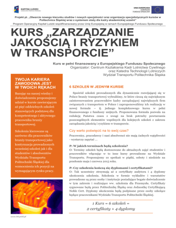 Projekt pt. „Otwarcie nowego kierunku studiów i nowych specjalności oraz organizacja specjalistycznych kursów w Politechnice Śląskiej wraz z systemem staży dla kadry akademickiej uczelni” Program Operacyjny Kapitał Ludzki współfinansowany przez Unię Europejską w ramach Europejskiego Funduszu Społecznego KURS „ZARZĄDZANIE JAKOŚCIĄ I RYZYKIEM W TRANSPORCIE” Kurs w pełni finansowany z Europejskiego Funduszu Społecznego Organizator: Centrum Kształcenia Kadr Lotnictwa Cywilnego oraz Katedra Technologii Lotniczych Wydział Transportu Politechnika Śląska TWOJA KARIERA ZAWODOWA JEST W TWOICH RĘKACH 6 SZKOLEŃ W JEDNYM KURSIE Bazując na naszej wiedzy i doświadczeniu proponujemy udział w kursie zawierającym aż pięć oddzielnych szkoleń stanowiących podstawę dla kompetentnego i aktywnego pracownika branży transportowej. Spośród szkoleń prowadzonych dla dynamicznie rozwijającej się w Polsce branży transportowej wybraliśmy, te które cieszą się największym zainteresowaniem pracowników kadry zarządzającej największych firm związanych z transportem w Polsce i zaproponowaliśmy ich realizację w nowej formule – tj. jednego kompleksowego kursu w pełni finansowanego z funduszy unijnych. Proponowana formuła pozwala na redukcję Państwa czasu z uwagi na brak potrzeby powtarzania poszczególnych elementów wspólnych dla kolejnych szkoleń z zakresu zarządzania jakością i ryzykiem w transporcie. Szkolenia kierowane są zarówno dla pracowników branży transportowej jako kontynuacja prowadzonych wcześniej szkoleń jak i dla studentów i absolwentów Wydziału Transportu Politechniki Śląskiej dla wzmocnienia ich pozycji na wymagającym rynku pracy. Czy warto poświęcić na to swój czas? Pracownicy, pracodawcy i nasi absolwenci nie mają żadnych wątpliwości - wystarczy zapytać … P: W jakich terminach będą szkolenia? O: Terminy szkoleń będą dostosowane do aktualnych zajęć studentów i pracowników włączając w to inne kursy prowadzone na Wydziale Transportu. Proponujemy 10 spotkań w piątki, soboty i niedziele na przełomie maja i czerwca 2015 roku. P: Czy szkolenia kończą się dyplomami i certyfikatami? O: Tak uczestnicy otrzymają aż 2 certyfikaty audytora i 4 dyplomy ukończenia szkolenia. Szkolenia w formie wykładów i warsztatów prowadzone są przez osoby i instytucje posiadające bogate doświadczenie w tym zakresie i realizujące ww. szkolenia dla Przemysłu. Certyfikaty sygnowane będą przez Politechnikę Śląską oraz Jednostkę Certyfikującą Noble Cert. Dyplomy ukończenia będą podpisane przez osoby szkolące będące pracownikami Wydziału Transportu Politechniki Śląskiej. 1 Kurs = 6 szkoleń = 2 certyfikaty + 4 dyplomy www.ktl.polsl.pl Projekt pt. „Otwarcie nowego kierunku studiów i nowych specjalności oraz organizacja specjalistycznych kursów w Politechnice Śląskiej wraz z systemem staży dla kadry akademickiej uczelni” Program Operacyjny Kapitał Ludzki współfinansowany przez Unię Europejską w ramach Europejskiego Funduszu Społecznego DYPLOMY I CERTYFIKATY – DLA CIEBIE I TWOJEGO PRACODAWCY Umiejętności i kompetencje potwierdzone dyplomami i certyfikatami Innowacje na wyciągnięcie ręki … Certyfikat audytora wewnętrznego IRIS Certyfikat audytora wewnętrznego ISO Politechnika Śląska i Noble CERT Politechnika Śląska i Noble CERT Kontakt z nami: DR HAB. INŻ. NAWIG. ANDRZEJ FELLNER, PROF. NZW. PŚ C E N T R U M K S Z TAŁ C E N I A K AD R L O T N I C T WA CYWILNEGO EUROPY ŚRODKOWO – WSCHODNIEJ Dyplom ukończenia szkolenia Dyplom ukończenia szkolenia Pełnomocnik Human factor zarządu ds. systemów jakości W S P Ó Ł O R G A N I Z AT O R K AT E D R A T E C H N O L O G I I L O T N I C Z Y C H W Y D Z I AŁ T R AN S P O R T U P O L I T E C H N I K A Ś L ĄS K A UL. KRASIŃSKIEGO 13 40-019 KATOWICE TEL. 32 603 4058 Dyplom ukończenia szkolenia Analiza ryzyka w transporcie (FMEA) Dyplom ukończenia szkolenia Analiza RAMS i LCC CHCESZ ZAPYTAĆ O SZCZEGÓŁY? Więcej informacji uzyskają Państwo w sekretariacie Katedry, na stronie www.KTL.polsl.pl lub pod adresem [email protected], tel. 32 603 4058 lub pod adresem [email protected], tel. 32 603 4058 lub pod adresem [email protected], tel. 32 603 4190 ZGŁOSZENIA Zgłoszenia przyjmowane są na adres: [email protected] Decyduje kolejność zgłoszeń! Organizatorzy zastrzegają sobie prawo do zmian terminu i zakresu prowadzonego kursu.