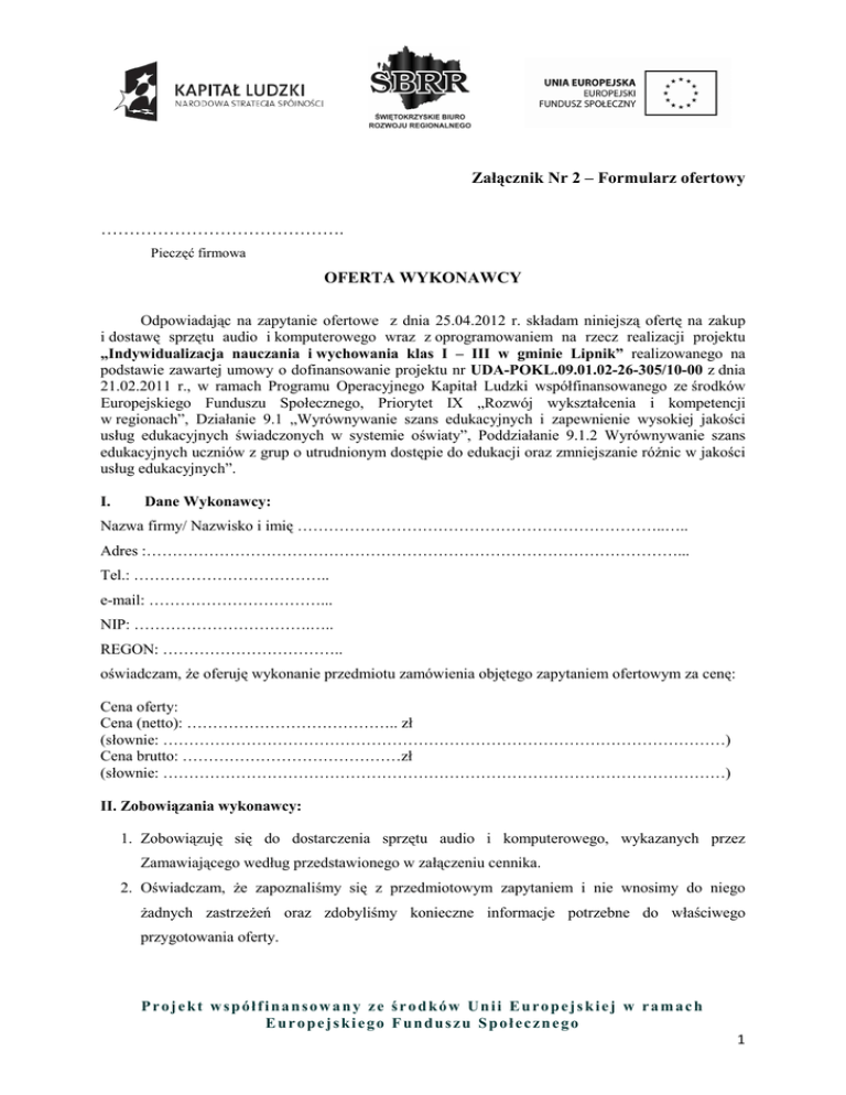 Załącznik Nr 2 – Formularz ofertowy ……………………………………. Pieczęć firmowa OFERTA WYKONAWCY Odpowiadając na zapytanie ofertowe z dnia 25.04.2012 r. składam niniejszą ofertę na zakup i dostawę sprzętu audio i komputerowego wraz z oprogramowaniem na rzecz realizacji projektu „Indywidualizacja nauczania i wychowania klas I – III w gminie Lipnik” realizowanego na podstawie zawartej umowy o dofinansowanie projektu nr UDA-POKL.09.01.02-26-305/10-00 z dnia 21.02.2011 r., w ramach Programu Operacyjnego Kapitał Ludzki współfinansowanego ze środków Europejskiego Funduszu Społecznego, Priorytet IX „Rozwój wykształcenia i kompetencji w regionach”, Działanie 9.1 „Wyrównywanie szans edukacyjnych i zapewnienie wysokiej jakości usług edukacyjnych świadczonych w systemie oświaty”, Poddziałanie 9.1.2 Wyrównywanie szans edukacyjnych uczniów z grup o utrudnionym dostępie do edukacji oraz zmniejszanie róŜnic w jakości usług edukacyjnych”. I. Dane Wykonawcy: Nazwa firmy/ Nazwisko i imię ……………………………………………………………..….. Adres :…………………………………………………………………………………………... Tel.: ……………………………….. e-mail: ……………………………... NIP: …………………………….….. REGON: …………………………….. oświadczam, Ŝe oferuję wykonanie przedmiotu zamówienia objętego zapytaniem ofertowym za cenę: Cena oferty: Cena (netto): ………………………………….. zł (słownie: ………………………………………………………………………………………………) Cena brutto: ……………………………………zł (słownie: ………………………………………………………………………………………………) II. Zobowiązania wykonawcy: 1. Zobowiązuję się do dostarczenia sprzętu audio i komputerowego, wykazanych przez Zamawiającego według przedstawionego w załączeniu cennika. 2. Oświadczam, Ŝe zapoznaliśmy się z przedmiotowym zapytaniem i nie wnosimy do niego Ŝadnych zastrzeŜeń oraz zdobyliśmy konieczne informacje potrzebne do właściwego przygotowania oferty. Projekt współfinansowany ze środków Unii Europejskiej w ramach Europejskiego Funduszu Społecznego 1 3. Oświadczamy, Ŝe zapoznaliśmy się z opisem przedmiotu zamówienia oraz zobowiązujemy się, w przypadku wyboru naszej oferty, Ŝe dostarczymy materiały objęte zamówieniem do miejsc realizacji projektu i w terminie, wskazanych przez Zamawiającego. 4. Oświadczam, Ŝe w cenie oferty zostały uwzględnione wszystkie koszty realizacji przyszłego świadczenia umownego. 5. Oświadczam, Ŝe określony w zapytaniu ofertowym „Projekt umowy” został przez nas zaakceptowany i zobowiązujemy się w przypadku uznania naszej oferty za najkorzystniejszą do zawarcia umowy na warunkach, w miejscu i terminie wyznaczonym przez Zamawiającego. 6. Oświadczam, Ŝe osobą uprawnioną do kontaktów z Zamawiającym jest: ……………………………….……., tel.: ……………………………………. 7. Oświadczam, Ŝe w przypadku uznania naszej oferty za najkorzystniejszą naleŜne nam wynagrodzenie będzie moŜna przekazać na rachunek bankowy nr: ………………………………………………………………………. 8. Oświadczam, Ŝe nasza oferta składa się z ………….ponumerowanych stron. 9. Oświadczam, Ŝe integralną częścią niniejszej oferty są: 1) ………………………………………………………………. 2) ………………………………………………………………. 3) ………………………………………………………………. ..................................................... Miejscowość i data ………………………………………. Podpis osoby upowaŜnionej do reprezentowania Wykonawcy Projekt współfinansowany ze środków Unii Europejskiej w ramach Europejskiego Funduszu Społecznego 2 I. Lp. Wykaz sprzętu audio, komputerowego i oprogramowania do realizacji zajęć w Szkole Podstawowej w Lipniku. Nazwa Komputer przenośny typu 1. laptop (wymagania minimalne) Odtwarzacz CD typu "Philips 2. Bumbox CD AZ1850" lub równowaŜny Specyfikacja produktu Procesor: co najmniej Intel CORE i5 lub równowaŜny Szybkość procesora: co najmniej 2,2 GHz Przekątna ekranu min:17 cala Rozdzielczość min. 1024 × 768 Powierzchnia matrycy błyszcząca Karta graficzna dedykowana : min 1024 MB Karta sieciowa LAN - Enternet 10/100/1000 Zainstalowana pamięć RAM min: 4 GB DDR 3 Dysk twardy: Co najmniej 500 GB Napęd optyczny : Dwuwarstwowa (Dual Layer) nagrywarka DVD (+/-R +/-RW) Komunikacja WiFi: co najmniej 54Mbit -802.11 b/g/n Liczba portów USB co najmniej 3 szt, w tym: USB 2.0 - co najmniej 1 szt i USB 3.0 co najmniej 1 szt. Port Video HDMI, wyjście D-Sub Bluetooth: Tak Kamera internetowa: co najmniej 1,3 Mpix Wbudowany mikrofon Wejście zasilania (DC-in) Wejście mikrofonowe, wyjście słuchawkowe/głośnikowe Czytnik kart pamięci Bateria litowo-jonowa Klawiatura numeryczna Zasilacz w zestawie System operacyjny Windows 7 64-bit , wersja językowa: Polska, rodzaj licencji: licencja na komputer Dołączone oprogramowanie: Pakiet Microsoft Office Starter 2010 w zestawie, wersja językowa: Polska Oprogramowanie do nagrywania płyt CD i DVD Mysz bezprzewodowa laserowa, 3 przyciski z rolką USB + podkładka Torba do laptopa z komorą na dokumenty Słuchawki z mikrofonem: połączenie: 3,5 mm mini jack (2x), czułość: 108dB/mW; pasmo przenoszenia 20 Hz-20000 Hz, mikrofon: 9*7/58+/-2dB, kompatybilność: PC, odtwarzacz CD Gwarancja 24 miesiące Wbudowane głośniki stereo Wyjście audio/video: Gniazdo słuchawek (3,5 mm) Odtwarzane formaty: MP3, WMA, Audio-CD Odtwarzane nośniki: CD, CD-R, CD-RW, MP3-CD, WMA-CD Host USB, MP3 Link - wejście liniowe stereo 3,5 mm Gwarancja 24