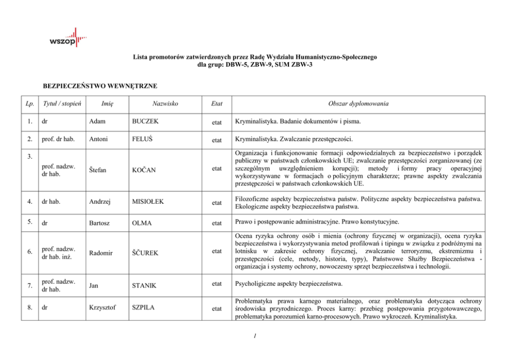 Lista promotorów zatwierdzonych przez Radę Wydziału Humanistyczno-Społecznego dla grup: DBW-5, ZBW-9, SUM ZBW-3 BEZPIECZEŃSTWO WEWNĘTRZNE Lp. Tytuł / stopień Imię 1. dr Adam BUCZEK etat Kryminalistyka. Badanie dokumentów i pisma. 2. prof. dr hab. Antoni FELUŚ etat Kryminalistyka. Zwalczanie przestępczości. Nazwisko Etat Obszar dyplomowania prof. nadzw. dr hab. Štefan KOČAN etat Organizacja i funkcjonowanie formacji odpowiedzialnych za bezpieczeństwo i porządek publiczny w państwach członkowskich UE; zwalczanie przestępczości zorganizowanej (ze szczególnym uwzględnieniem korupcji); metody i formy pracy operacyjnej wykorzystywane w formacjach o policyjnym charakterze; prawne aspekty zwalczania przestępczości w państwach członkowskich UE. 4. dr hab. Andrzej MISIOŁEK etat Filozoficzne aspekty bezpieczeństwa państw. Polityczne aspekty bezpieczeństwa państwa. Ekologiczne aspekty bezpieczeństwa państwa. 5. dr Bartosz OLMA etat Prawo i postępowanie administracyjne. Prawo konstytucyjne. 3. 6. prof. nadzw. dr hab. inż. Radomir ŠČUREK etat Ocena ryzyka ochrony osób i mienia (ochrony fizycznej w organizacji), ocena ryzyka bezpieczeństwa i wykorzystywania metod profilowań i tipingu w związku z podróżnymi na lotnisku w zakresie ochrony fizycznej, zwalczanie terroryzmu, ekstremizmu i przestępczości (cele, metody, historia, typy), Państwowe Służby Bezpieczeństwa organizacja i systemy ochrony, nowoczesny sprzęt bezpieczeństwa i technologii. 7. prof. nadzw. dr hab. Jan STANIK etat Psycholigiczne aspekty bezpieczeństwa. 8. dr Krzysztof SZPILA etat Problematyka prawa karnego materialnego, oraz problematyka dotycząca ochrony środowiska przyrodniczego. Proces karny: przebieg postępowania przygotowawczego, problematyka porozumień karno-procesowych. Prawo wykroczeń. Kryminalistyka. 1 9. dr Helena WICHER etat Prawo pracy, w tym przede wszystkim zagadnienia dotyczące czasu pracy, wynagrodzenia za pracę, stosunek pracy, lobbying, dyskryminacja, urlopy, odpowiedzialność pracownika pracodawcy, wypadki przy pracy, ochrona pracy. 10. dr Monika ZAWARTKA – CZEKAJ etat Kultura i cywilizacje. Socjologia. Bezpieczeństwo społeczności lokalnych. Patologie społeczne. 11. dr Piotr ANTONIAK - 12. dr Andrzej CICHY - 13. prof. nadzw. dr hab. Krzysztof CZEKAJ - 14. dr hab. Jacek DWORZECKI - Zarządzanie kryzysowe, jako forma zapewnienia bezpieczeństwa; Organizacja zarządzania kryzysowego w Polsce; Zadania organów administracji publicznej w zarządzaniu kryzysowym; Systemy, obiekty i instalacje infrastruktury krytycznej; Funkcje Obrony Cywilnej w bezpieczeństwie wewnętrznym; System ostrzegania i alarmowania ludności; Administracja publiczna i jej rola w zakresie bezpieczeństwa wewnętrznego; Pojęcie i rodzaje bezpieczeństwa. Ujęcie teoretyczne. Kształtowanie bezpiecznych przestrzeni; Społeczne programy bezpieczeństwa; Bezpieczeństwo społeczne w ujęciu strukturalnym. Organizacje społeczne i ich rola w utrzymaniu bezpieczeństwa wewnętrznego; Bezpieczeństwo terrorystyczne w ujęciu przedmiotowym; Medialność terroryzmu; Terroryzm w cyberprzestrzeni. Kryminologia i patologie społeczne, kryminalistyka, bezpieczeństwo państwa, etiologia i symptomatologia (fenomenologia) kryminologiczna, suicydologia, administracja rządowa i samorządowa, wiktymologia, psychologia sądowo-kryminalna, pedagogika resocjalizacyjna, pedagogika prewencji i zagrożeń społecznych, prawne i instytucjonalne aspekty pomocy społecznej, interwencja w sytuacjach konfliktowych - negocjacje i mediacje, prawo karne materialne i procesowe, prawo pracy, prawo urzędnicze. Bezpieczeństwo wewnętrzne; problemy społeczne a bezpieczeństwo; polityka społeczna w zakresie bezpieczeństwa, w tym socjalnego; planowanie społeczne z elementami strategii bezpieczeństwa; przestępczość i jej badanie dla kwestii bezpieczeństwa; mapy przestępczości; socjologia grup dyspozycyjnych; socjologia bezpieczeństwa; kryminologia; patologia społeczna; socjologia prawa Organizacja i funkcjonowanie formacji bezpieczeństwa i porządku publicznego w Polsce i w wybranych państwach UE; metody i formy zwalczania przestępczości; kryminologia; ochrona osób i mienia; zjawiska niedostosowania społecznego (patologie); zarządzanie kryzysowe; zarządzanie w grupach dyspozycyjnych; historia formacji mundurowych w Polsce; bezpieczeństwo w komunikacji publicznej i transporcie. 2 15. dr Michał JAŚNIOK - Zarządzanie ryzykiem. Zarządzanie zmianą. Zarządzanie kryzysowe. 16. dr n. med. Jolanta KAMECKA-KRUPA - Psychologia sądowa. Patologie społeczne. Ratownictwo medyczne. 17. dr Tadeusz KRAKOWSKI - Bezpieczeństwo państwa. Ochrona danych osobowych i informacji niejawnych. dr Adam KRAWCZYK - Zwalczanie terroryzmu w UE. Polityka antyterrorystyczna poszczególnych państw UE. Organizacje terrorystyczne i akty terroryzmu. Konflikty i działania asymetryczne. Bezpieczeństwo międzynarodowe. 18. dr Andrzej KUCHAREWICZ - Przestępczość zorganizowana: kryminalna, ekonomiczna, narkotykowa. Ochrona osób i mienia. Bezpieczeństwo wewnętrzne w UE. Zapobieganie przestępczości – prewencja kryminalna. Przestępczość nieletnich. System bezpieczeństwa publicznego. Służy specjalne. Terroryzm. dr hab. Marek LEŚNIAK - Kryminalistyka. Pismo ręczne, poligraf, wariograf, badania aktowe, oględziny, opinie. Ekspertyza kryminalistyczna biegłych. 19. 20. 21. dr Jolanta MALINA - Problematyka badawcza koncentruje się wokół wybranych problemów współczesnej pedagogiki resocjalizacyjnej i pedagogiki społecznej. Szczególnie istotna jest problematyka dotycząca pracowników grup dyspozycyjnych i ich podopiecznych oraz oddziaływań mających na celu 22. dr Maciej MĄCZYŃSKI - Nauka o państwie i prawie. Prawa człowieka. 23. dr Janusz MIKITIN - Historia organów ochrony porządku prawnego. Prawo karne. Prawo wykroczeń. 24. prof. dr hab. Eugeniusz MOCZUK - Bezpieczeństwo wewnętrzne; Socjologia grup dy