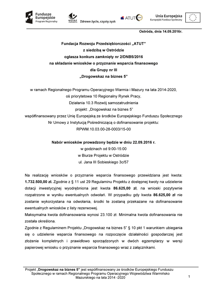 Ostróda, dnia 14.09.2016r. Fundacja Rozwoju Przedsiębiorczości „ATUT” z siedzibą w Ostródzie ogłasza konkurs zamknięty nr 2/DNB5/2016 na składanie wniosków o przyznanie wsparcia finansowego dla Grupy nr III „Drogowskaz na biznes 5” w ramach Regionalnego Programu Operacyjnego Warmia i Mazury na lata 2014-2020, oś priorytetowa 10 Regionalny Rynek Pracy, Działania 10.3 Rozwój samozatrudnienia projekt: „Drogowskaz na biznes 5” współfinansowany przez Unię Europejską ze środków Europejskiego Funduszu Społecznego Nr Umowy z Instytucją Pośredniczącą o dofinansowanie projektu: RPWM.10.03.00-28-0003/15-00 Nabór wniosków prowadzony będzie w dniu 22.09.2016 r. w godzinach od 9:00-15:00 w Biurze Projektu w Ostródzie ul. Jana III Sobieskiego 3c/57 Na realizację wniosków o przyznanie wsparcia finansowego przewidziana jest kwota: 1.732.500,00 zł. Zgodnie z § 11 ust 29 Regulaminu Projektu z dostępnej kwoty na udzielenie dotacji inwestycyjnej wyodrębniona jest kwota 86.625,00 zł, na wnioski pozytywnie rozpatrzone w wyniku ewentualnych odwołań. W przypadku gdy kwota 86.625,00 zł nie zostanie wykorzystana na odwołania, środki te zostaną przekazane na dofinansowanie ewentualnych wniosków z listy rezerwowej. Maksymalna kwota dofinansowania wynosi 23.100 zł. Minimalna kwota dofinansowania nie została określona. Zgodnie z Regulaminem Projektu „Drogowskaz na biznes 5” § 10 pkt 1 warunkiem ubiegania się o udzielenie wsparcia finansowego na rozpoczęcie działalności gospodarczej jest złożenie kompletnych i prawidłowo sporządzonych w dwóch egzemplarzy w wersji papierowej wniosku o przyznanie wsparcia finansowego wraz z załącznikami. Projekt „Drogowskaz na biznes 5” jest współfinansowany ze środków Europejskiego Funduszu Społecznego w ramach Regionalnego Programu Operacyjnego Województwa Warmińsko Mazurskiego na lata 2014 -2020 1 Uwaga! Należy wypełnić wszystkie rubryki biznesplanu. W przypadku, gdy któryś z jego punktów nie może być opisany należy wpisać „nie dotyczy” lub postawić kreskę. SPOSÓB PRZYGOTOWANIA KOMPLETU DOKUMENTÓW: Uczestnik Projektu zobowiązany jest do złożenia w terminie określonym w ogłoszeniu 2 kompletów dokumentów - każdy komplet w oddzielnym skoroszycie (oryginał i kopia potwierdzona za zgodność z oryginałem lub 2 oryginały). Wzory dokumentów znajdują się na stronie internetowej projektu www.dnb5.atut.org.pl w zakładce pliki do pobrania. NA 1 KOMPLET SKŁADA SIĘ: 1. Wniosek o przyznanie wsparcia finansowego – parafowany na każdej stronie i podpisany w wyznaczonym miejscu. Wszystkie wymagane pola wypełnione (zał.12 do regulaminu projektu), 2. Oświadczenia o odbyciu usługi szkoleniowej (zał. 12.1), 3. Biznes plan na okres 2 lat działalności przedsiębiorstwa. (zał.13 do regulaminu projektu) UWAGA! Każda strona musi być ponumerowana i parafowana. Należy wypełnić wszystkie rubryki/pola biznesplanu. W przypadku, gdy któryś z jego punktów nie może być opisany należy wpisać „nie dotyczy” lub postawić kreskę. Do wersji wydrukowanej należy dołączyć wersję elektroniczną biznes planu w formacie word na nośniku elektronicznym np. płycie CD 1 egzemplarz, wersja elektroniczna pliku excel stanowiącego załącznik pomocniczy do biznes planu – analiza finansowa, 4. Oświadczenia o niezaleganiu ze składkami na ubezpieczenie społeczne i zdrowotne (zał.12.2.), 5. Oświadczenia o niezaleganiu z uiszczaniem podatków (zał.12.3.), 6. Oświadczenia o niekaralności za przestępstwa przeciwko obrotowi gospodarczemu (zał.12.4.), 7. Oświadczenia o braku zobowiązań z tytułu zajęć sądowych i administracyjnych i nie toczeniu się przeciwko wnioskodawcy postępowania sądowego, egzekucyjnego lub windykacyjnego dotyczącego niespłaconych zobowiązań (zał.12.5.) 8. Oświadczenie o nieotrzymaniu, w roku kalendarzowym, w którym Uczestnik Projektu przystępuje do projektu oraz w poprzedzających go dwóch latach podatkowych, Projekt „Drogowskaz na biznes 5” jest współfinansowany ze środków Europejskiego Funduszu Społecznego w ramach Regionalnego Programu Operacyjnego Województwa Warmińsko Mazurskiego na lata 2014 -2020 2 pomocy de minimis z rożnych źródeł i w rożnych formach, której wartość brutto łącznie z pomocą, o którą się ubiega, przekracza równowartość w złotych kwoty 200 000,00 euro, a w przypadku podmiotu prowadzącego działalność w sektorze transportu drogowego – równowartość w złotych kwoty 100 000, 00 euro, obliczonych według średniego kursu Narodowego Banku Polskiego obowiązującego w dniu udzielenia pomocy (zał.15 do regulaminu projektu) lub 9. Oświadczenia o wysokości otrzymanej pomocy de minimis w roku podatkowym, w którym Uczestnik Projektu pomocy przystępuje do projektu oraz w poprzedzających go dwóch latach podatkowych wraz z potwierdzonymi za zgodność z oryginałem kopiami zaświadczeń o pomocy de minimis, wystawionymi przez podmioty udzielające pomocy (zał.16 do regulaminu projektu); 10. Oświadczenie o nieotrzymaniu innej pomocy dotyczącej tych samych kosztów kwalifikowalnych lub tego samego projektu na realizację, którego udzielana jest pomoc de minimis (zał.17 do regulaminu projektu). 11. Formularz informacji przedstawianych przy ubieganiu się o pomoc de minimis (zał.18 do regulaminu projektu), 12. Oświadczenie o kwalifikowalności VAT (zał.12.6), 13. Oferty potwierdzające cenę zakupów zaplanowanych w części D-1 biznes planu (przynajmniej jedna oferta do każdego zakupu), 14. Inne dokumenty stanowiące uzupełnienie biznes planu, niezbędne do prawidłowej jego oceny (kopie potwierdzone za zgodność z oryginałem) np.: a) oświadczenie o zatrudnieniu pracownika na umowę o pracę – obowiązkowe dla osób, które w formularzu rekrutacyjnym zadeklarowały zatrudnienie pracownika (zał.12.7), b) prawo jazdy w przypadku zakupu samochodu, c) akt własności lokalu lub umow