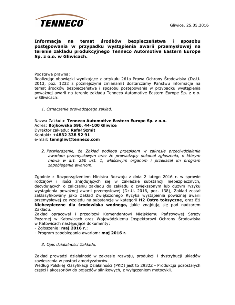 Gliwice, 25.05.2016 Informacja na temat środków bezpieczeństwa i sposobu postępowania w przypadku wystąpienia awarii przemysłowej na terenie zakładu produkcyjnego Tenneco Automotive Eastern Europe Sp. z o.o. w Gliwicach. Podstawa prawna: Realizując obowiązki wynikające z artykułu 261a Prawa Ochrony Środowiska (Dz.U. 2013, poz. 1232 z późniejszymi zmianami) dostarczamy Państwu informacje na temat środków bezpieczeństwa i sposobu postępowania w przypadku wystąpienia poważnej awarii na terenie zakładu Tenneco Automotive Eastern Europe Sp. z o.o. w Gliwicach: 1. Oznaczenie prowadzącego zakład. Nazwa Zakładu: Tenneco Automotive Eastern Europe Sp. z o.o. Adres: Bojkowska 59b, 44-100 Gliwice Dyrektor zakładu: Rafał Szmit Kontakt: +4832 338 52 91 e-mail: [email protected] 2. Potwierdzenie, że Zakład podlega przepisom w zakresie przeciwdziałania awariom przemysłowym oraz że prowadzący dokonał zgłoszenia, o którym mowa w art. 250 ust. 1, właściwym organom i przekazał im program zapobiegania awariom. Zgodnie z Rozporządzeniem Ministra Rozwoju z dnia 2 lutego 2016 r. w sprawie rodzajów i ilości znajdujących się w zakładzie substancji niebezpiecznych, decydujących o zaliczeniu zakładu do zakładu o zwiększonym lub dużym ryzyku wystąpienia poważnej awarii przemysłowej (Dz.U. 2016, poz. 138), Zakład został zaklasyfikowany jako Zakład Zwiększonego Ryzyka wystąpienia poważnej awarii przemysłowej ze względu na substancje w kategorii H2 Ostro toksyczne, oraz E1 Niebezpieczne dla środowiska wodnego, jakie znajdują się pod nadzorem Zakładu. Zakład opracował i przedłożył Komendantowi Miejskiemu Państwowej Straży Pożarnej w Katowicach oraz Wojewódzkiemu Inspektorowi Ochrony Środowiska w Katowicach następujące dokumenty: - Zgłoszenie: maj 2016 r.; - Program zapobiegania awariom: maj 2016 r. 3. Opis działalności Zakładu. Zakład prowadzi działalność w zakresie rozwoju, produkcji i dystrybucji układów zawieszenia w postaci amortyzatorów. Według Polskiej Klasyfikacji Działalności (PKD) jest to 2932Z - Produkcja pozostałych części i akcesoriów do pojazdów silnikowych, z wyłączeniem motocykli. 4. Charakterystyka składowanych substancji niebezpiecznych decydujących o zaliczeniu zakładu do zakładu o zwiększonym ryzyku lub zakładu o dużym ryzyku, z uwzględnieniem ich nazw lub kategorii oraz zagrożeń, jakie powodują Pod nadzorem Zakładu znajduje się kwas chromowy, który decyduje o zaliczeniu Zakładu do grupy Zakładów Zwiększonego Ryzyka wystąpienia awarii przemysłowej. Zagrożenia jakie powoduje opisuje się następująco: H301 H310 H314 H317 H330 H334 - Działa toksycznie po połknięciu; - Grozi śmiercią w kontakcie ze skórą; - Powoduje poważne oparzenia skóry oraz uszkodzenia oczu; - Może powodować reakcję alergiczną skóry; – Wdychanie grozi śmiercią; - Może powodować objawy alergii lub astmy lub trudności w oddychaniu w następstwie wdychania; H336 – Może powodować senność i zawroty głowy; H340 - Może powodować wady genetyczne; H350 - Może powodować raka; H361 - Podejrzewa się, że działa szkodliwie na płodność lub na dziecko w łonie matki; H372 - Powoduje uszkodzenie narządów poprzez długotrwałe lub wielokrotne narażenie; H410 - Działa bardzo toksycznie na organizmy wodne, powodując długotrwałe skutki. 5. Informacje dotyczące sposobów ostrzegania i postępowania społeczeństwa w przypadku wystąpienia awarii przemysłowej, uzgodnione z właściwymi organami Państwowej Straży Pożarnej. Prowadzący Zakład o zwiększonym ryzyku wystąpienia poważnej awarii przemysłowej opracował i wdrożył system zarządzania bezpieczeństwem, gwarantujący odpowiedni do zagrożeń poziom ochrony ludzi i środowiska, który stanowi element ogólnego systemu zarządzania Zakładem. W przypadku wystąpienia awarii przemysłowej, zakładowe służby ratownicze, w pierwszej kolejności podejmą działania ratownicze, a następnie alarmują zewnętrzne służby: Komendę Miejską Państwowej Straży Pożarnej w Gliwicach, Wojewódzki Inspektorat Ochrony Środowiska oraz inne niezbędne w zakresie likwidacji awarii jednostki. Opracował: Przemysław Kasperczyk – Inżynier ds. ochrony środowiska, maj 2016r.