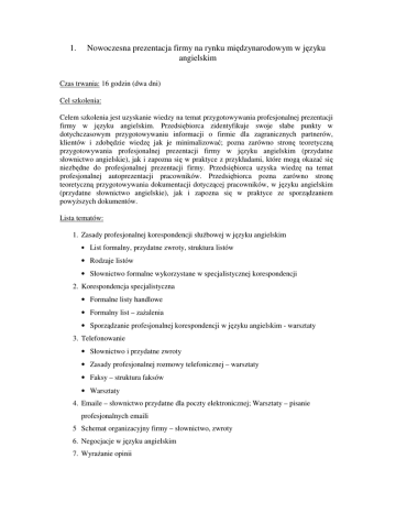1. Nowoczesna prezentacja firmy na rynku międzynarodowym w języku angielskim Czas trwania: 16 godzin (dwa dni) Cel szkolenia: Celem szkolenia jest uzyskanie wiedzy na temat przygotowywania profesjonalnej prezentacji firmy w języku angielskim. Przedsiębiorca zidentyfikuje swoje słabe punkty w dotychczasowym przygotowywaniu informacji o firmie dla zagranicznych partnerów, klientów i zdobędzie wiedzę jak je minimalizować; pozna zarówno stronę teoretyczną przygotowywania profesjonalnej prezentacji firmy w języku angielskim (przydatne słownictwo angielskie), jak i zapozna się w praktyce z przykładami, które mogą okazać się niezbędne do profesjonalnej prezentacji firmy. Przedsiębiorca uzyska wiedzę na temat profesjonalnej autoprezentacji pracowników. Przedsiębiorca pozna zarówno stronę teoretyczną przygotowywania dokumentacji dotyczącej pracowników, w języku angielskim (przydatne słownictwo angielskie), jak i zapozna się w praktyce ze sporządzaniem powyższych dokumentów. Lista tematów: 1. Zasady profesjonalnej korespondencji służbowej w języku angielskim • List formalny, przydatne zwroty, struktura listów • Rodzaje listów • Słownictwo formalne wykorzystane w specjalistycznej korespondencji 2. Korespondencja specjalistyczna • Formalne listy handlowe • Formalny list – zażalenia • Sporządzanie profesjonalnej korespondencji w języku angielskim - warsztaty 3. Telefonowanie • Słownictwo i przydatne zwroty • Zasady profesjonalnej rozmowy telefonicznej – warsztaty • Faksy – struktura faksów • Warsztaty 4. Emaile – słownictwo przydatne dla poczty elektronicznej; Warsztaty – pisanie profesjonalnych emaili 5 Schemat organizacyjny firmy – słownictwo, zwroty 6. Negocjacje w języku angielskim 7. Wyrażanie opinii • Słownictwo • Spotkania i zebrania 8. Warsztaty – korespondencja biznesowa w języku angielskim