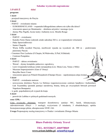 Szkolne wycieczki zagraniczne 3.PARYŻ 6dni program: 1 dzień – przejazd tranzytowy do Paryża 2 dzień – PARYŻ – zwiedzanie miasta: – EURODISNEYLAND – wspaniała kilkugodzinna zabawa nie tylko dla dzieci! – wieczorem spacer po Montmartre – dzielnica artystów i nocnego życia – słynny Plac Pigalle, liczne teatry i kabarety m.in. Moulin Rouge 3 dzień – PARYŻ – zwiedzanie: – Katedra Notre Dame (zabytek sztuki sakralnej XII w. ze wspaniałymi witrażami) – Pałac Sprawiedliwości – Sainte Chapelle – Wieża Eiffla (symbol Paryża), możliwość wjazdu na wysokość ok. 300 m – podziwianie panoramy Paryża – Cmentarz Pere Lachaise (F.Chopin, M.Walewska, E.Piaf, H.Balzak) – Centrum Pompidou 4 dzień – PARYŻ – dalsze zwiedzanie: – Wersal – słynny kompleks pałacowo–ogrodowy, – Luwr (wspaniała kolekcja sztuki europejskiej m.in. Mona Liza, Venus z Milo) – Muzeum Impresjonistów (Gare d’ Orsay) – Bazylika Sacre Couer – wieczorem spacer po Polach Elizejskich (Champs Elyses – najsłynniejsza aleja świata) 5 dzień – PARYŻ – zwiedzanie metrem: – nowoczesna dzielnica Paryża La Defense (supernowoczesne centrum handlowe i kulturalne), Łuk Tryumfalny (pomnik pamięci narodowej, brama, którą po zwycięskich bitwach powracał Napoleon Bonaparte) – w godz. popołudniowych wyjazd do kraju 6 dzień – powrót do Lublina w późnych godzinach nocnych. cena 1250,– Cena wycieczki obejmuje: transport (komfortowy autokar: WC, barek, klimatyzacja), zakwaterowanie (Paryż – 3 noclegi), wyżywienie (3 śniadania, 3 obiadokolacje), opieka licencjonowanego pilota, ubezpieczenie NNW i KL Uwaga Proponujemy nocleg tranzytowy w Pradze i zwiedzanie Złotego Miasta ------------------------------------------------------------------------------------------------------------------------ Biuro Podróży Orienty Travel TEL. 815328637, 606978069 www.orient.lublin.pl, [email protected]