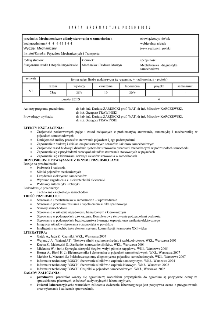 KARTA INFORMACYJNA PRZEDMIOTU przedmiot: Mechatroniczne uk ady sterowania w samochodach kod przedmiotu: 4-M-M-1-10-S-6-6 Wydzia : Mechaniczny Instytut/Katedra: Pojazdów Mechanicznych i Transportu obowi zkowy: nie/tak wybieralny: nie/tak zyk realizacji: polski rodzaj studiów: Stacjonarne studia I stopnia in ynierskie specjalno : Mechatronika i diagnostyka samochodowa semestr VI kierunek: Mechanika i Budowa Maszyn forma zaj , liczba godzin/rygor (x -egzamin, + - zaliczenia, # - projekt) razem wyk ady wiczenia laboratoria projekt seminarium 75/x 35/x 10 30/+ - - punkty ECTS Autorzy programu przedmiotu: Prowadz cy wyk ady: 4 dr hab. in . Dariusz ARDECKI prof. WAT, dr in . Miros aw KARCZEWSKI, dr in . Grzegorz TRAWI SKI dr hab. in . Dariusz ARDECKI prof. WAT, dr in . Miros aw KARCZEWSKI, dr in . Grzegorz TRAWI SKI EFEKTY KSZTA CENIA: Znajomo podstawowych poj i zasad zwi zanych z problematyk sterowania, automatyk i mechatronik w pojazdach samochodowych Umiej tno analizy procesów sterowania pojazdem i jego podzespo ami Zapoznanie z budow i dzia aniem podstawowych sensorów i aktorów samochodowych Znajomo zasad budowy i dzia ania systemów sterowania procesami zachodz cymi w podzespo ach samochodu Zapoznanie si z przyk adami rozwi za uk adów sterowania stosowanych w pojazdach Zapoznanie si z kierunkami rozwoju uk adów sterowania w samochodach BEZPO REDNIE POWI ZANIE Z INNYMI PRZEDMIOTAMI: Bazuje na przedmiotach: Podwozia i nadwozia Silniki pojazdów mechanicznych Urz dzenia elektryczne samochodów Wybrane zagadnienia z elektrotechniki elektroniki Podstawy automatyki i robotyki Podbudowuje przedmioty: Techniczna eksploatacja samochodów TRE PRZEDMIOTU: Sterowanie i mechatronika w samochodzie – wprowadzenie Sterowanie procesami zasilania i nape nieniem silnika spalinowego Sensory samochodowe Sterowanie w uk adzie nap dowym, hamulcowym i kierowniczym Sterowanie w podzespo ach zawieszenia. Kompleksowe sterowanie podzespo ami podwozia Sterowanie w podzespo ach bezpiecze stwa biernego, osprz tu oraz zasilania elektrycznego Integracja uk adów sterowania i diagnostyki w poje dzie Inteligentny samochód jako element systemu komunikacji i transportu XXI wieku LITERATURA: Gajek A., Juda Z.: Czujniki. WK , Warszawa 2007 Wajand J.A., Wajand J.T.: T okowe silniki spalinowe rednio i szybkoobrotowe. WK , Warszawa 2005 Kneba Z., Makowski S.: Zasilanie i sterowanie silników. WK , Warszawa 2004 Micknass W. i inni.: Sprz a, skrzynki biegów, wa y i pó osie nap dowe. WK , Warszawa 2005 Herner A., Riehl H. J.: Elektrotechnika i elektronika w pojazdach samochodowych. WK , Warszawa 2007 Merkisz J., Mazurek S.: Pok adowe systemy diagnostyczne pojazdów samochodowych. WK , Warszawa 2007 Informator techniczny BOSCH. Sterowanie silników o zap onie samoczynnym. WK , Warszawa 2004 Informator techniczny BOSCH. Sterowanie silników o zap onie iskrowym. WK , Warszawa 2002 Informator techniczny BOSCH. Czujniki w pojazdach samochodowych. WK , Warszawa 2002 ZASADY ZALICZANIA: przedmiotu: przedmiot ko czy si egzaminem; warunkiem przyst pienia do egzaminu s pozytywne oceny ze sprawdzianów pisemnych, z wicze audytoryjnych i laboratoryjnych, wicze laboratoryjnych: warunkiem zaliczenia wiczenia laboratoryjnego jest pozytywna ocena z przygotowania oraz wykonanie i zaliczenie sprawozdania.