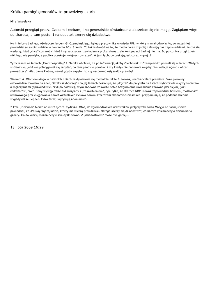 Krótka pamięć generałów to prawdziwy skarb Mira Wszelaka Autorski przegląd prasy. Czekam i czekam, i na generalskie oświadczenia doczekać się nie mogę. Zaglądam więc do skarbca, a tam pusto. I na dodatek szerzy się dziadostwo. No i nie było żadnego oświadczenia gen. G. Czempińskiego, byłego pracownika wywiadu PRL, w którym miał odwołać to, co wcześniej powiedział (o swoim udziale w tworzeniu PO). Szkoda. To także dowód na to, że media coraz częściej zalewają nas zapowiedziami, że coś się wydarzy, ktoś „chce” coś zrobić, ktoś inny zaprzecza i zawiadamia prokuraturę…. ale kontynuacji żadnej nie ma. Bo po co. Na drugi dzień nikt tego nie pamięta, a publika oczekuje kolejnych „wrażeń”. A jeśli tych, co czekają jest coraz więcej…? Tymczasem na łamach „Rzeczpospolitej” P. Semka ubolewa, że po informacji jakoby Olechowski z Czempińskim poznali się w latach 70-tych w Genewie, „nikt nie pofatygował się zapytać, co tam panowie porabiali i czy kiedyś nie panowała między nimi relacja agent – oficer prowadzący”. Ależ panie Piotrze, nawet gdyby zapytał, to czy na pewno usłyszałby prawdę? Wzorem A. Olechowskiego w ostatnich dniach zaktywizował się medialnie także S. Nowak, szef kancelarii premiera. Jako pierwszy odpowiedział bowiem na apel „Gazety Wyborczej” i na jej łamach deklaruje, że „dojrzał” do parytetu na listach wyborczych między kobietami a mężczyznami (sprawiedliwie, czyli po połowie), czym zapewne zaskarbił sobie bezgraniczne uwielbienie zarówno płci pięknej jak i redaktorów „GW”. Inny występ także był związany z „zaskarbieniem”, tyle tylko, że skarbca NBP. Nowak zapowiedział bowiem „możliwość” ustawowego przeksięgowania nawet wirtualnych zysków banku. Przerażeni ekonomiści nieśmiało przypominają, że podobne brednie wygadywał A. Lepper. Tylko teraz, krytykują anonimowo. Z kolei „Dziennik” bierze na ruszt ojca T. Rydzyka. Otóż, do zgromadzonych uczestników pielgrzymki Radia Maryja na Jasnej Górze powiedział, że „Polską rządzą ludzie, którzy nie wierzą prawdziwie, dlatego szerzy się dziadostwo”, co bardzo zniesmaczyło dziennikarki gazety. Co do wiary, można oczywiście dyskutować. Z „dziadostwem” może być gorzej… 13 lipca 2009 16:29