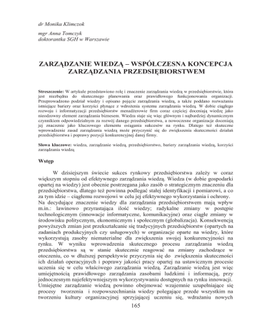 dr Monika Klimczok mgr Anna Tomczyk doktorantka SGH w Warszawie ZARZĄDZANIE WIEDZĄ – WSPÓŁCZESNA KONCEPCJA ZARZĄDZANIA PRZEDSIĘBIORSTWEM Streszczenie: W artykule przedstawiono rolę i znaczenie zarządzania wiedzą w przedsiębiorstwie, która jest niezbędna do skutecznego planowania oraz prawidłowego funkcjonowania organizacji. Przeprowadzono podział wiedzy i opisano pojęcie zarządzania wiedzą, a także poddano rozważaniu istniejące bariery oraz korzyści płynące z wdrożenia systemu zarządzania wiedzą. W dobie ciągłego rozwoju i informatyzacji przedsiębiorstw menadżerowie firm coraz częściej doceniają wiedzę jako nieodzowny element zarządzania biznesem. Wiedza staje się więc głównym i najbardziej dynamicznym czynnikiem odpowiedzialnym za rozwój danego przedsiębiorstwa, a nowoczesne organizacje doceniają jej znaczenie jako kluczowego elementu osiągania sukcesów na rynku. Dlatego też skuteczne wprowadzenie zasad zarządzania wiedzą może przyczynić się do zwiększenia skuteczności działań przedsiębiorstwa i poprawy pozycji konkurencyjnej danej firmy. Słowa kluczowe: wiedza, zarządzanie wiedzą, przedsiębiorstwo, bariery zarządzania wiedzą, korzyści zarządzania wiedzą Wstęp W dzisiejszym świecie sukces rynkowy przedsiębiorstwa zależy w coraz większym stopniu od efektywnego zarządzania wiedzą. Wiedza (w dobie gospodarki opartej na wiedzy) jest obecnie postrzegana jako zasób o strategicznym znaczeniu dla przedsiębiorstwa, dlatego też powinna podlegać stałej identyfikacji i pomiarowi, a co za tym idzie – ciągłemu rozwojowi w celu jej efektywnego wykorzystania i ochrony. Na decydujące znaczenie wiedzy dla zarządzania przedsiębiorstwem mają wpływ m.in.: lawinowo przyrastająca ilość wiedzy; radykalne zmiany w postępie technologicznym (innowacje informatyczne, komunikacyjne) oraz ciągłe zmiany w środowisku politycznym, ekonomicznym i społecznym (globalizacja). Konsekwencją powyższych zmian jest przekształcanie się tradycyjnych przedsiębiorstw (opartych na zadaniach produkcyjnych czy usługowych) w organizacje oparte na wiedzy, które wykorzystują zasoby niematerialne dla zwiększenia swojej konkurencyjności na rynku. W wyniku wprowadzenia skutecznego procesu zarządzania wiedzą przedsiębiorstwa są w stanie skutecznie reagować na zmiany zachodzące w otoczeniu, co w dłuższej perspektywie przyczynia się do zwiększenia skuteczności ich działań operacyjnych i poprawy jakości pracy opartej na ustawicznym procesie uczenia się w celu właściwego zarządzania wiedzą. Zarządzanie wiedzą jest więc umiejętnością prawidłowego zarządzania zasobami ludzkimi i informacją, przy jednoczesnym najefektywniejszym wykorzystywaniu dostępnych na rynku innowacji. Umiejętne zarządzanie wiedzą powinno obejmować wzajemnie uzupełniające się procesy tworzenia i rozpowszechniania wiedzy polegające przede wszystkim na tworzeniu kultury organizacyjnej sprzyjającej uczeniu się, wdrażaniu nowych 165 technologii, usprawnianiu istniejących procesów i traktowaniu zasobów ludzkich jako najważniejszego zasobu przedsiębiorstwa. Wdrażanie koncepcji zarządzania wiedzą jest więc warunkiem koniecznym dla prawidłowego funkcjonowania przedsiębiorstwa, przy założeniu, że wiedza jako zasób powinna być dostępna dla określonych pracowników we właściwym czasie. Należy więc podkreślić, że koncepcja zarządzania wiedzą jest oparta na bazie szeregu inicjatyw związanych z zarządzaniem jakością i systemowego podejścia do procesu zarządzania wiedzą, który rozpoczyna się od ustalenia strategii firmy, identyfikacji problemów i potrzeb organizacji, a kończy na kontroli uzyskiwanych wyników. 1. Definicja wiedzy Wiedza jest definicją składającą się z kilku elementów, do których zaliczamy informację, posiadane dane oraz możność ich logicznego wykorzystywania. Należy przy tym podkreślić, iż dane i związane z nimi informacje stanowią budulec, w oparciu o który człowiek jest w stanie wygenerować wartość dodaną dla każdego przedsiębiorstwa. W celu poznania procesu zarządzania wiedzą w organizacji należy zatem uściślić i zdefiniować elementy, które tworzą pojęcie zarządzania wiedzą, takie jak informacja, wiedza i kapitał intelektualny, a także określić relacje pomiędzy nimi. Według M. Bratnickiego informacja jest takim odzwierciedleniem rzeczywistości, które wywołuje zmianę zachowania odbiorcy317. Powstaje ona z danych i powoduje modyfikację posiadanych zasobów wiedzy. Pojęcia informacji i wiedzy bywają często stosowane zamiennie, dlatego należy podkreślić, że wiedza powstaje w określonym kontekście organizacyjnym i jest specyficzna dla konkretnego przedsiębiorstwa. Informacja stanowi strumień wiadomości, podczas gdy wiedza jest jej wytworem, zakorzenionym w przekonaniach i oczekiwaniach odbiorcy. Wiedza jest w takim ujęciu powiązana z ludzkim działaniem318. Wiedza ma najczęściej charakter jakościowy, natomiast dane i informacje mają zazwyczaj wymiar ilościowy i formalny. Obok wymiaru jakościowego do cech wiedzy zaliczymy również takie elementy takie, jak: dominacja, która oznacza nadrzędną rolę wiedzy w stosunku do wszelkich pozostałych zasobów, niewyczerpalność (wartość wiedzy rośnie w miarę częstszego wykorzystywania), także symultaniczność, oznaczająca, że wiedza może być wykorzystywana przez wiele osób w różnych miejscach jednocześnie. Wielowymiarowość wiedzy i jej ogromne znaczenie w życiu przedsiębiorstwa znalazły odzwierciedlenie w próbach stworzenia systemu zarządzania nią. U podstaw teorii organizacji opartej na wiedzy leży jej podział na cztery podstawowe kategorie319: • know-what (wiedzieć co) – zasoby odnoszące się do faktów i przybierające postać 317 M. Bratnicki, Informacyjne przesłanki przedsiębiorczości, [w:] R. Borowiecki, M. Romanowska (red.), System informacji str