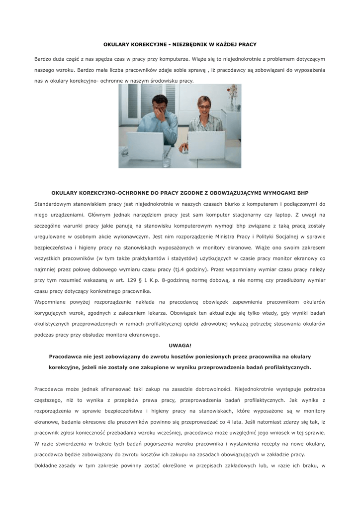OKULARY KOREKCYJNE - NIEZBĘDNIK W KAŻDEJ PRACY Bardzo duża część z nas spędza czas w pracy przy komputerze. Wiąże się to niejednokrotnie z problemem dotyczącym naszego wzroku. Bardzo mała liczba pracowników zdaje sobie sprawę , iż pracodawcy są zobowiązani do wyposażenia nas w okulary korekcyjno- ochronne w naszym środowisku pracy. OKULARY KOREKCYJNO-OCHRONNE DO PRACY ZGODNE Z OBOWIĄZUJĄCYMI WYMOGAMI BHP Standardowym stanowiskiem pracy jest niejednokrotnie w naszych czasach biurko z komputerem i podłączonymi do niego urządzeniami. Głównym jednak narzędziem pracy jest sam komputer stacjonarny czy laptop. Z uwagi na szczególne warunki pracy jakie panują na stanowisku komputerowym wymogi bhp związane z taką pracą zostały uregulowane w osobnym akcie wykonawczym. Jest nim rozporządzenie Ministra Pracy i Polityki Socjalnej w sprawie bezpieczeństwa i higieny pracy na stanowiskach wyposażonych w monitory ekranowe. Wiąże ono swoim zakresem wszystkich pracowników (w tym także praktykantów i stażystów) użytkujących w czasie pracy monitor ekranowy co najmniej przez połowę dobowego wymiaru czasu pracy (tj.4 godziny). Przez wspomniany wymiar czasu pracy należy przy tym rozumieć wskazaną w art. 129 § 1 K.p. 8-godzinną normę dobową, a nie normę czy przedłużony wymiar czasu pracy dotyczący konkretnego pracownika. Wspomniane powyżej rozporządzenie nakłada na pracodawcę obowiązek zapewnienia pracownikom okularów korygujących wzrok, zgodnych z zaleceniem lekarza. Obowiązek ten aktualizuje się tylko wtedy, gdy wyniki badań okulistycznych przeprowadzonych w ramach profilaktycznej opieki zdrowotnej wykażą potrzebę stosowania okularów podczas pracy przy obsłudze monitora ekranowego. UWAGA! Pracodawca nie jest zobowiązany do zwrotu kosztów poniesionych przez pracownika na okulary korekcyjne, jeżeli nie zostały one zakupione w wyniku przeprowadzenia badań profilaktycznych. Pracodawca może jednak sfinansować taki zakup na zasadzie dobrowolności. Niejednokrotnie występuje potrzeba częstszego, niż to wynika z przepisów prawa pracy, przeprowadzenia badań profilaktycznych. Jak wynika z rozporządzenia w sprawie bezpieczeństwa i higieny pracy na stanowiskach, które wyposażone są w monitory ekranowe, badania okresowe dla pracowników powinno się przeprowadzać co 4 lata. Jeśli natomiast zdarzy się tak, iż pracownik zgłosi konieczność przebadania wzroku wcześniej, pracodawca może uwzględnić jego wniosek w tej sprawie. W razie stwierdzenia w trakcie tych badań pogorszenia wzroku pracownika i wystawienia recepty na nowe okulary, pracodawca będzie zobowiązany do zwrotu kosztów ich zakupu na zasadach obowiązujących w zakładzie pracy. Dokładne zasady w tym zakresie powinny zostać określone w przepisach zakładowych lub, w razie ich braku, w zarządzeniu pracodawcy. W szczególności od uregulowań wewnątrzzakładowych lub indywidualnej decyzji pracodawcy zależy wysokość dofinansowania. Powinno ono obejmować koszt szkieł, standardowych oprawek i robocizny. Pracodawca może przy tym zastosować korzystniejsze rozwiązania i postanowić, że refundacja będzie obejmowała np. koszt oprawek, niezależnie od tego, czy będą one powyżej standardu. Postępowanie w sprawie przyznania dofinansowania zależy od regulacji zakładowych lub przyjętego w firmie zwyczaju. Na ogół pracownik występuje w tej sprawie z wnioskiem do pracodawcy, dołączając fakturę zakupu okularów. Podstawa prawna: • • ustawa z dnia 26.06.1974 r. – Kodeks pracy (Dz. U. z 1998 r. nr 21, poz. 94 ze zm.), rozporządzenie Ministra Pracy i Polityki Socjalnej z dnia 1.12.1998 r. w sprawie bezpieczeństwa i higieny pracy na stanowiskach wyposażonych w monitory ekranowe (Dz. U. nr 148, poz. 973). Okulary korekcyjno-ochronne do kupienia tutaj Źródło: http://praca.interia.pl/news-okulary-korekcyjne-waznym-narzedziem-pracy,nId,721786