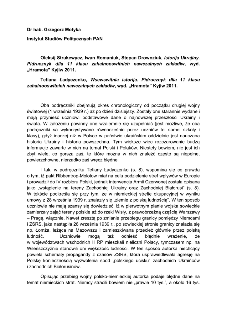 Dr hab. Grzegorz Motyka Instytut Studiów Politycznych PAN Ołeksij Strukewycz, Iwan Romaniuk, Stepan Drowoziuk, Istorija Ukrajiny. Pidrucznyk dlia 11 kłasu zahalnooswitnich nawczalnych zakładiw, wyd. „Hramota” Kyjiw 2011. Tetiana Ładyczenko, Wsewswitnia istorija. Pidrucznyk dlia 11 kłasu zahalnooswitnich nawczalnych zakładiw, wyd. „Hramota” Kyjiw 2011. Oba podręczniki obejmują okres chronologiczny od początku drugiej wojny światowej (1 września 1939 r.) aż po dzień dzisiejszy. Zostały one starannie wydane i mają przynieść uczniowi podstawowe dane o najnowszej przeszłości Ukrainy i świata. W założeniu powinny one wzajemnie się uzupełniać (jest możliwe, że oba podręczniki są wykorzystywane równocześnie przez uczniów tej samej szkoły i klasy), gdyż inaczej niż w Polsce w państwie ukraińskim oddzielnie jest nauczana historia Ukrainy i historia powszechna. Tym większe więc rozczarowanie budzą informacje zawarte w nich na temat Polski i Polaków. Niestety bowiem, nie jest ich zbyt wiele, co gorsza zaś, te które można w nich znaleźć często są niepełne, powierzchowne, nierzadko zaś wręcz błędne. I tak, w podręczniku Tetiany Ładyczenko (s. 8), wspomina się co prawda o tym, iż pakt Ribbentrop-Mołotow miał na celu podzielenie stref wpływów w Europie i prowadził do IV rozbioru Polski, jednak interwencja Armii Czerwonej została opisana jako „wstąpienie na tereny Zachodniej Ukrainy oraz Zachodniej Białorusi” (s. 8). W tekście podkreśla się przy tym, że w niemieckiej strefie okupacyjnej w wyniku umowy z 28 września 1939 r. znalazły się „ziemie z polską ludnością”. W ten sposób uczniowie nie mają szansy się dowiedzieć, iż w pierwotnym planie wojska sowieckie zamierzały zająć tereny polskie aż do rzeki Wisły, z prawobrzeżną częścią Warszawy – Pragą, włącznie. Nawet zresztą po zmianie przebiegu granicy pomiędzy Niemcami i ZSRS, jaka nastąpiła 28 września 1939 r., po sowieckiej stronie granicy znalazła się np. Łomża, leżąca na Mazowszu i zamieszkiwana przecież głównie przez polską ludność. Uczniowie mogą też odnieść błędnie wrażenie, że w województwach wschodnich II RP mieszkali nieliczni Polacy, tymczasem np. na Wileńszczyźnie stanowili oni większość ludności. W ten sposób autorka niechcący powiela schematy propagandy z czasów ZSRS, która usprawiedliwiała agresję na Polskę koniecznością wyzwolenia spod „polskiego ucisku” zachodnich Ukraińców i zachodnich Białorusinów. Opisując przebieg wojny polsko-niemieckiej autorka podaje błędne dane na temat niemieckich strat. Niemcy stracili bowiem nie „prawie 10 tys.”, a około 16 tys. zabitych. Pomyłkowo też napisano, iż do sowieckiej strefy wpływów weszło „51, 4% terytorium Litwy”. Niedosyt budzi opis sytuacji Polaków pod niemiecką okupacją. Autorka praktycznie ogranicza się tu do informacji, że „Polska została przekształcona w niemieckie Generalne Gubernatorstwo” (s. 26). Tymczasem część ziem polskich (Śląsk, Wielkopolska, Pomorze, Łódź) została bezpośrednio włączona do Rzeszy. Brak też informacji o represjach jakie w latach 1939-1941 dotknęły Polaków – Niemcy rozstrzelali w tym czasie kilkadziesiąt tysięcy osób, a kilkaset tysięcy deportowali z ziem włączonych do Rzeszy do GG. Jest to o tyle ważne, iż represje te zapowiadały późniejsze masowe zbrodnie popełniane przez nazistów po uderzeniu na ZSRS. Brakuje także choćby krótkiej informacji o wymordowaniu przez ZSRS tysięcy polskich oficerów w Katyniu. Dość pobieżnie została omówiona kwestia Holocaustu, czemu co gorsza towarzyszą różne pomyłki. Wbrew temu co możemy przeczytać na s. 27 w obozie Auschwitz (Oświęcim) nie zginęło ponad 4 mln osób, lecz około 1 mln. Zawyżona jest też liczba ofiar obozu na Majdanku (w tekście na s. 27 jest mowa o 1,5 mln ofiar), a nawet osób rozstrzelanych w Babim Jarze. Brakuje też nazw innych ważnych „fabryk śmierci”: w Bełżcu, Sobiborze, Chełmie nad Nerem (wymieniono natomiast słusznie Treblinkę), których znaczenie w procesie eksterminacji ludności żydowskiej było ważniejsze niż wymienionych w tekście obozów koncentracyjnych w Dachau czy Mauthausen. W podręczniku słusznie zwraca się uwagę, że antyniemiecki ruch oporu w Polsce nabrał „wielkiego rozmachu” (s. 28), w czym była wielka zasługa cieszącej się dużym szacunkiem ludności Armii Krajowej. Jednak, zapewne ponownie bezwiednie powielając sztance myślowe wytworzone przed 1989 r., działaniom AK jest zaraz przeciwstawiona ciesząca się jakoby podobnym poparciem Armia Ludowa. Tymczasem faktycznie cieszyła się ona znikomym poparciem społecznym i w stosunku do kilkusettysięcznej AK była też niewielka liczebnie – silniejsze od GL-AL były nawet inne ugrupowania partyjne takie jak Bataliony Chłopskie czy Narodowe Siły Zbrojne. GL-AL była też, co najważniejsze, całkowicie uzależniona od Związku Sowieckiego i w swoich działaniach orientowała się przede wszystkim na interesy Kremla. Inaczej niż to przyjmuje autorka na s. 38, w polskiej historiografii za początek wyzwolenia Polski spod okupacji niemieckiej uznaje się przekroczenie przedwojennej wschodniej granicy II RP, co nastąpiło w styczniu 1944 r. W lipcu 1944 r. front dotarł zaś na ziemie współczesnej Polski. W podręczniku, co warto zaznaczyć, została natomiast pokrótce omówiona tragedia Powstania Warszawskiego – autorka wspomina tu między innymi o zatrzymaniu ofensywy sowieckiej aż do jego upadku (s. 38). Zdziwienie budzi brak jakiejkolwiek informacji o konferencji Wielkiej Trójki w Teheranie. Z kolei pisząc o ustaleniach konferencji w Jałcie w podręczniku napisano zdawkowo, że „problem granic pomiędzy Polską i ZSRS był w ogólnych zarysach rozwiązany” jeszcze przed jej rozpoczęciem, ale gdzie się to stało i jaki kształt przybrała nowa granica już powied