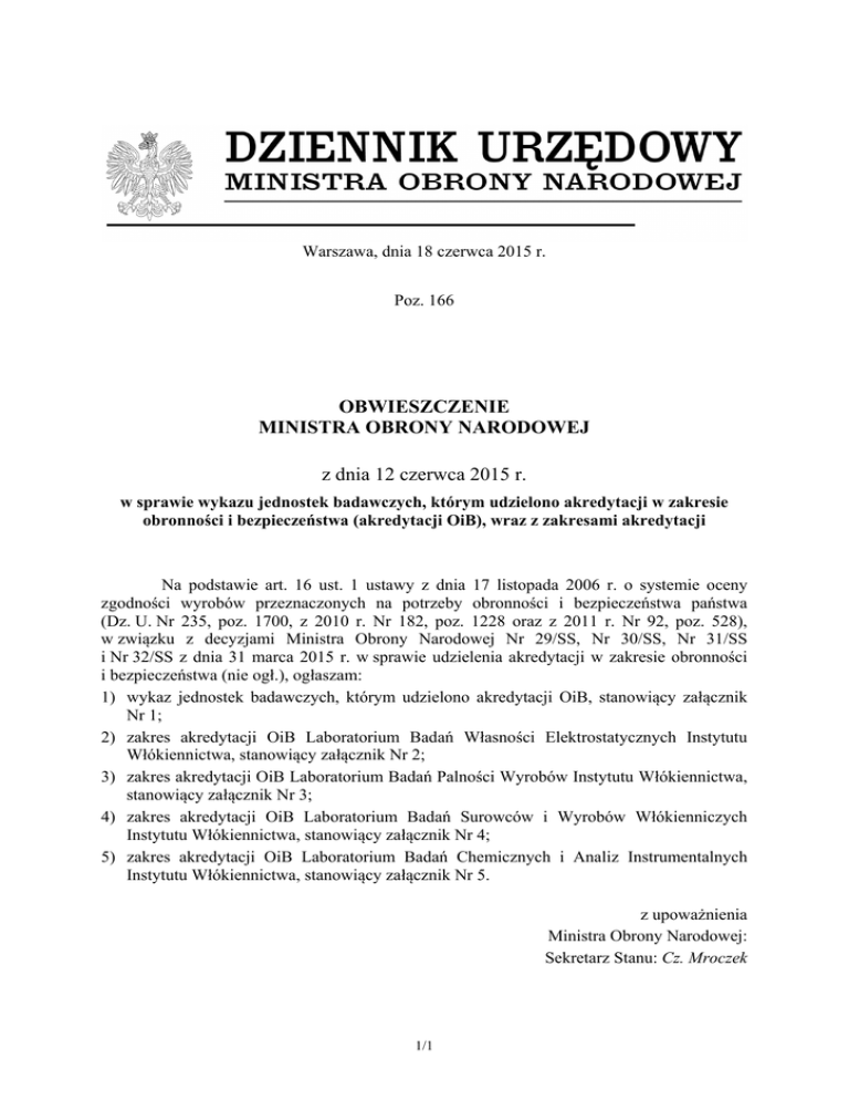 Warszawa, dnia 18 czerwca 2015 r. Poz. 166 OBWIESZCZENIE MINISTRA OBRONY NARODOWEJ z dnia 12 czerwca 2015 r. w sprawie wykazu jednostek badawczych, którym udzielono akredytacji w zakresie obronności i bezpieczeństwa (akredytacji OiB), wraz z zakresami akredytacji Na podstawie art. 16 ust. 1 ustawy z dnia 17 listopada 2006 r. o systemie oceny zgodności wyrobów przeznaczonych na potrzeby obronności i bezpieczeństwa państwa (Dz. U. Nr 235, poz. 1700, z 2010 r. Nr 182, poz. 1228 oraz z 2011 r. Nr 92, poz. 528), w związku z decyzjami Ministra Obrony Narodowej Nr 29/SS, Nr 30/SS, Nr 31/SS i Nr 32/SS z dnia 31 marca 2015 r. w sprawie udzielenia akredytacji w zakresie obronności i bezpieczeństwa (nie ogł.), ogłaszam: 1) wykaz jednostek badawczych, którym udzielono akredytacji OiB, stanowiący załącznik Nr 1; 2) zakres akredytacji OiB Laboratorium Badań Własności Elektrostatycznych Instytutu Włókiennictwa, stanowiący załącznik Nr 2; 3) zakres akredytacji OiB Laboratorium Badań Palności Wyrobów Instytutu Włókiennictwa, stanowiący załącznik Nr 3; 4) zakres akredytacji OiB Laboratorium Badań Surowców i Wyrobów Włókienniczych Instytutu Włókiennictwa, stanowiący załącznik Nr 4; 5) zakres akredytacji OiB Laboratorium Badań Chemicznych i Analiz Instrumentalnych Instytutu Włókiennictwa, stanowiący załącznik Nr 5. z upoważnienia Ministra Obrony Narodowej: Sekretarz Stanu: Cz. Mroczek 1/1 Załączniki do obwieszczenia Ministra Obrony Narodowej z dnia 12 czerwca 2015 r. (poz. 166) Załącznik Nr 1 WYKAZ jednostek badawczych, którym udzielono akredytacji OiB Lp. Nazwa jednostki badawczej Zakres udzielonej akredytacji OiB 1. Laboratorium Badań Własności Elektrostatycznych Instytutu Włókiennictwa Określa załącznik Nr 2 2. Laboratorium Badań Palności Wyrobów Instytutu Włókiennictwa Określa załącznik Nr 3 3. Laboratorium Badań Surowców i Wyrobów Włókienniczych Instytutu Włókiennictwa Określa załącznik Nr 4 4. Laboratorium Badań Chemicznych i Analiz Instrumentalnych Instytutu Włókiennictwa Określa załącznik Nr 5 1/1 Załącznik Nr 2 ZAKRES AKREDYTACJI OiB Nr 47/MON/2015 Wydanie 1 LABORATORIUM BADAŃ WŁASNOŚCI ELEKTROSTATYCZNYCH INSTYTUTU WŁÓKIENNICTWA 92-103 Łódź, ul. Brzezińska 5/15 Grupa wyrobów* Grupa 14 Badane charakterystyki Nazwa wyrobu lub grupy wyrobów wyrobu i metody badawcze Rezystancja Przedmioty zaopatrzenia elektryczna Mundurowego. powierzchniowa - Dzianiny na ocieplacze ćwiczebne i ocieplacze pod Zakres: kombinezony. 20 ÷ 2×1014 Ω - Kombinezon czołgisty. - Kurtka zimowa czołgisty. Rezystancja elektryczna skrośna - Kombinezon pilota. Zakres: - Kombinezon pilota tropikalny. 20 ÷ 2×1014 Ω - Mundury ćwiczebne. - Mundury galowe, wyjściowe i służbowe, bluzy Czas połowicznego olimpijki. zaniku ładunku - Mundury polowe. Zakres: 0,01 ÷ 30 s - Namiot NS/97, namiot N6/97. Współczynnik - Ocieplacze ćwiczebne i ocieplacze pod ekranowania kombinezony. Zakres: 0 ÷ 1 - Odzież specjalna, ochronna i robocza stanowiąca ubiory specjalne załóg śmigłowców Wojsk Lądowych. Metoda indukcyjna - Płaszcze sukienne i płaszcze letnie, półpłaszcze, kurtki zimowe nieprzemakalne, kurtki wyjściowe. - Pozostałe przedmioty zaopatrzenia mundurowego i tkaniny produkowane według WDTT, PWT lub WT. - Swetry. - Tkaniny koszulowe na koszule ćwiczebne. - Tkaniny koszulowe na koszulobluzy polowe i wyjściowe, koszule wyjściowe i ćwiczebne. - Tkaniny na kombinezony czołgisty, kurtki zimowe czołgisty, kombinezony pilota. - Tkaniny na mundury ćwiczebne. - Tkaniny na mundury galowe, wyjściowe i służbowe, bluzy olimpijki. - Tkaniny na mundury polowe. - Tkaniny na płaszcze sukienne i płaszcze letnie, półpłaszcze, kurtki zimowe nieprzemakalne, kurtki wyjściowe, kurtki wiatrówki. 1/3 Dokumenty normatywne i/lub udokumentowane procedury badawcze PN-EN 1149-1: 2008 PN-EN 1149-2: 1999+Ap1:2001 PN-EN 1149-3: 2007 p.4.3 Zakres akredytacji OiB LBWE IW Grupa wyrobów* Nazwa wyrobu lub grupy wyrobów - Tkaniny na ubrania ochronne. - Tkaniny namiotowe (NS oraz N6). - Tkaniny podszewkowe na mundury polowe ćwiczebne, kurtki polowe, mundury galowe, wyjściowe i służbowe, bluzy olimpijki, płaszcze letnie, półpłaszcze, kurtki zimowe nieprzemakalne, kurtki wyjściowe. - Tkaniny poliestrowe na oporządzenie. - Ubranie ochronne. - Ubranie ochronne Marynarki Wojennej. - Zasobniki piechoty górskiej. Przedmioty zaopatrzenia mundurowego funkcjonariuszy Policji. - Czapki zimowe służbowe. - Czapki letnie służbowe. - Kurtki służbowe zimowe z podpinką i ocieplaczem z polaru. - Kurtki służbowe letnie. - Spodnie służbowe letnie do półbutów. - Spodnie służbowe letnie do trzewików. - Spodnie służbowe zimowe. - Swetry służbowe. - Półgolfy. - Koszule służbowe. - Koszule służbowe letnie. - Koszulki polo z krótkim rękawem. - Koszulki z krótkim rękawem T-shirt. - Mundury ćwiczebne. - Kurtki ćwiczebne z podpinką i kamizelką. - Czapki ćwiczebne. Przedmioty zaopatrzenia mundurowego funkcjonariuszy Straży Granicznej. - Bluzy polowe z emblematem. - Spodnie polowe. - Bluzy polowe letnie z emblematem. - Spodnie polowe letnie. - Kurtki ubrania na złą pogodę z podpinką. - Spodnie ubrania na złą pogodę. - Ubrania uniwersalne ocieplacze. Przedmioty zaopatrzenia mundurowego funkcjonariuszy Biura Ochrony Rządu. - Bluzy polowe letnie funkcjonariusza. - Bluzy polowe zimowe funkcjonariusza. - Spodnie polowe letnie funkcjonariusza. - Spodnie polowe zimowe funkcjonariusza. - Kurtki ubrania ochronnego. - Ocieplacze pod kurtki ubrania ochronnego. - Spodnie ubrania ochronnego. - Ocieplacze pod spodnie ubrania ochronnego. - Koszulobluzy polowe. - Bluzy kombinezonu 2-częściowego w kolorach kamuflażowych zimowe. 2/3 Badane charakterystyki wyrobu i metody badawcze Dokumenty normatywne i/lub udokumentowane procedury badawcze Zakres akredytacji OiB LBWE IW Grupa wyrobów* Nazwa wyrobu lub grupy wyrobów Badane char