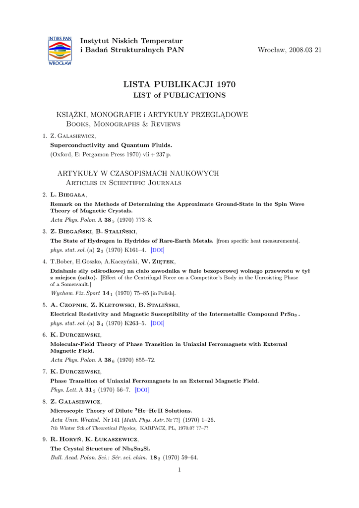 lista publikacji 1970 - Instytut Niskich Temperatur i Badań