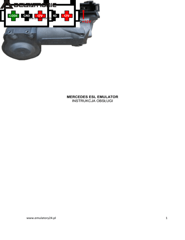 www.emulatory24.pl MERCEDES ESL EMULATOR INSTRUKCJA OBSŁUGI www.emulatory24.pl 1 1. WYMOGI BEZPIECZEŃSTWA Przed przystąpieniem do pierwszego uruchomienia urządzenia, należy w całości zapoznać się z niniejszą instrukcja obsługi. a) Urządzenie należy podłączać do sterowników zgodnie ze schematami podanymi w dalszej części instrukcji b) Wskazane jest korzystanie z urządzenia jedynie w pomieszczeniach zamkniętych. c) Niedopuszczalne jest wystawianie urządzenia ani jego przewodów na działanie czynników atmosferycznych, wilgoci, deszczu, śniegu, wody oraz innych płynów mogących przewodzić prąd elektryczny. d) W przypadku wykrycia widocznego uszkodzenia urządzenia bądź jego nieprawidłowego działania nie wolno korzystać z urządzenia. W takim wypadku należy skontaktować się z firma Deltratronic. e) Nie wolno przeprowadzać żadnych zmian w instalacji elektrycznej pojazdu oraz elektroniki samego urządzenia. f) Wszelkie nieautoryzowane modyfikacje, przeróbki oraz próby naprawy na „własną rękę” powodują utratę gwarancji. g) Wszelka diagnostyka pojazdu może być wykonywana wyłącznie przez przeszkolony w tym celu personel. h) Producent nie ponosi żadnej odpowiedzialności za skutki nieodpowiedniego korzystania z urządzenia bądź jego nieprawidłowej obsługi. 2. SPECYFIKACJA TECHNICZNA Podstawowe dane techniczne: a) Wymiary: długość 33mm, szerokość 28mm, wysokość 15mm b) Masa netto: ~10g c) Zakres wilgotności podczas eksploatacji od 5 do 95% (wilgotność bez kondensacji) d) Napięcie zasilania 12V 3. OBSŁUGIWANE MODELE www.emulatory24.pl Emulator współpracuje z elektronicznymi stacyjkami Mercedesa stosowanymi w modelach: W202, W208, W210 oraz W203, W209, W211, Vito 639, Sprinter W906. Działa również z nowymi ryglami z procesorem NEC. Urządzenie w wersji samouczącej, nie wymaga programowania sterowników. 4. WYPROWADZENIA EMULATORA KOLORY I OZNACZENIA PRZEWODÓW CZERWONY (12V) ZIELONY (CODE) CZARNY (GND) 5. OBSŁUGA Emulator jest bardzo prosty w instalacji, wystarczy podłączyć 3 przewody: +12V po zapłonie, MASĘ oraz linię komunikacyjną. Urządzenie umożliwia zastąpienie oryginalnej blokady kierowniczej (rygiel ESL). Pozwala na przekręcenie stacyjki i uruchomienie pojazdu w przypadku awarii ESL. Emulator może być również stosowany w celu sprawdzenia oryginalnej elektronicznej stacyjki oraz rygla (ESL – blokada kolumny kierownicy). www.emulatory24.pl 3 6. SCHEMATY PODŁACZEŃ IDENTYFIKACJA ESL – starego typu (W202, W208, W210) ESL – nowego typu (W203, W209, W211, Vito 693) www.emulatory24.pl 6.1 W693 i W906 6.2 W209 i W211 6.3 W202, W208 i W210 6.4 W203 www.emulatory24.pl 5