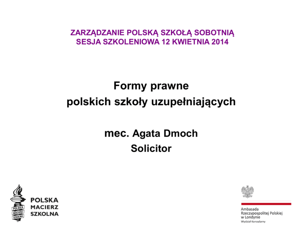 ZARZĄDZANIE POLSKĄ SZKOŁĄ SOBOTNIĄ SESJA SZKOLENIOWA 12 KWIETNIA 2014 Formy prawne polskich szkoły uzupełniających mec. Agata Dmoch Solicitor ZARZĄDZANIE POLSKĄ SZKOŁĄ SOBOTNIĄ SESJA SZKOLENIOWA 12 KWIETNIA 2014 Miejsce polskich szkół na mapie organizacji w UK oraz zwierzchnictwo ZARZĄDZANIE POLSKĄ SZKOŁĄ SOBOTNIĄ SESJA SZKOLENIOWA 12 KWIETNIA 2014 Formy prawne • Unincorporated Association (Stowarzyszenie) • Charitable Incorporated Organisations • Company Limited by Guarantee • Community Interest Company • Charity (incorporated lub unincorporated) • Duża dowolność wyboru ze względu na potrzeby organizacji non-profit ZARZĄDZANIE POLSKĄ SZKOŁĄ SOBOTNIĄ SESJA SZKOLENIOWA 12 KWIETNIA 2014 Miejsce polskich szkół na mapie organizacji w UK oraz zwierzchnictwo ZARZĄDZANIE POLSKĄ SZKOŁĄ SOBOTNIĄ SESJA SZKOLENIOWA 12 KWIETNIA 2014 Przyjęte Założenia • Cel działalność społeczna (non-profit) • Niskie opłaty • Organizacja będzie się starać o dofinansowanie • Głównym celem jest nauka • Pracujemy z dziećmi • Zarząd to głównie Wy • Organizacja nie ma lub ma niewielki kapitał/dobra trwałe (budynki, samochody, sprzęt etc.) ZARZĄDZANIE POLSKĄ SZKOŁĄ SOBOTNIĄ SESJA SZKOLENIOWA 12 KWIETNIA 2014 Objectives/Cele Organizacji? ZARZĄDZANIE POLSKĄ SZKOŁĄ SOBOTNIĄ SESJA SZKOLENIOWA 12 KWIETNIA 2014 Objectives/Cele Co będzie celami organizacji? Jeżeli Registered Chairty to Cele są odgórnie wyznaczone i muszą być „wholly and exclusively charitable” The advancement of education; The advancement of religion; The advancement of citizenship or community development; The advancement of the arts, culture, heritage or science; The advancement of amateur sport; Jeżeli nie Registered Chairty to Cele są dowolne (NB dofinansowanie) ZARZĄDZANIE POLSKĄ SZKOŁĄ SOBOTNIĄ SESJA SZKOLENIOWA 12 KWIETNIA 2014 Przykład ZARZĄDZANIE POLSKĄ SZKOŁĄ SOBOTNIĄ SESJA SZKOLENIOWA 12 KWIETNIA 2014 Decyzja o formie – co należy rozważyć: • Odpowiedzialność osobista • Własność • Fundusze i dofinansowanie • Zarządzanie • Zysk ZARZĄDZANIE POLSKĄ SZKOŁĄ SOBOTNIĄ SESJA SZKOLENIOWA 12 KWIETNIA 2014 W każdej konstytucji: Nazwa – sprawdzić czy już nie istnieje Cele Uprawnienia zarządu Zarząd oraz jego wybór Zgromadzenia i głosowanie Członkowstwo Rozliczenia roczne Konta Zarząd oraz powiązania Nieruchomości i dobra Inwestowanie Zmiany Rozwiązanie Prawo poszczególnych funkcjonariuszy do wiązania członków. ZARZĄDZANIE POLSKĄ SZKOŁĄ SOBOTNIĄ SESJA SZKOLENIOWA 12 KWIETNIA 2014 Unincorporated Association (Stowarzyszenie) ZARZĄDZANIE POLSKĄ SZKOŁĄ SOBOTNIĄ SESJA SZKOLENIOWA 12 KWIETNIA 2014 Formalności Nie ma ustawowej definicji Stowarzyszenia Lawton LJ in Conservative and Unionist Central Office v Burrell "two or more persons bound together for one or more common purposes, not being business purposes, by mutual undertakings each having mutual duties and obligations, in an organisation which has rules which identify in whom control of it and its funds rests and on what terms and which can be joined or left at will„ ZARZĄDZANIE POLSKĄ SZKOŁĄ SOBOTNIĄ SESJA SZKOLENIOWA 12 KWIETNIA 2014 Pełna odpowiedzialność zarządu (wynajem, pracownicy, umowy etc.) Bez rejestracji (wystarczy, że “two or more persons bound together for one or more common purpose”) Potrzebna jest konstytucja/ zasady stowarzyszenia (Rules/Constitution) Zarządza zarząd Głosują członkowie Można określić kto ma prawo głosu i w jakich sprawach ZARZĄDZANIE POLSKĄ SZKOŁĄ SOBOTNIĄ SESJA SZKOLENIOWA 12 KWIETNIA 2014 Unincorporated Association (Stowarzyszenie) Przykład konstytucji Stowarzyszenia • Model constitution for charitable unincorporated associations • http://www.charitycommission.gov.uk/media/94739/gd3text.pdf ZARZĄDZANIE POLSKĄ SZKOŁĄ SOBOTNIĄ SESJA SZKOLENIOWA 12 KWIETNIA 2014 Unincorporated Association (Stowarzyszenie) Za i przeciw: • Łatwość i dowolność w prowadzeniu • Nieograniczona odpowiedzialność ZARZĄDZANIE POLSKĄ SZKOŁĄ SOBOTNIĄ SESJA SZKOLENIOWA 12 KWIETNIA 2014 • Charitable Incorporated Organisations ZARZĄDZANIE POLSKĄ SZKOŁĄ SOBOTNIĄ SESJA SZKOLENIOWA 12 KWIETNIA 2014 Charitable Incorporated Organisations Rejestracja: • Obowiązkowa rejestracja w the Charity Commision (CC) “Wholly and exclusively charitable” Incorporated – więc ma osobną osobowość prawną i wstępuje w umowy jako osobny twór, a nie jako zarząd Odpowiedzialność zarządu jest ograniczona Potrzebna jest konstytucja Zarządzają trustees Obowiązkowe annual return i accounts do CC Obowiązkowa lista trustees oraz członków Dwa modele (association oraz foundation) ZARZĄDZANIE POLSKĄ SZKOŁĄ SOBOTNIĄ SESJA SZKOLENIOWA 12 KWIETNIA 2014 • Charitable Incorporated Organisations • https://www.deloitte.com/assets/Dcom- UnitedKingdom/Local%20Assets/Documents/Industries/uk-charitycharitable-incorporated-organisations.pdf (Rozdział 1 porównanie CIO z innymi formami, Rozdział 2 zakładanie CIO, Rozdział 3 przekształcanie istniejących organizacji w CIO). • Różnica pomiędzy CIO association v foundation • Co powinna zawierać konstytucja • http://www.charitycommission.gov.uk/media/94471/CIO- FoundationModelConstitution.pdf • http://www.charitycommission.gov.uk/media/94463/CIOAssociationModelConstitution.pdf ZARZĄDZANIE POLSKĄ SZKOŁĄ SOBOTNIĄ SESJA SZKOLENIOWA 12 KWIETNIA 2014 Charitable Incorporated Organisations Za i przeciw Ograniczona odpowiedzialność Najłatwiejsza forma z tych, które dają ochronę zarządowi, wiąże się jednak z większą ilością biurokracji niż Stowarzyszenie Nowa forma prawna, więc wiele niewiadomych ZARZĄDZANIE POLSKĄ SZKOŁĄ SOBOTNIĄ SESJA SZKOLENIOWA 12 KWIETNIA 2014 Company Limited by Guarantee ZARZĄDZANIE POLSKĄ SZKOŁĄ SOBOTNIĄ SESJA SZKOLENIOWA 12 KWIETNIA 2014 Company Limited by Guarantee – Rejestracja Rejestracja:
