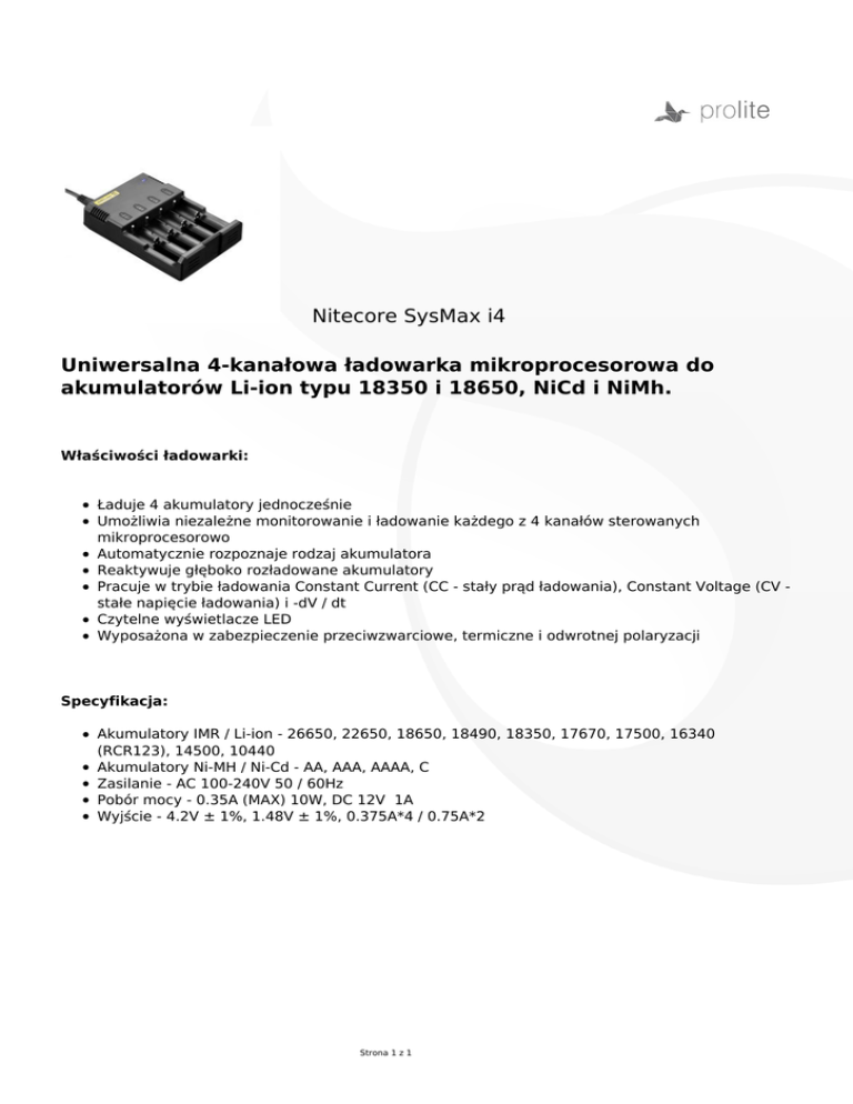 Nitecore SysMax i4 Uniwersalna 4-kanałowa ładowarka mikroprocesorowa do akumulatorów Li-ion typu 18350 i 18650, NiCd i NiMh. Właściwości ładowarki: Ładuje 4 akumulatory jednocześnie Umożliwia niezależne monitorowanie i ładowanie każdego z 4 kanałów sterowanych mikroprocesorowo Automatycznie rozpoznaje rodzaj akumulatora Reaktywuje głęboko rozładowane akumulatory Pracuje w trybie ładowania Constant Current (CC - stały prąd ładowania), Constant Voltage (CV stałe napięcie ładowania) i -dV / dt Czytelne wyświetlacze LED Wyposażona w zabezpieczenie przeciwzwarciowe, termiczne i odwrotnej polaryzacji Specyfikacja: Akumulatory IMR / Li-ion - 26650, 22650, 18650, 18490, 18350, 17670, 17500, 16340 (RCR123), 14500, 10440 Akumulatory Ni-MH / Ni-Cd - AA, AAA, AAAA, C Zasilanie - AC 100-240V 50 / 60Hz Pobór mocy - 0.35A (MAX) 10W, DC 12V 1A Wyjście - 4.2V ± 1%, 1.48V ± 1%, 0.375A*4 / 0.75A*2 Strona 1 z 1
