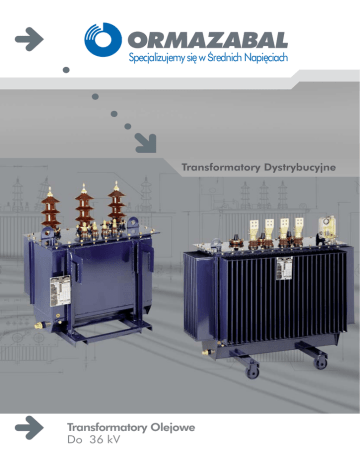 Specjalizujemy się w Średnich Napięciach Transformatory Dystrybucyjne Transformatory Olejowe Do 36 kV Spis treści Od 25 do 2500 kVA • Poziom Izolacji do 24 kV W izolacji olejowej lub innych dielektryków Transformatory Olejowe 3 Charakterystyka Elektryczna: 24 kV D0 CK (AB’) 4 Charakterystyka Elektryczna: 24 kV C0 BK (CC’) 5 Specjalizujemy się w Średnich Napięciach Jakość produktów, które projektujemy, wytwarzamy i instalujemy, jest gwarantowana przez wprowadzony i certyfikowany system zapewnienia jakości, zgodny ze standardem PN-EN ISO 9001:2000. Nasze zaangażowanie w ochronę środowiska zaowocowało wprowadzeniem i certyfikowaniem systemu zarządzania środowiskowego ISO 14001. W wyniku stałego rozwoju standardów i nowych rozwiązań charakterystyka produktów, pokazanych w tym katalogu może ulec zmianie bez wcześniejszego uprzedzenia. Charakterystykę i dostępność rozwiązań należy potwierdzić w naszym Dziale Technicznym i Sprzedaży. Specjalizujemy się w Średnich Napięciach 2 Od 25 do 2500 kVA • Poziom Izolacji do 24 kV W izolacji olejowej lub innych dielektryków OPIS Transformatory te mają następującą charakterystykę: • • • • • Trójfazowe, 50 Hz, do instalacji zewnątrz lub wewnątrz. W izolacji oleju, zgodnie z normą PN-EN 60296 (inne syciwo na życzenie). Kadź ze ściankami falistymi. Chłodzenie naturalne (ONAN). Malowane lakierem niebieskim, kolor 8010-B10G (inne kolory na życzenie) Transformatory są w całości wykonane z nowych materiałów i są wolne od PCB. Zależnie od wymagań Ormazabal oferuje transformatory na różne napięcia do 36kV, oraz napięcia DN do 690V. Możliwe jest także wykonanie transformatorów dwunapięciowych, przełączalnych np. 10,5 - 21kV / 420V AKCESORIA STANDARDOWE yy Przełącznik zaczepów beznapięciowy. yy Porcelanowe przepusty GN. yy Porcelanowe przepusty DN. yy 2 zaciski uziemiające. yy Zawór spustowy i probierczy. yy Zawór nadciśnieniowy. yy Zawór wlewowy. yy Tabliczka znamionowa. yy 2 uchwyty do podnoszenia. yy 4 uchwyty zatrzaskowe. yy 4 uchwyty do ciągnięcia. yy Tuleja na termometr. yy Wskaźnik poziomu oleju. yy Iskierniki prętowe. AKCESORIA OPCJONALNE yy Termometr z dwoma stykami. yy Podobciążeniowy przełącznik zaczepów. yy Koła dwukierunkowe. yy Łącza DN typu PAT. yy Przepusty GN typu plug-in. yy Zawór nadciśnieniowy. yy Inne syciwa (silikon, midel ® 7131). yy Przekaźnik zabezpieczeń (gaz, ciśnienie, temperatura). yy Skrzynki przyłączy. yy Skrzynki kablowe. yy Zbiornik bezpieczeństwa wyciekającego syciwa. yy Akcesoria transformatorów z konserwatorem: Konserwator, wskaźnik poziomu oleju, odwilżacz (silikon), Buchholz SPECYFIKACJE Transformatory są zgodne z normą PN-EN60076. (Na życzenie produkujemy również według innych norm) BADANIA BADANIA GN 24 50 125 Poziomy izolacji Napięcie maksymalne [kV] Napięcie częstotliwości przemysłowej 50 Hz, 1 min [kV] Napięcie udarowe, piorunowe 1,2/50 µs [kV] Olej 60 Nagrzewanie przy mocy znamionowej Przyrost temperatury [K] PRZYŁĄCZA Przyłącza konektorowe dla przepustów K180 AR-1 24kV / 250 A DN 1.1 3 20 Uzwojenia 65 36 70 170 Przyłącza DN [mm] Przyłącza DN, tzw. “chorągiewki” Typ PAT 1e/630 PAT 1e/1000 PAT 1e/2000 PAT 1e/3150 PAT 1e/4000 Prąd [A] 630 1000 2000 3150 4000 d1 M 20 x 2.5 M 30 x 2 M 42 x 3 M 48 x 3 M 55 x 3 e 32 32 40 40 70 fº 60 60 100 120 150 Ø 14 14 14 14 18 Przepusty DN dla 420 V Przyłącze kątowe z głowicą K158LR 3 Przyłącze proste z głowicą K152SR Moc Znamionowa [kVA] Prąd Znamionowy [A] Śruba Materiał <160 250 400 630 800 1000 1250 1600 2000 2500 250 630 630 1000 1800 1800 2000 3150 3150 4000 M12 M20 M20 M30 M42 M42 M42 Mosiądz Mosiądz Mosiądz Mosiądz Mosiądz Mosiądz Miedź M48 Miedź M48 Miedź M55 Miedź 2 Specjalizujemy się w Średnich Napięciach Od 25 do 2500 kVA • Poziom Izolacji do 24 kV W izolacji olejowej lub innych dielektryków Charakterystyka Elektryczna: 24 kV D0 CK (AB’) Przepusty GN konektorowe Przepusty GN porcelanowe Charakterystyka Elektryczna Moc Znamionowa [kVA] GN DN na jałowo Grupa Połączeń Straty Jałowe - Po [W] Lista D0 Straty Zwarciowe - Pk [W] Lista Ck Impedancja Zwarcia (%) przy 75ºC Max. Moc Akustyczna LwA dB [A] Lista D0 cosƒ=1 Spadek Napięcia Pełne Obc. (%) cosƒ=0.8 cosƒ=1 Obc 100% cosƒ=0.8 Sprawność (%) cosƒ=1 Obc 75% cosƒ=0.8 24 kV D0 CK (AB’) 25 40 63 100 160 Napięcie Znamionowe 250 400 630 800 1000 1250 1600 2000 2500 1750 2200 2700 3200 15,75 kV / 21 kV 400V – 410V - 420V międzyfazowe Yzn5 Dyn5 Dyn5 Yzn5 95 125 175 260 375 530 750 940 1150 1400 700 940 1270 1750 2350 3250 4600 6750 8100 10500 13500 17000 21000 26500 4 4 4 4 4 4 4 6 6 6 6 6 6 6 47 49 51 54 57 60 63 65 67 68 70 71 73 76 2,84 2,40 2,08 1,81 1,54 1,37 1,22 1,11 1,19 1,22 1,25 1,24 1,22 1,23 3,96 3,83 3,70 3,57 3,43 3,33 3,25 3,17 4,44 4,47 4,49 4,48 4,47 4,47 96,92 97,41 97,76 98,03 98,33 98,51 98,68 98,82 98,86 98,82 98,79 98,81 98,83 98,83 96,18 96,78 97,21 97,55 97,92 98,15 98,36 98,53 98,58 98,53 98,50 98,52 98,54 98,54 97,46 97,87 98,15 98,37 98,61 98,76 98,90 99,02 99,06 99,04 99,01 99,03 99,04 99,04 96,84 97,35 97,70 97,97 98,26 98,45 98,63 98,78 98,83 98,80 98,77 98,79 98,81 98,81 Wymiary [mm] * Moc Znamionowa [kVA] A (Długość) B (Szerokość) C (Wysokość obudowy) D1 (Wysokość do przepustów GN porcelanowych) D3 (Wysokość do przepustów GN konektorowych ) D2 (Wysokość do przyłączy DN) F (Rozstaw przepustów GN) H (Rozstaw przyłączy DN) J (Rozstaw kół) K (Szerokość kół) Ø (Koła) L (Koła) Ilość Oleju [Litry] Masa [Kg] 25 40 63 100 160 250 400 630 800 1000 1250 1600 2000 2500 910 945 945 1.020 1.206 1300 1516 1606 1846 1886 1966 2000 2130 2130 700 725 725 780 818 910 976 1006 1146 1206 1256 1370 1520 1520 749 808 808 858 859 913 993 1083 1161 1153 1168 1619 1779 1779 1134 1193 1193 1243 1244 1298 1378 1468 1546 1538 1553 2004 2164 2164 840 900 900 950 950 1003 1083 1173 1251 1243 1258 1709 1869 216