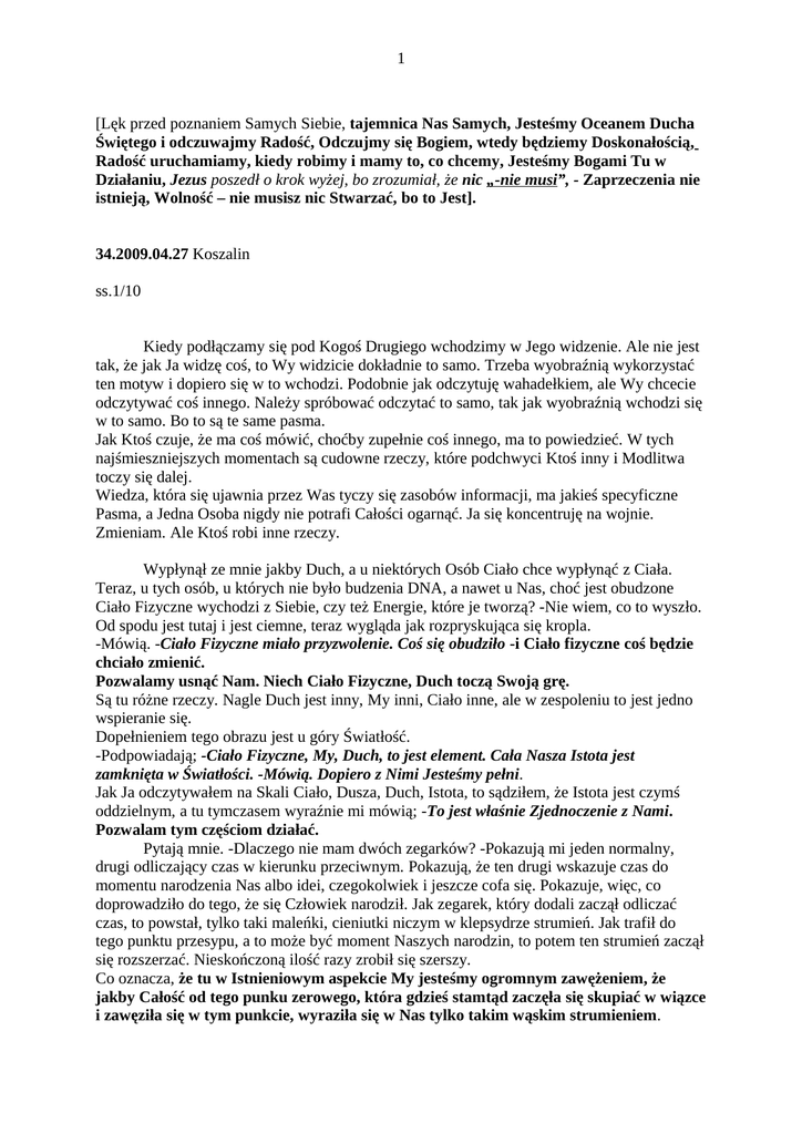1 [Lęk przed poznaniem Samych Siebie, tajemnica Nas Samych, Jesteśmy Oceanem Ducha Świętego i odczuwajmy Radość, Odczujmy się Bogiem, wtedy będziemy Doskonałością, Radość uruchamiamy, kiedy robimy i mamy to, co chcemy, Jesteśmy Bogami Tu w Działaniu, Jezus poszedł o krok wyżej, bo zrozumiał, że nic „-nie musi”, - Zaprzeczenia nie istnieją, Wolność – nie musisz nic Stwarzać, bo to Jest]. 34.2009.04.27 Koszalin ss.1/10 Kiedy podłączamy się pod Kogoś Drugiego wchodzimy w Jego widzenie. Ale nie jest tak, że jak Ja widzę coś, to Wy widzicie dokładnie to samo. Trzeba wyobraźnią wykorzystać ten motyw i dopiero się w to wchodzi. Podobnie jak odczytuję wahadełkiem, ale Wy chcecie odczytywać coś innego. Należy spróbować odczytać to samo, tak jak wyobraźnią wchodzi się w to samo. Bo to są te same pasma. Jak Ktoś czuje, że ma coś mówić, choćby zupełnie coś innego, ma to powiedzieć. W tych najśmieszniejszych momentach są cudowne rzeczy, które podchwyci Ktoś inny i Modlitwa toczy się dalej. Wiedza, która się ujawnia przez Was tyczy się zasobów informacji, ma jakieś specyficzne Pasma, a Jedna Osoba nigdy nie potrafi Całości ogarnąć. Ja się koncentruję na wojnie. Zmieniam. Ale Ktoś robi inne rzeczy. Wypłynął ze mnie jakby Duch, a u niektórych Osób Ciało chce wypłynąć z Ciała. Teraz, u tych osób, u których nie było budzenia DNA, a nawet u Nas, choć jest obudzone Ciało Fizyczne wychodzi z Siebie, czy też Energie, które je tworzą? -Nie wiem, co to wyszło. Od spodu jest tutaj i jest ciemne, teraz wygląda jak rozpryskująca się kropla. -Mówią. -Ciało Fizyczne miało przyzwolenie. Coś się obudziło -i Ciało fizyczne coś będzie chciało zmienić. Pozwalamy usnąć Nam. Niech Ciało Fizyczne, Duch toczą Swoją grę. Są tu różne rzeczy. Nagle Duch jest inny, My inni, Ciało inne, ale w zespoleniu to jest jedno wspieranie się. Dopełnieniem tego obrazu jest u góry Światłość. -Podpowiadają; -Ciało Fizyczne, My, Duch, to jest element. Cała Nasza Istota jest zamknięta w Światłości. -Mówią. Dopiero z Nimi Jesteśmy pełni. Jak Ja odczytywałem na Skali Ciało, Dusza, Duch, Istota, to sądziłem, że Istota jest czymś oddzielnym, a tu tymczasem wyraźnie mi mówią; -To jest właśnie Zjednoczenie z Nami. Pozwalam tym częściom działać. Pytają mnie. -Dlaczego nie mam dwóch zegarków? -Pokazują mi jeden normalny, drugi odliczający czas w kierunku przeciwnym. Pokazują, że ten drugi wskazuje czas do momentu narodzenia Nas albo idei, czegokolwiek i jeszcze cofa się. Pokazuje, więc, co doprowadziło do tego, że się Człowiek narodził. Jak zegarek, który dodali zaczął odliczać czas, to powstał, tylko taki maleńki, cieniutki niczym w klepsydrze strumień. Jak trafił do tego punktu przesypu, a to może być moment Naszych narodzin, to potem ten strumień zaczął się rozszerzać. Nieskończoną ilość razy zrobił się szerszy. Co oznacza, że tu w Istnieniowym aspekcie My jesteśmy ogromnym zawężeniem, że jakby Całość od tego punku zerowego, która gdzieś stamtąd zaczęła się skupiać w wiązce i zawęziła się w tym punkcie, wyraziła się w Nas tylko takim wąskim strumieniem. 2 Pokazują mi, że przez ten czas jest jakieś przejście do Nich. Pokazują Koło Góry i Dołu, Początku i Końca i to jedno Koło po obwodzie się kręcące. Tam też jest aspekt czasu, aspekt materii, aspekt energii i aspekt Ducha. Znaki pojawiły się na Kole. Gwiezdne Wrota, tam też Koło się Kręci i są znaki. Te, które wymieniłem zajaśniały. Jest ich 7 albo 8. Siódemka zajaśniała. Jest siedem znaków, ósmy tyczy się innej Rzeczywistości i jest czasami wpisany. Mamy tam Materia, Energia, Duch, Czas, Przestrzeń. Pokazują na Ducha. Duch, to jest Głębia, ale jest jeszcze Przestrzeń Pozioma, dlatego są tu kratki i w tym ujęciu Przestrzeń też wpisujemy. -Uwaga! –Ustawienie Informacyjne. Jak wchodzimy do Oceanu Jest i nie ma. To, co Nicość, to jakby informacja. Chcesz, to już jest coś. -Stwarzaj, bo już jest wytłumaczone informacyjnie. Nie wiem jak to zapisać, to powiedzieli; -Informacja. Czyli jak w Oceanie Ducha Świętego coś jest(8.10-8.26). (Głos I)To są Hologramy Czasowe. (Zbyszek)Ta Informacja, to Czas, a Hologramy Czasowe, to są Istnienia, czyli to, co się staje, w Naszej Rzeczywistości. Bo tam po prostu są wtedy, kiedy chcemy, by były. Natomiast tu, kiedy jest niby ruch, to coś między tymi klatkami Istnieniowym, to tu wtedy się pojawia Hologram Czasowy. Istnienie.(8.51-9.19). Jeszcze tu wchodzą jakieś elementy. Pojawił się Orzeł, Krzyk. Wpisał się w ten Krąg. –Co to znaczy? –Przyczyna? (Głos I)Przyczyna Powstania tego Zapisu. (Zbyszek)Tej Całości. (Głos II)Pochodzenie. (Zbyszek)Pokazali, że to Koło zaczęło promieniować na Nasze Twarze. Z zewnątrz otacza Naszą Głowę. Stanęło. Prowadzący jest u góry tym Znakiem. Jakby Orzeł, coś z egipska. Jest rozmieszczenie. To leci. Te Znaki mają swoją kolejność. Te Znaki można przestawiać i wtedy, co innego się staje. Jakbyśmy mogli wejść w zupełnie inny Świat. To tu ma znaczenie. I to, co zostało Stworzone, to też jest jakby jednym Hologramem wynikające z właściwego ustawienia tych Znaków. My cały czas staramy się odnaleźć w tych Znakach, w Zapisach, w Przestrzeniach, w Źródle pochodzenia, w Całości, a zapomnieliśmy, że My sami możemy w ogóle nie Istnieć albo pochodzić z skądś indziej i My sami staramy się poznać nie samych Siebie, tylko w relacjach z różnymi Przestrzeniami, z Czasem, z Początkiem. Zapomnieliśmy o poznaniu Nas Samych. Bez relacji z kimkolwiek, z Przestrzenią, z Istnieniami (Głos I)Sami Siebie z Sobą. (Zbyszek)My nawet jak poznajemy Siebie w Duchu, w dążeniu do Ojca, to są to relacje, układy. A My nie szukaliśmy nieukładającej się z czymkolwiek Cząstki Samych Siebie Jesteśmy największą Tajemnicą. Pró