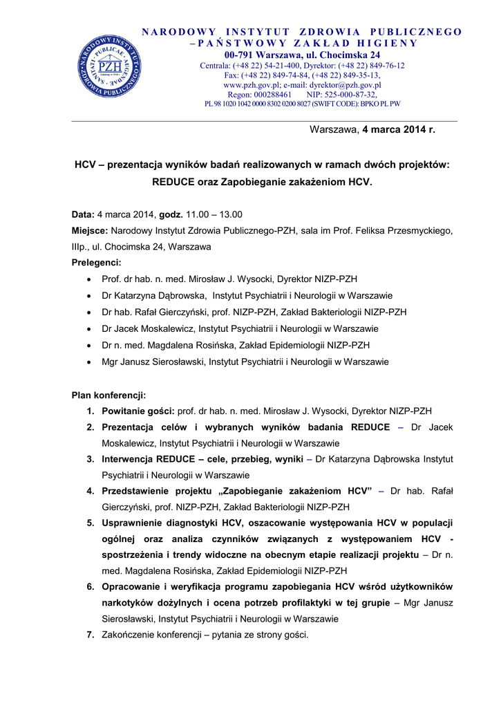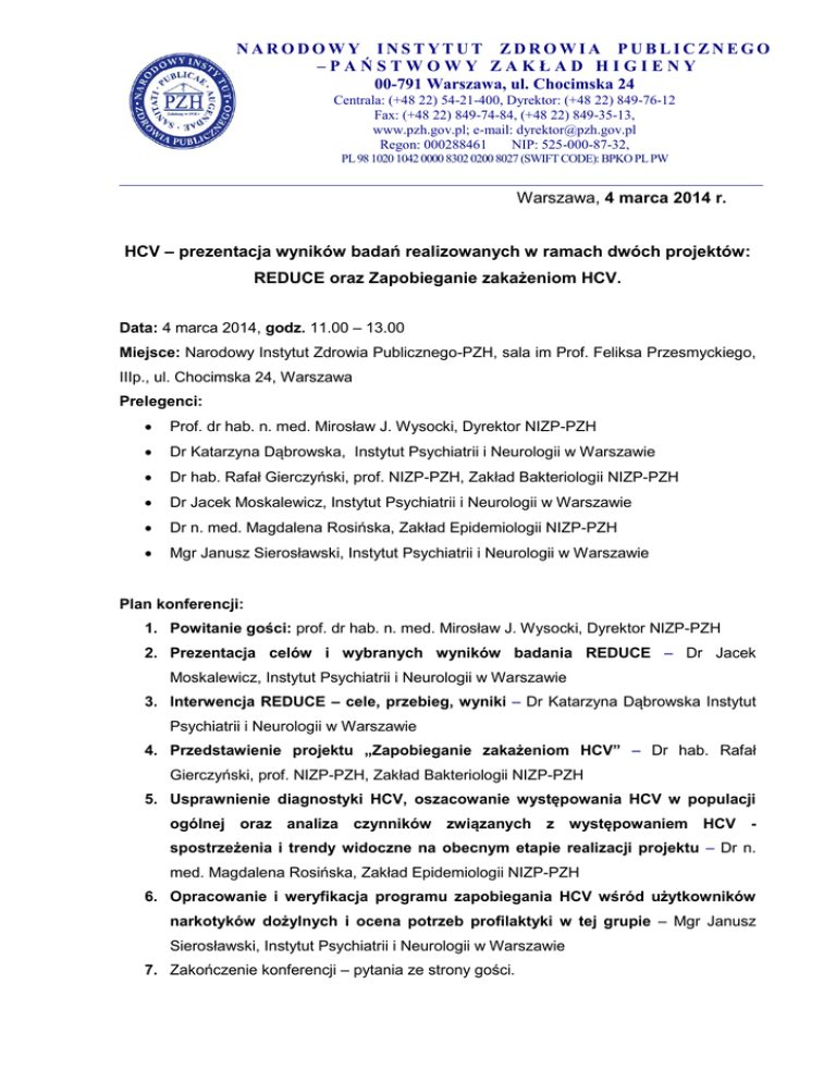NARODOWY INSTYTUT ZDROWIA PUBLICZNEGO –PAŃSTWOWY ZAKŁAD HIGIENY 00-791 Warszawa, ul. Chocimska 24 Centrala: (+48 22) 54-21-400, Dyrektor: (+48 22) 849-76-12 Fax: (+48 22) 849-74-84, (+48 22) 849-35-13, www.pzh.gov.pl; e-mail: [email protected] Regon: 000288461 NIP: 525-000-87-32, PL 98 1020 1042 0000 8302 0200 8027 (SWIFT CODE): BPKO PL PW Warszawa, 4 marca 2014 r. HCV – prezentacja wyników badań realizowanych w ramach dwóch projektów: REDUCE oraz Zapobieganie zakażeniom HCV. Data: 4 marca 2014, godz. 11.00 – 13.00 Miejsce: Narodowy Instytut Zdrowia Publicznego-PZH, sala im Prof. Feliksa Przesmyckiego, IIIp., ul. Chocimska 24, Warszawa Prelegenci: Prof. dr hab. n. med. Mirosław J. Wysocki, Dyrektor NIZP-PZH Dr Katarzyna Dąbrowska, Instytut Psychiatrii i Neurologii w Warszawie Dr hab. Rafał Gierczyński, prof. NIZP-PZH, Zakład Bakteriologii NIZP-PZH Dr Jacek Moskalewicz, Instytut Psychiatrii i Neurologii w Warszawie Dr n. med. Magdalena Rosińska, Zakład Epidemiologii NIZP-PZH Mgr Janusz Sierosławski, Instytut Psychiatrii i Neurologii w Warszawie Plan konferencji: 1. Powitanie gości: prof. dr hab. n. med. Mirosław J. Wysocki, Dyrektor NIZP-PZH 2. Prezentacja celów i wybranych wyników badania REDUCE – Dr Jacek Moskalewicz, Instytut Psychiatrii i Neurologii w Warszawie 3. Interwencja REDUCE – cele, przebieg, wyniki – Dr Katarzyna Dąbrowska Instytut Psychiatrii i Neurologii w Warszawie 4. Przedstawienie projektu „Zapobieganie zakażeniom HCV” – Dr hab. Rafał Gierczyński, prof. NIZP-PZH, Zakład Bakteriologii NIZP-PZH 5. Usprawnienie diagnostyki HCV, oszacowanie występowania HCV w populacji ogólnej oraz analiza czynników związanych z występowaniem HCV spostrzeżenia i trendy widoczne na obecnym etapie realizacji projektu – Dr n. med. Magdalena Rosińska, Zakład Epidemiologii NIZP-PZH 6. Opracowanie i weryfikacja programu zapobiegania HCV wśród użytkowników narkotyków dożylnych i ocena potrzeb profilaktyki w tej grupie – Mgr Janusz Sierosławski, Instytut Psychiatrii i Neurologii w Warszawie 7. Zakończenie konferencji – pytania ze strony gości. W ramach projektu REDUCE, który jest współfinansowany przez Komisję Europejską zostaną wygłoszone następujące wykłady: 1. Prezentacja celów i wybranych wyników badania REDUCE (współfinansowanie). Dr Jacek Moskalewicz 2. Interwencja REDUCE – cele, przebieg, wyniki. Dr Katarzyna Dąbrowska O projekcie REDUCE – tytuł projektu: Ograniczenie ryzykownych zachowań seksualnych i związanych z zażywaniem narkotyków, prowadzących do zakażenia wirusem żółtaczki typu C wśród kobiet używających narkotyków w Europie: przełożenie dowodów naukowych na praktykę (Reducing hepatitis C sexual and drug taking rosk behaviours among female drug isers in Europe: translating evidence into practise); koordynator projektu: Consorcio Mar Parc De Salut De Barcelona, Hiszpania; kierownik projektu w Polsce: dr Jacek Moskalewicz, główny wykonawca: dr Katarzyna Dąbrowska, czas realizacji: 1.10.2011-31.12.2013. Szacuje się, że na całym świecie żyje około 170 mln osób zakażonych wirusem żółtaczki typu C (HCV) tzn. pięciokrotnie więcej niż osób żyjących z HIV/AIDS. Większość zakażonych HCV przyjmuje narkotyki w zastrzykach. Wśród osób przyjmujących narkotyki w iniekcjach kobiety częściej niż mężczyźni zakażają się wirusem żółtaczki typu C. Kobiety częściej niż mężczyźni mają partnerów seksualnych, którzy również przyjmują narkotyki w iniekcjach, wspólnie z nimi biorą narkotyki używając tego samego sprzętu. Często padają też ofiarami przemocy ze strony swych partnerów. Projekt Reduce diagnozuje wiedzę kobiet na temat ryzykownych zachowań prowadzących do zakażenia wirusem żółtaczki typu C, stara się lepiej zrozumieć, jakie zachowania ryzykowne są udziałem kobiet oraz proponuje interwencję, która ma na celu ograniczenie podejmowanych przez nie zachowań ryzykownych i uwzględnia ich specyficzne potrzeby. W ramach projektu „Zapobieganie zakażeniom HCV” zostaną wygłoszone następujące wykłady: 1. Usprawnienie diagnostyki HCV, oszacowanie występowania HCV w populacji ogólnej oraz analiza czynników związanych z występowaniem HCV - spostrzeżenia i trendy widoczne na obecnym etapie realizacji projektu – Dr n. med. Magdalena Rosińska, Zakład Epidemiologii NIZP-PZH 2. Opracowanie i weryfikacja programu zapobiegania HCV wśród użytkowników narkotyków dożylnych i ocena potrzeb profilaktyki w tej grupie – Mgr Janusz Sierosławski, Instytut Psychiatrii i Neurologii w Warszawie O projekcie „Zapobieganie Zakażeniom HCV”: Projekt realizowany będzie w latach 2012 - 2016, a jego szacowane całkowite koszty kwalifikowane wynoszą 4.669.907 CHF, z czego: 1) kwota 3.969.421 CHF, stanowiąca 85% całkowitych kosztów kwalifikowanych będzie dofinansowaniem strony szwajcarskiej, 2) kwota 700.486 CHF, stanowiąca 15% całkowitych kosztów kwalifikowanych będzie wkładem krajowym. Celem Szwajcarsko-Polskiego Programu Współpracy (SPPW), w ramach którego została podpisana umowa w sprawie realizacji Projektu, jest zmniejszenie różnic społecznogospodarczych na obszarze Polski a środki udostępniane w ramach SPPW umożliwiają ogólnopolską promocję zdrowego stylu życia, edukacji zdrowotnej i profilaktyki chorób zakaźnych. Kontakt: Monika Wróbel e-mail: [email protected] Tel. (22) 54 21 288 Narodowy Instytut Zdrowia Publicznego Państwowy Zakład Higieny ul. Chocimska 24 00-791 Warszawa Narodowy Instytut Zdrowia Publicznego – Państwowy Zakład Higieny Instytut Psychiatrii I Neurologii w Warszawie Uniwersytet Medyczny w Lublinie Główny Inspektorat Sanitarny