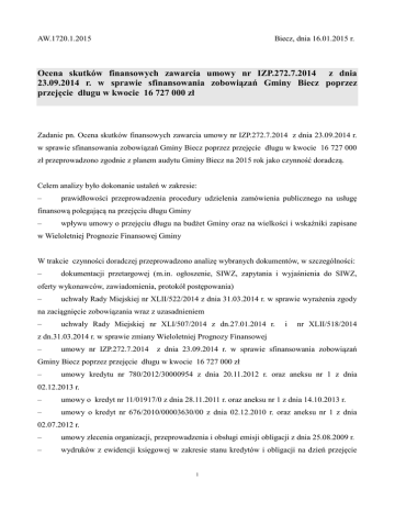 AW.1720.1.2015 Biecz, dnia 16.01.2015 r. Ocena skutków finansowych zawarcia umowy nr IZP.272.7.2014 z dnia 23.09.2014 r. w sprawie sfinansowania zobowiązań Gminy Biecz poprzez przejęcie długu w kwocie 16 727 000 zł Zadanie pn. Ocena skutków finansowych zawarcia umowy nr IZP.272.7.2014 z dnia 23.09.2014 r. w sprawie sfinansowania zobowiązań Gminy Biecz poprzez przejęcie długu w kwocie 16 727 000 zł przeprowadzono zgodnie z planem audytu Gminy Biecz na 2015 rok jako czynność doradczą. Celem analizy było dokonanie ustaleń w zakresie: – prawidłowości przeprowadzenia procedury udzielenia zamówienia publicznego na usługę finansową polegającą na przejęciu długu Gminy – wpływu umowy o przejęciu długu na budżet Gminy oraz na wielkości i wskaźniki zapisane w Wieloletniej Prognozie Finansowej Gminy W trakcie czynności doradczej przeprowadzono analizę wybranych dokumentów, w szczególności: – dokumentacji przetargowej (m.in. ogłoszenie, SIWZ, zapytania i wyjaśnienia do SIWZ, oferty wykonawców, zawiadomienia, protokół postępowania) – uchwały Rady Miejskiej nr XLII/522/2014 z dnia 31.03.2014 r. w sprawie wyrażenia zgody na zaciągnięcie zobowiązania wraz z uzasadnieniem – uchwały Rady Miejskiej nr XLI/507/2014 z dn.27.01.2014 r. i nr XLII/518/2014 z dn.31.03.2014 r. w sprawie zmiany Wieloletniej Prognozy Finansowej – umowy nr IZP.272.7.2014 z dnia 23.09.2014 r. w sprawie sfinansowania zobowiązań Gminy Biecz poprzez przejęcie długu w kwocie 16 727 000 zł – umowy kredytu nr 780/2012/30000954 z dnia 20.11.2012 r. oraz aneksu nr 1 z dnia 02.12.2013 r. – umowy o kredyt nr 11/01917/0 z dnia 28.11.2011 r. oraz aneksu nr 1 z dnia 14.10.2013 r. – umowy o kredyt nr 676/2010/00003630/00 z dnia 02.12.2010 r. oraz aneksu nr 1 z dnia 02.07.2012 r. – umowy zlecenia organizacji, przeprowadzenia i obsługi emisji obligacji z dnia 25.08.2009 r. – wydruków z ewidencji księgowej w zakresie stanu kredytów i obligacji na dzień przejęcie 1 długu. Ponadto na potrzeby niniejszej analizy audytor dokonał obliczeń celem ustalenia i porównania kosztów obsługi kredytów i obligacji, wg warunków obowiązujących przed i po przejęciu długu. 1. Ocena procedury udzielenia zamówienia publicznego na usługę finansową polegającą na przejęciu długu Gminy Wykonawcę usługi wyłoniono w trybie przetargu nieograniczonego, zgodnie z przepisami ustawy z dnia 29.01.2004 r. Prawo zamówień publicznych (PZP). Pierwsze postępowanie o udzielenie zamówienia, prowadzone w m-cu maju 2014 r. zostało unieważnione, ze względu na to, iż było obarczone niemożliwą do usunięcia wadą uniemożliwiającą zawarcie nie podlegającej unieważnieniu umowy w sprawie udzielenia zamówienia. Drugie postępowanie zostało wszczęte w lipcu 2014 r. Wartość szacunkowa zamówienia określona została w oparciu o symulację odsetek sporządzoną przez Skarbnika Gminy z dn.11.07.2014 r. Ze względu na fakt, iż wartość szacunkowa zamówienia (usługi) przekraczała równowartość 207 tys. euro, zgodnie z art. 11 PZP, w dn.16.07.2014 r. ogłoszenie o zamówieniu przesłano do Urzędu Publikacji Unii Europejskiej. Ogłoszenie zostało sporządzone zgodnie z art.41 ustawy PZP. Specyfikacja Istotnych Warunków Zamówienia (SIWZ) zawiera elementy wskazane w art.36 i została udostępniona na stronie internetowej, stosownie do postanowień art.42 PZP. Termin składania ofert (27.08.2014 r.) został wyznaczony zgodnie z art.43 PZP. W związku z pytaniami przedłożonymi przez wykonawców do treści SIWZ, zamawiający udzielił wyjaśnień oraz dokonał przesunięcia terminu składania ofert na dzień 01.09.2014 r. Wyjaśnienia zamieszczono na stronie internetowej i przesłano wykonawcom, którzy wnieśli zapytania. Zmianę ogłoszenia przesłano do Urzędu Publikacji Unii Europejskiej. W wyznaczonym terminie, tj. do 01.09.2014 r. do godz.9.30 wpłynęły 4 oferty. Wszyscy wykonawcy biorący udział w postępowaniu wpłacili w terminie wadium w wys. określonej w SIWZ. Badania spełniania przez wykonawców warunków udziału w postępowaniu oraz badania i oceny ofert dokonała stała komisja przetargowa powołana zarządzeniem Burmistrza nr 786/2014 z dn. 16.04.2014 r. Członkowie komisji przetargowej oraz pracownik upoważniony przez Burmistrza do wykonywania czynności zastrzeżonych do kompetencji kierownika zamawiającego złożyli oświadczenia 2 na podstawie art.17 PZP. Wszystkie oferty spełniały warunki określone w SIWZ, zawierały komplet wymaganych dokumentów. Po dokonaniu wyboru najkorzystniejszej oferty, w dn.11.09.2014 r. przesłano zawiadomienie o wynikach postępowania do wykonawców biorących udział w przetargu oraz zamieszczono je na stronie internetowej i na tablicy ogłoszeń. Z przeprowadzonego postępowania został sporządzony protokół na druku ZP – PN, który w dn.30.09.2014 r. został zatwierdzony przez upoważnionego pracownika. Umowę z wybranym w przetargu wykonawcą – FM Bank PBP S.A. z siedzibą w Warszawie zawarto w dn.23.09.2014 r., tj. z zachowaniem terminu określonego w art.94 ust.1 pkt 1 PZP. Ogłoszenie o udzieleniu zamówienia przesłano w dn.30.09.2014 r. Urzędowi Publikacji Unii Europejskiej. Analiza przedłożonej dokumentacji wskazuje, iż procedura udzielenia zamówienia publicznego na usługę finansową polegającą na przejęciu długu Gminy została przeprowadzona w sposób prawidłowy, zgodnie z przepisami ustawy Prawo zamówień publicznych. 2. Analiza skutków zawarcia umowy IZP.272.7.2014 z dn.23.09.2014 r. Rada Miejska uchwałą nr XLII/522/2014 z dnia 31.03.2014 r. wyraziła zgodę na przejęcie długu Gminy Biecz na podstawie art.518 §1 pkt 3 Kodeksu Cywilnego przez podmiot wyłoniony w trybie przepisów ustawy Prawo zamówień publicznych. Burmistrz Biecza do projektu uchwały dołączył uzasadnienie składające się z części opisowej i części tabelarycznej. W uzasadnieniu wskazano na potrzebę wy