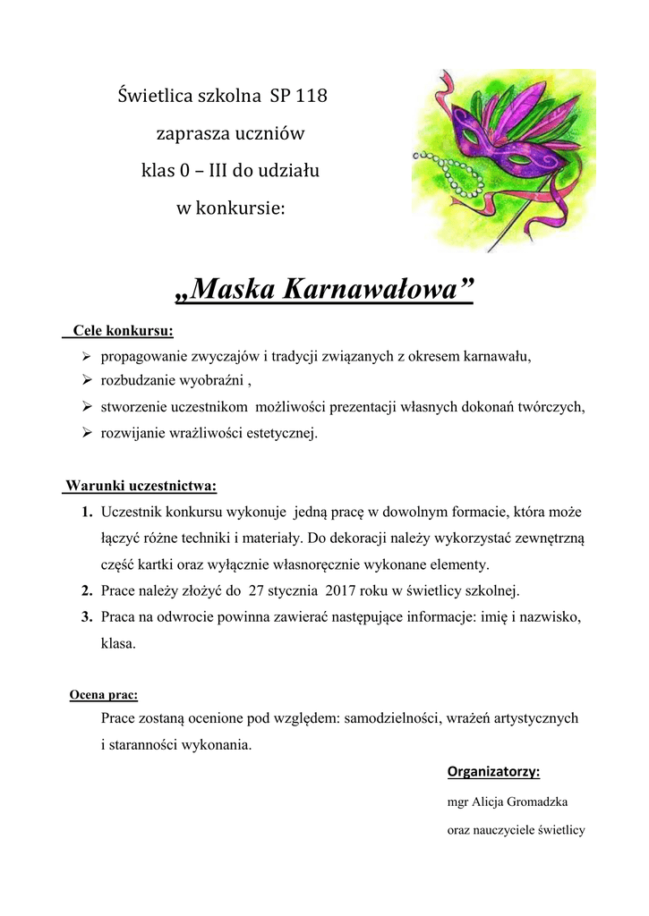 Świetlica szkolna SP 118 zaprasza uczniów klas 0 – III do udziału w konkursie: „Maska Karnawałowa” Cele konkursu: propagowanie zwyczajów i tradycji związanych z okresem karnawału, rozbudzanie wyobraźni , stworzenie uczestnikom możliwości prezentacji własnych dokonań twórczych, rozwijanie wrażliwości estetycznej. Warunki uczestnictwa: 1. Uczestnik konkursu wykonuje jedną pracę w dowolnym formacie, która może łączyć różne techniki i materiały. Do dekoracji należy wykorzystać zewnętrzną część kartki oraz wyłącznie własnoręcznie wykonane elementy. 2. Prace należy złożyć do 27 stycznia 2017 roku w świetlicy szkolnej. 3. Praca na odwrocie powinna zawierać następujące informacje: imię i nazwisko, klasa. Ocena prac: Prace zostaną ocenione pod względem: samodzielności, wrażeń artystycznych i staranności wykonania. Organizatorzy: mgr Alicja Gromadzka oraz nauczyciele świetlicy