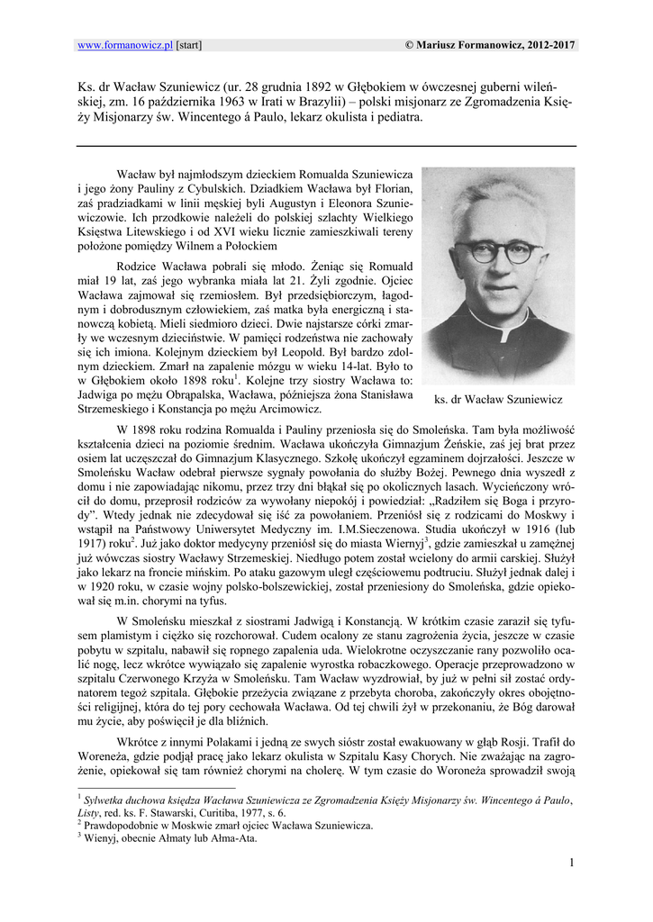 www.formanowicz.pl [start] © Mariusz Formanowicz, 2012-2017 Ks. dr Wacław Szuniewicz (ur. 28 grudnia 1892 w Głębokiem w ówczesnej guberni wileńskiej, zm. 16 października 1963 w Irati w Brazylii) – polski misjonarz ze Zgromadzenia Księży Misjonarzy św. Wincentego á Paulo, lekarz okulista i pediatra. Wacław był najmłodszym dzieckiem Romualda Szuniewicza i jego żony Pauliny z Cybulskich. Dziadkiem Wacława był Florian, zaś pradziadkami w linii męskiej byli Augustyn i Eleonora Szuniewiczowie. Ich przodkowie należeli do polskiej szlachty Wielkiego Księstwa Litewskiego i od XVI wieku licznie zamieszkiwali tereny położone pomiędzy Wilnem a Połockiem Rodzice Wacława pobrali się młodo. Żeniąc się Romuald miał 19 lat, zaś jego wybranka miała lat 21. Żyli zgodnie. Ojciec Wacława zajmował się rzemiosłem. Był przedsiębiorczym, łagodnym i dobrodusznym człowiekiem, zaś matka była energiczną i stanowczą kobietą. Mieli siedmioro dzieci. Dwie najstarsze córki zmarły we wczesnym dzieciństwie. W pamięci rodzeństwa nie zachowały się ich imiona. Kolejnym dzieckiem był Leopold. Był bardzo zdolnym dzieckiem. Zmarł na zapalenie mózgu w wieku 14-lat. Było to w Głębokiem około 1898 roku1. Kolejne trzy siostry Wacława to: Jadwiga po mężu Obrąpalska, Wacława, późniejsza żona Stanisława Strzemeskiego i Konstancja po mężu Arcimowicz. ks. dr Wacław Szuniewicz W 1898 roku rodzina Romualda i Pauliny przeniosła się do Smoleńska. Tam była możliwość kształcenia dzieci na poziomie średnim. Wacława ukończyła Gimnazjum Żeńskie, zaś jej brat przez osiem lat uczęszczał do Gimnazjum Klasycznego. Szkołę ukończył egzaminem dojrzałości. Jeszcze w Smoleńsku Wacław odebrał pierwsze sygnały powołania do służby Bożej. Pewnego dnia wyszedł z domu i nie zapowiadając nikomu, przez trzy dni błąkał się po okolicznych lasach. Wycieńczony wrócił do domu, przeprosił rodziców za wywołany niepokój i powiedział: „Radziłem się Boga i przyrody”. Wtedy jednak nie zdecydował się iść za powołaniem. Przeniósł się z rodzicami do Moskwy i wstąpił na Państwowy Uniwersytet Medyczny im. I.M.Sieczenowa. Studia ukończył w 1916 (lub 1917) roku2. Już jako doktor medycyny przeniósł się do miasta Wiernyj3, gdzie zamieszkał u zamężnej już wówczas siostry Wacławy Strzemeskiej. Niedługo potem został wcielony do armii carskiej. Służył jako lekarz na froncie mińskim. Po ataku gazowym uległ częściowemu podtruciu. Służył jednak dalej i w 1920 roku, w czasie wojny polsko-bolszewickiej, został przeniesiony do Smoleńska, gdzie opiekował się m.in. chorymi na tyfus. W Smoleńsku mieszkał z siostrami Jadwigą i Konstancją. W krótkim czasie zaraził się tyfusem plamistym i ciężko się rozchorował. Cudem ocalony ze stanu zagrożenia życia, jeszcze w czasie pobytu w szpitalu, nabawił się ropnego zapalenia uda. Wielokrotne oczyszczanie rany pozwoliło ocalić nogę, lecz wkrótce wywiązało się zapalenie wyrostka robaczkowego. Operacje przeprowadzono w szpitalu Czerwonego Krzyża w Smoleńsku. Tam Wacław wyzdrowiał, by już w pełni sił zostać ordynatorem tegoż szpitala. Głębokie przeżycia związane z przebyta choroba, zakończyły okres obojętności religijnej, która do tej pory cechowała Wacława. Od tej chwili żył w przekonaniu, że Bóg darował mu życie, aby poświęcił je dla bliźnich. Wkrótce z innymi Polakami i jedną ze swych sióstr został ewakuowany w głąb Rosji. Trafił do Woreneża, gdzie podjął pracę jako lekarz okulista w Szpitalu Kasy Chorych. Nie zważając na zagrożenie, opiekował się tam również chorymi na cholerę. W tym czasie do Woroneża sprowadził swoją 1 Sylwetka duchowa księdza Wacława Szuniewicza ze Zgromadzenia Księży Misjonarzy św. Wincentego á Paulo, Listy, red. ks. F. Stawarski, Curitiba, 1977, s. 6. 2 Prawdopodobnie w Moskwie zmarł ojciec Wacława Szuniewicza. 3 Wienyj, obecnie Ałmaty lub Ałma-Ata. 1 www.formanowicz.pl [start] © Mariusz Formanowicz, 2012-2017 matkę, owdowiałą już Paulinę z Cybulskich, która nie bacząc na trudy wojenne, jechała z Wiernego do swojego syna dwa miesiące. Starania o powrót do Ojczyzny rozpoczął po ustaniu walk pomiędzy Sowietami a Polską i zawarciu pokoju. Udało mu się to w 1922 roku. Osiadł w Wilnie, gdzie w latach 1922-1926 pracował w Klinice Chorób Dziecięcych Uniwersytetu im. Stefana Batorego, kierowanej przez prof. Wacława Jasińskiego4. Początkowo jako młodszy asystent (1922-24), a od 1924/25 jako asystent starszy i nadetatowy5,6. Już w 1922 roku zorganizował w Wilnie żłobek dla biednych dzieci o nazwie „Kropla Mleka”. Stworzył też „Kuchnię Mleczną”, która przygotowywała mieszanki mleczne sporządzane według zaleceń lekarskich. Mieszanki te matki zabierały do domu. Dzięki niespożytej energii dra Szuniewicza w 1926 roku powstały cztery wileńskie Stacje Opieki nad Niemowlętami7. Obsługiwał je sam, nie pobierając przy tym żadnej zapłaty. W tym czasie zmarła jego matka. Paulinę Szuniewiczową z Cybulskich pochowano w starej części cmentarza na Rossie 20 grudnia 1925 roku. Mocno już zniszczony nagrobek istnieje do dnia dzisiejszego. Kariera uniwersytecka dra Szuniewicza nie trwała długo. Pewnego dnia został wezwany do chorego księdza ze Zgromadzenia Księży Misjonarzy. Po kilku wizytach i rozmowach zdecydował się zmienić swoje dotychczasowe życie. Wyjechał do Krakowa i 23 kwietnia 1927 wstąpił do Seminarium Duchownego przy Zgromadzeniu Księży Misjonarzy św. Wincentego á Paulo. W trakcie studiów opublikował artykuł, będący poniekąd programem jego przyszłej pracy misyjnej 8. 3 maja 1929 roku z złożył śluby wieczyste, a 8 września 1930 przyjął święcenia kapłańskie. Mszę św. prymicyjną odprawił w Wilnie, a 12 listopada tego samego roku wyjechał do Chin9. Podróż przez Paryż, Marsylię i okrętem do Szanghaju, tr