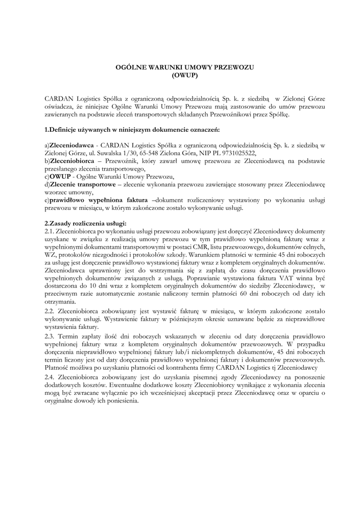 OGÓLNE WARUNKI UMOWY PRZEWOZU (OWUP) CARDAN Logistics Spółka z ograniczoną odpowiedzialnością Sp. k. z siedzibą w Zielonej Górze oświadcza, że niniejsze Ogólne Warunki Umowy Przewozu mają zastosowanie do umów przewozu zawieranych na podstawie zleceń transportowych składanych Przewoźnikowi przez Spółkę. 1.Definicje używanych w niniejszym dokumencie oznaczeń: a)Zleceniodawca - CARDAN Logistics Spółka z ograniczoną odpowiedzialnością Sp. k. z siedzibą w Zielonej Górze, ul. Suwalska 1/30, 65-548 Zielona Góra, NIP PL 9731025522, b)Zleceniobiorca – Przewoźnik, który zawarł umowę przewozu ze Zleceniodawcą na podstawie przesłanego zlecenia transportowego, c)OWUP - Ogólne Warunki Umowy Przewozu, d)Zlecenie transportowe – zlecenie wykonania przewozu zawierające stosowany przez Zleceniodawcę wzorzec umowny, e)prawidłowo wypełniona faktura –dokument rozliczeniowy wystawiony po wykonaniu usługi przewozu w miesiącu, w którym zakończone zostało wykonywanie usługi. 2.Zasady rozliczenia usługi: 2.1. Zleceniobiorca po wykonaniu usługi przewozu zobowiązany jest doręczyć Zleceniodawcy dokumenty uzyskane w związku z realizacją umowy przewozu w tym prawidłowo wypełnioną fakturę wraz z wypełnionymi dokumentami transportowymi w postaci CMR, listu przewozowego, dokumentów celnych, WZ, protokołów niezgodności i protokołów szkody. Warunkiem płatności w terminie 45 dni roboczych za usługę jest doręczenie prawidłowo wystawionej faktury wraz z kompletem oryginalnych dokumentów. Zleceniodawca uprawniony jest do wstrzymania się z zapłatą do czasu doręczenia prawidłowo wypełnionych dokumentów związanych z usługą. Poprawianie wystawiona faktura VAT winna być dostarczona do 10 dni wraz z kompletem oryginalnych dokumentów do siedziby Zleceniodawcy, w przeciwnym razie automatycznie zostanie naliczony termin płatności 60 dni roboczych od daty ich otrzymania. 2.2. Zleceniobiorca zobowiązany jest wystawić fakturę w miesiącu, w którym zakończone zostało wykonywanie usługi. Wystawienie faktury w późniejszym okresie uznawane będzie za nieprawidłowe wystawienia faktury. 2.3. Termin zapłaty ilość dni roboczych wskazanych w zleceniu od daty doręczenia prawidłowo wypełnionej faktury wraz z kompletem oryginalnych dokumentów przewozowych. W przypadku doręczenia nieprawidłowo wypełnionej faktury lub/i niekompletnych dokumentów, 45 dni roboczych termin liczony jest od daty doręczenia prawidłowo wypełnionej faktury i dokumentów przewozowych. Płatność możliwa po uzyskaniu płatności od kontrahenta firmy CARDAN Logistics tj Zleceniodawcy 2.4. Zleceniobiorca zobowiązany jest do uzyskania pisemnej zgody Zleceniodawcy na ponoszenie dodatkowych kosztów. Ewentualne dodatkowe koszty Zleceniobiorcy wynikające z wykonania zlecenia mogą być zwracane wyłącznie po ich wcześniejszej akceptacji przez Zleceniodawcę oraz w oparciu o oryginalne dowody ich poniesienia. Zleceniobiorca zobowiązany jest fakturować te koszty wyłącznie wraz z fakturą za wykonaną usługę. Nie zostaną przyjęte rachunki przesłane w późniejszym terminie. 2.5. Zleceniodawcy przysługuje prawo potrącenia wierzytelności z tytułu wszelkich wynikających ze zlecenia kar umownych i odszkodowań za które odpowiedzialność ponosi Zleceniobiorca, z przysługującą Zleceniobiorcy wierzytelnością z tytułu wynagrodzenia za wykonanie usługi przewozu. 2.6. Zleceniobiorca zobowiązany jest wystawiać dokumenty rozliczeniowe na Zleceniodawcę i doręczać na adres jego siedziby. 3.Warunki realizacji zlecenia transportowego: 3.1. Umowę przewozu na zasadach określonych w niniejszych OWUP oraz zleceniu transportowym uważa się za zawartą gdy Zleceniobiorca: a)potwierdzi jej zawarcie pisemnie na adres Spółki, b)potwierdzi jej zawarcie na pisemnie na adres e-mail: [email protected], c)nie złoży oświadczenia o odmowie przyjęcia zlecenia transportowego w przeciągu 1godziny od jego otrzymania, d)przystąpi do wykonania umowy. 3.2. Wprowadzenie jakichkolwiek zmian do niniejszych OWUP lub warunkowe przyjęcie zlecenia transportowego powodują, że zlecenia transportowe uznaje się za niezłożone. 3.3. Zleceniobiorca oświadcza, że w dacie przyjęcia zlecenia i w dacie jego realizacji posiada aktualne ubezpieczenie OCP ładunków przewoźnika niezawierające klauzul wyłączających odpowiedzialność ubezpieczyciela za utratę, ubytek, uszkodzenie przesyłki, kradzież, zaginięcie lub rabunek. Na żądanie Zleceniodawcy Zleceniobiorca zobowiązany jest okazać polisę potwierdzającą zawarcie umowy ubezpieczenia odpowiedzialności cywilnej. 3.4. Zleceniobiorca zobowiązany jest zapewnić stałą łączność z kierowcą wykonującym transport, w tym zobowiązany jest do przekazywania informacji o aktualnej pozycji samochodu na żądanie Zleceniodawcy. 3.5. Zleceniobiorca nie ma prawa bez pisemnej zgody Zleceniodawcy na dokonanie przeładunku towaru poza miejscem załadunku. 3.6. Zleceniobiorca ponosi odpowiedzialność za prawidłowy załadunek i rozmieszczenie towaru, z uwzględnieniem prawidłowego nacisku na osie pojazdu. O każdej nieprawidłowości w załadunku lub niezgodności ładunku ze zleceniem, w tym zastrzeżenia co do jakości ładunku Zleceniobiorca zobowiązany jest niezwłocznie powiadomić Zleceniodawcę, a także dokonać wpisu zastrzeżeń do CMR lub listu przewozowego. Zleceniobiorca dokonując wpis do CMR lub listu przewozowego zobowiązany jest uzyskać pisemne potwierdzenie załadowcy. 3.7. Zleceniobiorca zobowiązany jest uzyskać pisemną zgodę Zleceniodawcy na powierzenie wykonania usługi przewozu dalszym Przewoźnikom. Brak zgody skutkuje uznaniem, że umowa została wykonana nienależycie i uprawnia Zleceniodawcę do nałożenia kary umownej na Zleceniobiorcę w wysokości 100% frachtu. W przypadku wyrządzenia przez dalszego Przewoźnika szkody w mieniu Zleceniodawcy lub Klienta, Zleceniodawca uprawniony jest d