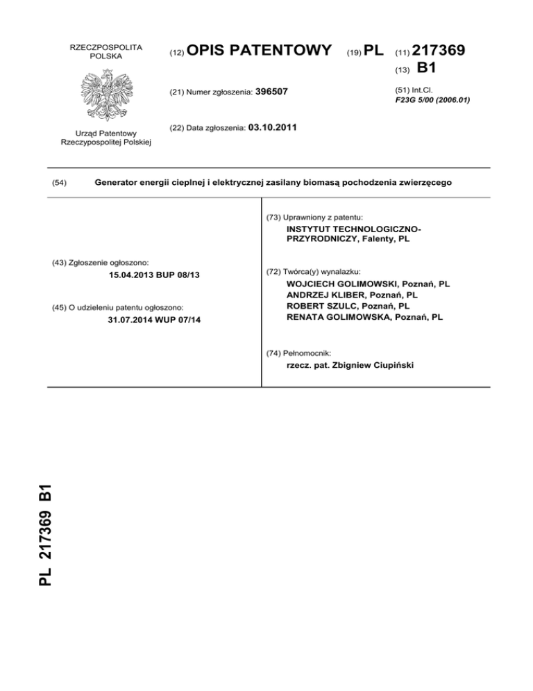 RZECZPOSPOLITA POLSKA (12) OPIS PATENTOWY (19) (21) Numer zgłoszenia: 396507 Urząd Patentowy Rzeczypospolitej Polskiej (54) PL 217369 (13) B1 (11) (51) Int.Cl. F23G 5/00 (2006.01) (22) Data zgłoszenia: 03.10.2011 Generator energii cieplnej i elektrycznej zasilany biomasą pochodzenia zwierzęcego (73) Uprawniony z patentu: INSTYTUT TECHNOLOGICZNOPRZYRODNICZY, Falenty, PL (43) Zgłoszenie ogłoszono: 15.04.2013 BUP 08/13 (45) O udzieleniu patentu ogłoszono: 31.07.2014 WUP 07/14 (72) Twórca(y) wynalazku: WOJCIECH GOLIMOWSKI, Poznań, PL ANDRZEJ KLIBER, Poznań, PL ROBERT SZULC, Poznań, PL RENATA GOLIMOWSKA, Poznań, PL (74) Pełnomocnik: PL 217369 B1 rzecz. pat. Zbigniew Ciupiński 2 PL 217 369 B1 Opis wynalazku Przedmiotem wynalazku jest generator energii cieplnej i elektrycznej zasilany biomasą pochodzenia zwierzęcego zawierający silnik spalinowy i prądnicę. Znane są kogeneracyjne agregaty prądotwórcze zasilane benzyną lub olejem napędowym. Uzyskana dodatkowo energia cieplna przekazywana z agregatu za pośrednictwem wymiennika ciepła wykorzystywana jest do celów przemysłowych lub grzewczych. Istnieją silniki spalinowe zasilane mazutem lub olejem roślinnym. Znane są agregaty prądotwórcze, gdzie do wytwarzania energii używane są silniki spalinowe zasilane biogazem uzyskanym z biomasy pochodzenia roślinnego lub zwierzęcego. W tym rozwiązaniu powstające ciepło w wyniku spalania biogazu używane jest do podgrzewania komór fermentacyjnych. Jedynie nadwyżki ciepła mogą być wykorzystane do innych celów. Zaletą tego rozwiązania jest możliwość zastosowania instalacji o dowolnej mocy, która głównie zależy od dostępności biomasy Instalacje te znalazły zastosowanie w rolnictwie jak również w przemyśle z powodu braku niekorzystnego oddziaływania na środowisko i pracy na paliwach ze źródeł odnawialnych. Do wad tej instalacji można zaliczyć głównie dużą bezwładność, ponieważ wytwarzanie biogazu nie jest w pełni kontrolowanym procesem, a zbiorniki fermentacyjne i magazynowe wymagają dużej przestrzeni. Generator energii cieplnej i elektrycznej zasilany biomasą pochodzenia zwierzęcego według wynalazku zawierający prądnicę, silnik spalinowy z chłodnicą spalin oraz wymienniki ciepła, charakteryzuje się tym, że silnik spalinowy wyposażony jest w dwa układy wymiany ciepła, które odprowadzają energię cieplną ze spalin i z instalacji chłodzącej silnik. Ciepło ze spalin odprowadzane jest przewodami do wężownicy znajdującej się w zbiorniku wypełnionym smalcem, który stanowi główne paliwo silnika spalinowego, oraz do wężownicy znajdującej się w zbiorniku wypełnionym wodą stanowiącym akumulator ciepła. Wężownice zakończone są zaworami. Natomiast ciepło z instalacji chłodzącej blok silnika doprowadzane jest przewodami do wymiennika ciepła, który znajduje się również w zbiorniku wypełnionym smalcem. Wymiennik ciepła połączony jest za pomocą zaworów z innym wymiennikiem ciepła umieszczonym w zbiorniku z wodą. Pompa wtryskowa silnika podłączona jest do zaworu trójdzielnego, który połączony jest z przewodem paliwowym zakończonym filtrem w zbiorniku zawierającym olej napędowy lub olej opałowy oraz z innym przewodem paliwowym umieszczonym wewnątrz przewodu instalacji chłodzącej silnik i zakończonym filtrem znajdującym się w zbiorniku ze smalcem. Silnik spalinowy uruchamiany jest na olej napędowy lub olej opałowy pobierany za pośrednictwem odpowiednio nastawionego zaworu trójdrożnego. Po rozgrzaniu cieczy w instalacji chłodzącej silnika ciecz doprowadzana jest przewodem do wymiennika ciepła znajdującego się w zbiorniku ze smalcem. Przewód paliwowy będący wewnątrz tego przewodu nagrzewa się nagrzewając tłuszcz zwierzęcy w postaci smalcu zawarty w nim oraz następuje podgrzewanie smalcu znajdującego się w zbiorniku. Ciecz krąży w małym obiegu do momentu osiągnięcia temperatury smalcu powyżej 60°C. Następuje przesterowanie zaworów i ciecz kierowana jest do wężownicy znajdującej się w zbiorniku wypełnionym wodą krążąc w dużym obiegu oraz oddając ciepło wodzie. Ciecz chłodząca silnik w pierwszej kolejności wykorzystywana jest do podgrzania lub podtrzymywania temperatury smalcu powyżej 60°C, a nadwyżki ciepła kierowane są do zbiornika z wodą stanowiącego akumulator ciepła. W tym samym czasie zawór trójdrożny zostaje przełączony i silnik zaczyna pracować na rozgrzanym smalcu. Powstające spaliny ogrzewają wodę w chłodnicy spalin, która trafia za pośrednictwem zaworów do określonych wężownic w zależności od potrzeb. Jeżeli smalec wytracił podwyższoną temperaturę to ciepło z chłodnicy spalin zostaje użyte do podniesienia jego temperatury. W innym przypadku ciepła woda z chłodnicy spalin ogrzewa wodę w zbiorniku będącym akumulatorem ciepła, który podłączony jest króćcami do sieci grzewczej. Silnik spalinowy napędza prądnicę. Generator stanowi rozwiązanie dostarczające głównie energię cieplną w zależności od potrzeb, a powstający prąd elektryczny jest produktem ubocznym sprzedawanym do sieci energetycznej. Generator energii cieplnej i elektrycznej według wynalazku umożliwia wykorzystanie jako paliwo bezpośrednio biomasę pochodzenia zwierzęcego w postaci smalcu. Powstający jako produkt uboczny w przemyśle spożywczym tłuszcz zwierzęcy uzyskiwany jest w nadmiernych ilościach i poszukuje się rozwiązań umożliwiających jego zagospodarowanie. Tłuszcz zwierzęcy jest trudny do utylizacji. Ponadto zaletą tego rozwiązania jest jego mała bezwładność i możliwość dynamicznego sterowania poziomem mocy w zależności od potrzeb Generator może być w pełni wykorzystany zimą do podgrzewania wody w sieci centralnego ogrzewania, natomiast latem może służyć do podgrzewania wody bieżącej lub zasilenia suszarni w gospodarstwie rolnym. PL 217 369 B1 3 Przedmiot wynalazku uwidoczniony