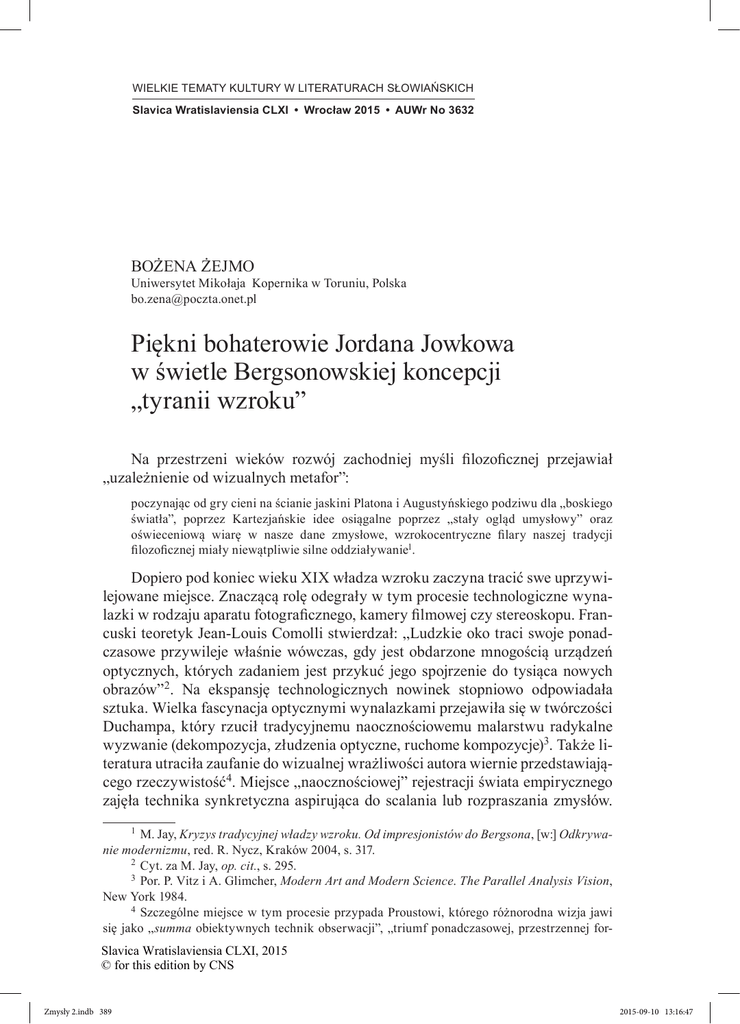 WIELKIE TEMATY KULTURY W LITERATURACH SŁOWIAŃSKICH Slavica Wratislaviensia CLXI • Wrocław 2015 • AUWr No 3632 BOŻENA ŻEJMO Uniwersytet Mikołaja Kopernika w Toruniu, Polska [email protected] Piękni bohaterowie Jordana Jowkowa w świetle Bergsonowskiej koncepcji „tyranii wzroku” Na przestrzeni wieków rozwój zachodniej myśli filozoficznej przejawiał „uzależnienie od wizualnych metafor”: poczynając od gry cieni na ścianie jaskini Platona i Augustyńskiego podziwu dla „boskiego światła”, poprzez Kartezjańskie idee osiągalne poprzez „stały ogląd umysłowy” oraz oświeceniową wiarę w nasze dane zmysłowe, wzrokocentryczne filary naszej tradycji filozoficznej miały niewątpliwie silne oddziaływanie1. Dopiero pod koniec wieku XIX władza wzroku zaczyna tracić swe uprzywilejowane miejsce. Znaczącą rolę odegrały w tym procesie technologiczne wynalazki w rodzaju aparatu fotograficznego, kamery filmowej czy stereoskopu. Francuski teoretyk Jean-Louis Comolli stwierdzał: „Ludzkie oko traci swoje ponadczasowe przywileje właśnie wówczas, gdy jest obdarzone mnogością urządzeń optycznych, których zadaniem jest przykuć jego spojrzenie do tysiąca nowych obrazów”2. Na ekspansję technologicznych nowinek stopniowo odpowiadała sztuka. Wielka fascynacja optycznymi wynalazkami przejawiła się w twórczości Duchampa, który rzucił tradycyjnemu naocznościowemu malarstwu radykalne wyzwanie (dekompozycja, złudzenia optyczne, ruchome kompozycje)3. Także literatura utraciła zaufanie do wizualnej wrażliwości autora wiernie przedstawiającego rzeczywistość4. Miejsce „naocznościowej” rejestracji świata empirycznego zajęła technika synkretyczna aspirująca do scalania lub rozpraszania zmysłów. 1 M. Jay, Kryzys tradycyjnej władzy wzroku. Od impresjonistów do Bergsona, [w:] Odkrywanie modernizmu, red. R. Nycz, Kraków 2004, s. 317. 2 Cyt. za M. Jay, op. cit., s. 295. 3 Por. P. Vitz i A. Glimcher, Modern Art and Modern Science. The Parallel Analysis Vision, New York 1984. 4 Szczególne miejsce w tym procesie przypada Proustowi, którego różnorodna wizja jawi się jako „summa obiektywnych technik obserwacji”, „triumf ponadczasowej, przestrzennej for- Slavica Wratislaviensia CLXI, 2015 © for this edition by CNS Zmysły 2.indb 389 2015-09-10 13:16:47 390 • Bożena Żejmo W ślad za malarstwem wskrzeszono w literaturze kolor, czego konsekwencje były najbardziej widoczne w poezji symbolistów. W sposób oczywisty pojawiła się także atencja, jaką obdarzano muzyczność poezji. W filozofii radykalnego przesunięcia dokonał Nietzsche — śmierć Boga znaczyła koniec boskiej perspektywy, zastąpionej teraz „wielością partykularnych perspektyw”5. Jednak za najbardziej wpływowego inicjatora destrukcji wzrokocentrycznego paradygmatu uznaje się Henriego Bergsona. Tyranii oka filozof przeciwstawił prawa ciała. W dziele Materia i pamięć (1896) postulował, by nie interpretować ciała jako obiektu kontemplacji, lecz jako podstawę naszego działania w świecie. Podstawowa prawda o żywym ciele wyraża się poprzez jego ruchliwość, jego zdolność bycia nośnikiem ludzkich wyborów. W Pamięci i życiu Bergson pisał: „Moje ciało jest w całości świata materialnego obrazem, który działa podobnie jak inne obrazy, otrzymując i oddając ruch z tą tylko może różnicą, że moje ciało zdaje się w pewnej mierze wybierać sposób zwracania tego, co otrzymuje”6. Rola obrazu jako ciała polega na wywieraniu realnego wpływu na inne obrazy, a tym samym na „wyborze między różnymi fizycznie możliwymi posunięciami”7. Właśnie ruchliwość ciała implikuje konstytutywną dla funkcjonowania ludzkiej świadomości pamięć, która w aktach retrospekcji pozwala na uobecnienie przeszłego8. Bergson pisze: Nasze postrzeżenie, nawet najbardziej momentalne, składa sie z nieprzeliczonej wielości przypomnianych czynników; prawdę mówiąc, wszelkie postrzeganie jest już pamięcią. Praktycznie postrzegamy tylko przeszłość, bowiem czysta teraźniejszość jest nieuchwytnym postępowaniem naprzód przeszłości pochłaniającej przyszłość9. Witalistyczna skłonność Bergsona do waloryzacji życia została rozwinięta w następnym dziele z roku 1907 — Ewolucja twórcza. Chcąc podkreślić tyranię wzroku, filozof przywołał metaforę kinematografu oddającą zwodnicze pojmowanie czasu. Filozofia Bergsona była inspiracją zwłaszcza dla imażynistów i kubistów, nawet kiedy w okresie międzywojennym jego sława przygasła pod naporem zarzutów irracjonalizmu, a także w wyniku zmiany nastrojów po wojnie, Bergson nadal cieszył się znacznym wpływem10. my, stworzonej przez boskie oko patrzące z oddali na raczej równoległe niż sukcesywne skrawki czasu”. Zob. T. Swoboda, Historie oka, Gdańsk 2010, s. 18, 320. 5 M. Jay, op. cit., s. 340–341. 6 H. Bergson, Pamięć i życie, przeł. A. Szczepańska, Warszawa 1988, s. 66. O wielości odczytań filozofii Bergsona i sporach o jego eidos, którym dla jednych jest intuicja, dla drugich trwanie, dla trzecich dynamiczna metafizyka, dla innych jeszcze biologizm i pęd witalny lub pojęcie różnicy, zob. B. Skarga, Czas i trwanie. Studia o Bergsonie, Warszawa 1982. 7 H. Bergson, op. cit., s. 67. 8 H. Bergson, Materia i pamięć, przeł. W. Filewicz, Warszawa 1926, s. 33–34, 72, 136, 229. 9 Ibidem, s. 74. 10 O wpływie Bergsona na poglądy estetyczne XX wieku, zob. W. Tatarkiewicz, Estetyka Bergsona i sztuka jego czasów, [w:] idem, Droga przez estetykę, Warszawa 1972. Slavica Wratislaviensia CLXI, 2015 © for this edition by CNS Zmysły 2.indb 390 2015-09-10 13:16:47 Piękni bohaterowie Jordana Jowkowa • 391 Czytelnik bułgarski poznał myśl Bergsona w latach 20. XX wieku głównie dzięki artykułom publikowanym na łamach czasopism o orientacji symbolistycznej „Хиперион” i „Листопад”. Podstawowe pytania, jakie się w nich poja