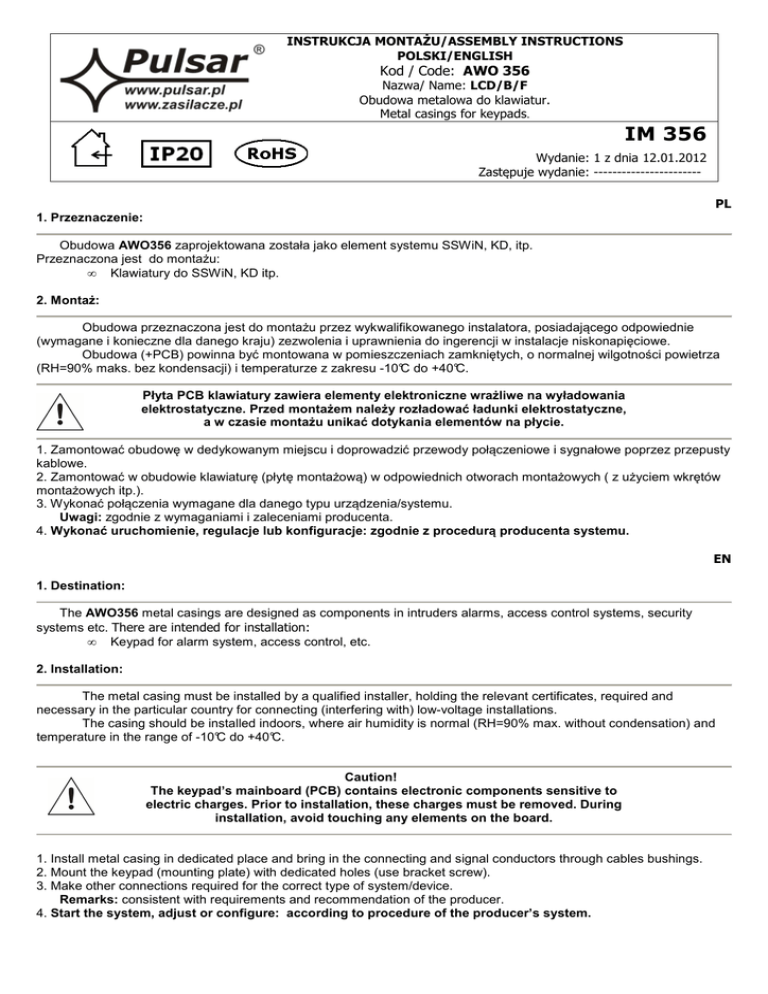 INSTRUKCJA MONTAŻU/ASSEMBLY INSTRUCTIONS POLSKI/ENGLISH Kod / Code: AWO 356 Nazwa/ Name: LCD/B/F Obudowa metalowa do klawiatur. Metal casings for keypads. IM 356 Wydanie: 1 z dnia 12.01.2012 Zastępuje wydanie: ----------------------PL 1. Przeznaczenie: Obudowa AWO356 zaprojektowana została jako element systemu SSWiN, KD, itp. Przeznaczona jest do montażu: • Klawiatury do SSWiN, KD itp. 2. Montaż: Obudowa przeznaczona jest do montażu przez wykwalifikowanego instalatora, posiadającego odpowiednie (wymagane i konieczne dla danego kraju) zezwolenia i uprawnienia do ingerencji w instalacje niskonapięciowe. Obudowa (+PCB) powinna być montowana w pomieszczeniach zamkniętych, o normalnej wilgotności powietrza (RH=90% maks. bez kondensacji) i temperaturze z zakresu -10°C do +40°C. Płyta PCB klawiatury zawiera elementy elektroniczne wrażliwe na wyładowania elektrostatyczne. Przed montażem należy rozładować ładunki elektrostatyczne, a w czasie montażu unikać dotykania elementów na płycie. 1. Zamontować obudowę w dedykowanym miejscu i doprowadzić przewody połączeniowe i sygnałowe poprzez przepusty kablowe. 2. Zamontować w obudowie klawiaturę (płytę montażową) w odpowiednich otworach montażowych ( z użyciem wkrętów montażowych itp.). 3. Wykonać połączenia wymagane dla danego typu urządzenia/systemu. Uwagi: zgodnie z wymaganiami i zaleceniami producenta. 4. Wykonać uruchomienie, regulacje lub konfiguracje: zgodnie z procedurą producenta systemu. EN 1. Destination: The AWO356 metal casings are designed as components in intruders alarms, access control systems, security systems etc. There are intended for installation: • Keypad for alarm system, access control, etc. 2. Installation: The metal casing must be installed by a qualified installer, holding the relevant certificates, required and necessary in the particular country for connecting (interfering with) low-voltage installations. The casing should be installed indoors, where air humidity is normal (RH=90% max. without condensation) and temperature in the range of -10°C do +40°C. Caution! The keypad’s mainboard (PCB) contains electronic components sensitive to electric charges. Prior to installation, these charges must be removed. During installation, avoid touching any elements on the board. 1. Install metal casing in dedicated place and bring in the connecting and signal conductors through cables bushings. 2. Mount the keypad (mounting plate) with dedicated holes (use bracket screw). 3. Make other connections required for the correct type of system/device. Remarks: consistent with requirements and recommendation of the producer. 4. Start the system, adjust or configure: according to procedure of the producer’s system. PL/EN 3. Parametry techniczne / Technical data: PARAMETRY TECHNICZNE / TECHNICAL DATA Zabezpieczenie antysabotażowe Tamper protection 1x – otwarcie obudowy 1x – opening casing Obciążalność wyjścia TAMPER- max Output current TAMPER - max 500mA@50Vdc Obudowa: IP Casing: IP IP 20 Temperatura pracy Operating temperature -10ºC÷40ºC Wilgotność względna RH – max. Relative humidity RH – max. 90 [%] Wymiary wewnętrzne (szer x wys x głęb) Dimensions internal (W x H x D) wykonanie Material description 250 x 160 x 60 [+/-2]mm Blacha DC01, grubość: 0,7mm Zabezpieczenie antykorozyjne Kolor: RAL 9003/ Sheet steel DC01, Thickness: 0,7mm, Protection anticorrosion, Color: RAL9003 zastosowanie Destination Do wewnątrz/Indoor Zamykanie Closing zamek- 2 klucze / lockable - 2 keys Waga netto Net Weight 1,20 Kg Waga brutto Gross Weight 1,30 Kg Uwagi Notes podtynkowa, demontowalna płyta montażowa / flush type, removable mounting plate 4. Klawiatury które można zamontować w tej obudowie / keypads which can be mounted in the casing. DSC: RK 5506, RK 5508Z, RK 5516, RK 5532, LCD-600, LCD-4500, LCD-5500, RK 5500Z FBII: XK 206, STOCK 406, 6805, XL 4600 SM, XL 4612 SM, XK7LC, XK708, OMNIKPLCD SCANTRONIC: KP600L, EKP1, SIC-1L, KP 2000 ROKONET: RP 296 KLC, RP 296 KCS, RP 296 KL8, RP 296 KL16, PROSYS LCD RP 128 KLC PARADOX: 626, 629, 633, 639, DIGIPLEX DGP-641 LCD, DGP-610 LED, DGP-620 LED, SPECTRA 1686 V (696), NAPCO: RP1054E, RP1016E, RP1000E, GEM-RP2AS, GEM-RP3S, GSM-RP8, GEM-RP1Cae2, GEM-RP2Ase2, GEM3Se2 SATEL: CA-5 KLCD-L, CA-10 KLCD-L, CA-64 KLCD-L,INTEGRA KLCD (KLCD-R), CA-4V KLED, CA-6 KLED, CA 10 KLED, CA-64 S, CA-64 SZ, SZW-02 CA-5 KLED-S, CA-6 KLED-S, CA 10 KLED-S CADDX NETWORX: NX-148E(LCD), NX-1348E (LCD-ikona), NX-108E, NX-116E, NX-124E (LED) GALAXY: MK-5 (CP-25) VISONIC: KP-1002LCD, 1001/8LED, 1001/16LED PYRONIX : MATRIX LCD FP 12610 ELKRON: KP100D, KP100, KP200D, KP106 ADEMCO: AD6139 PIMA: RX-400 SUMMIT: LED 3106, LCD 3108, PENTA 2 PL/EN OGÓLNE WARUNKI GWARANCJI 1. Pulsar K. Bogusz Sp.j. (producent) udziela dwuletniej gwarancji jakości na urządzenia, począwszy od daty nabycia zamieszczonej na dowodzie zakupu. 2. W przypadku braku dowodu zakupu przy zgłoszeniu reklamacji, trzyletni okres gwarancji jest liczony od daty produkcji urządzenia. 3. Gwarancja obejmuje nieodpłatną naprawę lub wymianę na odpowiednik funkcjonalny (wyboru dokonuje producent) niesprawnego urządzenia z przyczyn zależnych od producenta, w tym wad produkcyjnych i materiałowych, o ile wady zostały zgłoszone w okresie gwarancji (pkt.1 i 2). 4. Podlegający gwarancji sprzęt należy dostarczyć do punktu, w którym został on zakupiony lub bezpośrednio do siedziby producenta. 5. Gwarancją objęte są urządzenia kompletne z pisemnie określonym rodzajem wady w poprawnie wypełnionym zgłoszeniu reklamacyjnym. 6. Producent, w razie uwzględnienia reklamacji, zobowiązuje się do dokonania napraw gwarancyjnych w możliwie najkrótszym terminie, nie dłuższym jednak niż 14 dni roboczych od daty dostarczenia urządzenia do serwisu producenta. 7. Okres naprawy z pkt. 6 może być przedłużony w przypadku braku możliwości technicznych dokonania naprawy oraz w przypadku sprzętu przyj