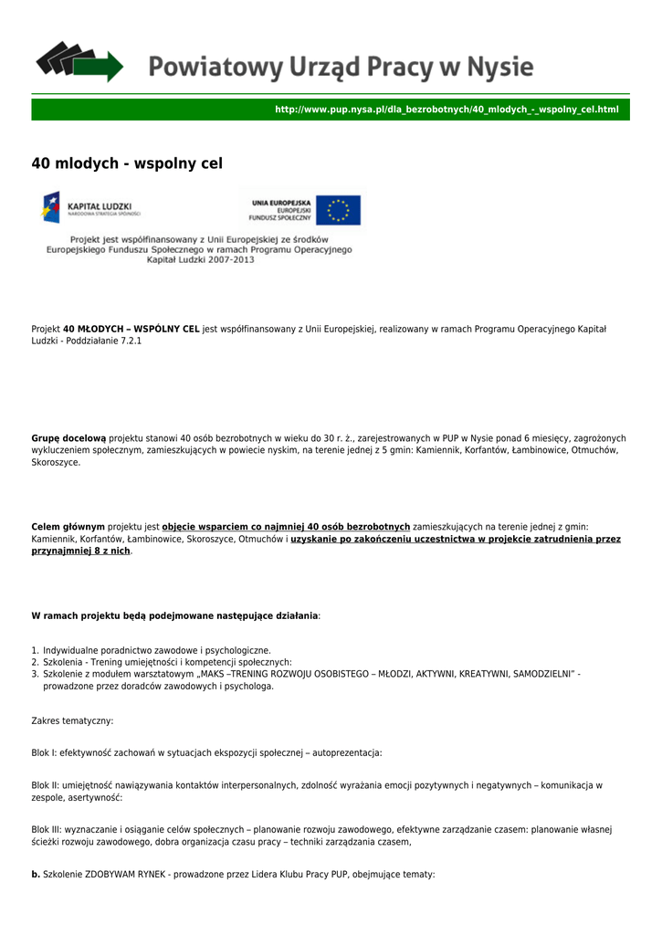 http://www.pup.nysa.pl/dla_bezrobotnych/40_mlodych_-_wspolny_cel.html 40 mlodych - wspolny cel Projekt 40 MŁODYCH – WSPÓLNY CEL jest współfinansowany z Unii Europejskiej, realizowany w ramach Programu Operacyjnego Kapitał Ludzki - Poddziałanie 7.2.1 Grupę docelową projektu stanowi 40 osób bezrobotnych w wieku do 30 r. ż., zarejestrowanych w PUP w Nysie ponad 6 miesięcy, zagrożonych wykluczeniem społecznym, zamieszkujących w powiecie nyskim, na terenie jednej z 5 gmin: Kamiennik, Korfantów, Łambinowice, Otmuchów, Skoroszyce. Celem głównym projektu jest objęcie wsparciem co najmniej 40 osób bezrobotnych zamieszkujących na terenie jednej z gmin: Kamiennik, Korfantów, Łambinowice, Skoroszyce, Otmuchów i uzyskanie po zakończeniu uczestnictwa w projekcie zatrudnienia przez przynajmniej 8 z nich. W ramach projektu będą podejmowane następujące działania: 1. Indywidualne poradnictwo zawodowe i psychologiczne. 2. Szkolenia - Trening umiejętności i kompetencji społecznych: 3. Szkolenie z modułem warsztatowym „MAKS –TRENING ROZWOJU OSOBISTEGO – MŁODZI, AKTYWNI, KREATYWNI, SAMODZIELNI” prowadzone przez doradców zawodowych i psychologa. Zakres tematyczny: Blok I: efektywność zachowań w sytuacjach ekspozycji społecznej – autoprezentacja: Blok II: umiejętność nawiązywania kontaktów interpersonalnych, zdolność wyrażania emocji pozytywnych i negatywnych – komunikacja w zespole, asertywność: Blok III: wyznaczanie i osiąganie celów społecznych – planowanie rozwoju zawodowego, efektywne zarządzanie czasem: planowanie własnej ścieżki rozwoju zawodowego, dobra organizacja czasu pracy – techniki zarządzania czasem, b. Szkolenie ZDOBYWAM RYNEK - prowadzone przez Lidera Klubu Pracy PUP, obejmujące tematy: - tworzenie profesjonalnych dokumentów aplikacyjnych, - metody rekrutacji, - autoprezentacja w kontakcie z pracodawcą, - skuteczna komunikacja i praca zespołowa, - młodzi na rynku pracy, - aktywne metody poszukiwania pracy. 1. 2. 3. 4. Partnerski Klub Wsparcia. Szkolenia zawodowe. Pośrednictwo pracy. Staże. Działania w projekcie będą realizowane przez PUP Nysa w partnerstwie z 5 gminami: Gminą Kamiennik, Gminą Korfantów, Gminą Łambinowice, Gminą Otmuchów, Gminą Skoroszyce. Partnerzy ze swojej strony wniosą do projektu zasoby ludzkie (koordynatorzy) i techniczno - organizacyjne w postaci wyposażonych sal do przeprowadzenia indywidualnego poradnictwa psychologicznego i zawodowego. Będą zaangażowani także w działania promocyjne i rekrutacyjne - zadbają o prawidłowe rozpowszechnianie informacji o projekcie, m.in. za pomocą plakatów informacyjnych, na terenie gminy, z naciskiem na Ośrodki Pomocy Społecznej. Okres realizacji projektu: 01.01.2014 – 30.06.2015 r.