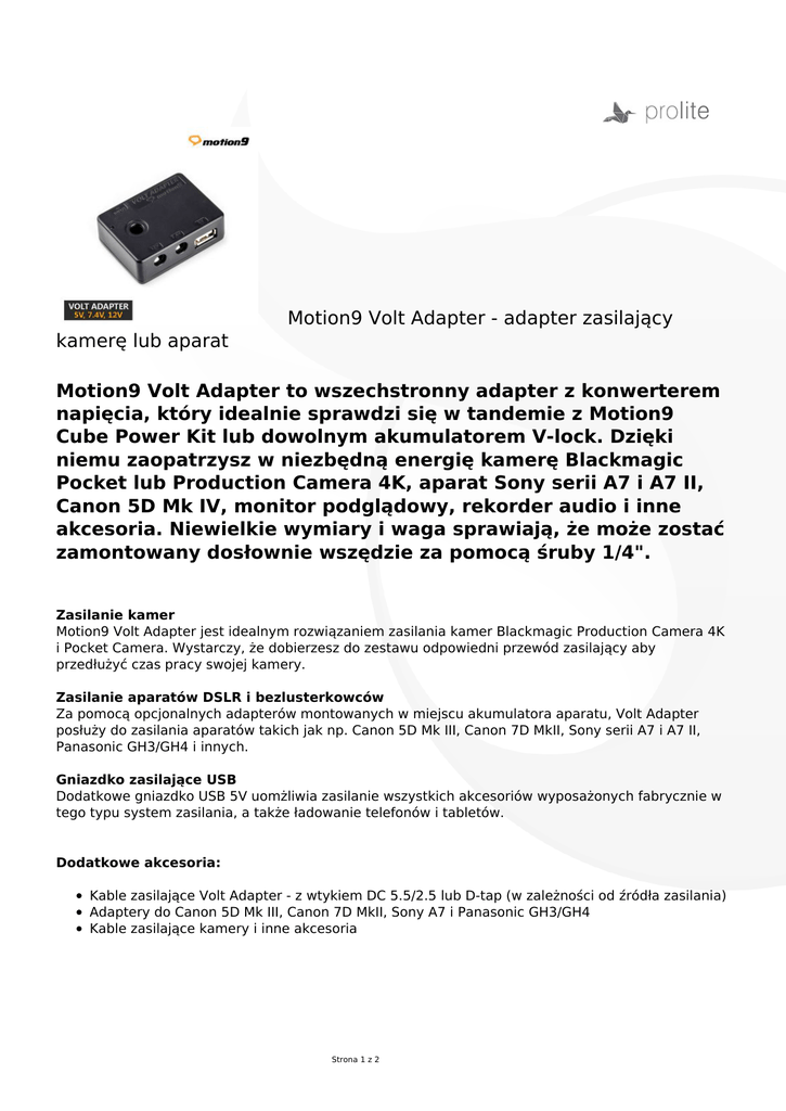Motion9 Volt Adapter - adapter zasilający kamerę lub aparat Motion9 Volt Adapter to wszechstronny adapter z konwerterem napięcia, który idealnie sprawdzi się w tandemie z Motion9 Cube Power Kit lub dowolnym akumulatorem V-lock. Dzięki niemu zaopatrzysz w niezbędną energię kamerę Blackmagic Pocket lub Production Camera 4K, aparat Sony serii A7 i A7 II, Canon 5D Mk IV, monitor podglądowy, rekorder audio i inne akcesoria. Niewielkie wymiary i waga sprawiają, że może zostać zamontowany dosłownie wszędzie za pomocą śruby 1/4". Zasilanie kamer Motion9 Volt Adapter jest idealnym rozwiązaniem zasilania kamer Blackmagic Production Camera 4K i Pocket Camera. Wystarczy, że dobierzesz do zestawu odpowiedni przewód zasilający aby przedłużyć czas pracy swojej kamery. Zasilanie aparatów DSLR i bezlusterkowców Za pomocą opcjonalnych adapterów montowanych w miejscu akumulatora aparatu, Volt Adapter posłuży do zasilania aparatów takich jak np. Canon 5D Mk III, Canon 7D MkII, Sony serii A7 i A7 II, Panasonic GH3/GH4 i innych. Gniazdko zasilające USB Dodatkowe gniazdko USB 5V uomżliwia zasilanie wszystkich akcesoriów wyposażonych fabrycznie w tego typu system zasilania, a także ładowanie telefonów i tabletów. Dodatkowe akcesoria: Kable zasilające Volt Adapter - z wtykiem DC 5.5/2.5 lub D-tap (w zależności od źródła zasilania) Adaptery do Canon 5D Mk III, Canon 7D MkII, Sony A7 i Panasonic GH3/GH4 Kable zasilające kamery i inne akcesoria Strona 1 z 2 Specyfikacja: Wejście DC - 12~20V (gniazdo DC 5.5/2.1mm) Wyjścia DC - 5V (USB), 7.4V (gniazdo DC 5.5/2.1mm) do zasilania aparatów, 12V (gniazdo DC 5.5/2.1mm) Dioda LED sygnalizująca pracę adaptera Zabezpieczenie przed przeciążeniem i zwarciem Śruba 1/4" do montażu adaptera Wymiary - 58 x 45 x 19mm Waga - 70g Zawartość zestawu: Motion9 Volt Adapter Kabel 15cm z wtykiem 2 x DC 5.5/2.1mm Śruba 1/4" Kluczyk imbusowy Strona 2 z 2