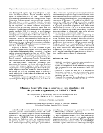 Czym jest upoledzenie funkcjonowania?jako Jakniezale¿nej oddzieliæ niepe³nosprawnoæ od istotnoci klinicznej W³¹czenie konstruktu niepe³nosprawnoci osi do systemów diagnostycznych DSM-V i ICD-11 rzeñ depresyjnych (oprócz tego, ¿e jest to jeden z objawów nie-diagnostycznych innych epizodów depresyjnych). W kryteriach DSM-IV dla fobii i OCD, cierpienie jest markerem ciê¿koci/nasilenia (równorzêdnym z upoledzeniem funkcjonowania), oraz ma taki sam status jak lêk, czyli stanowi podstawow¹ cechê objawów osiowych (np. nawracaj¹ce myli w OCD musz¹ powodowaæ znaczny lêk lub cierpienie). W ICD-10 cierpienie emocjonalne wymagane jest jako odrêbny, niezale¿ny objaw fobii (nie po³¹czony z upoledzeniem funkcjonowania), oraz stanowi marker nasilenia OCD (równorzêdny z upoledzeniem funkcjonowania), lecz nie jest wymieniane jako cecha charakterystyczna osiowych objawów fobii lub OCD. W kryteriach ICD-10 dla zaburzenia somatyzacyjnego uporczywe cierpienie prowadzi do wielokrotnego zg³aszania siê po opiekê zdrowotn¹, lecz nie ma tego w kryteriach DSM-IV. Lêk separacyjny musi obejmowaæ nawracaj¹ce, nadmierne cierpienie (DSM-IV) lub nadmierne, nawracaj¹ce cierpienie (ICD-10) zwi¹zane z separacj¹. Przyk³ady te pokazuj¹, ¿e w obu systemach diagnostycznych cierpienie wystêpuje jako niezale¿ny objaw, jako wskanik kwalifikuj¹cy okrelaj¹cy inne objawy, oraz jako ogólna miara nasilenia/ciê¿koci, lecz ani w DSM-IV, ani w ICD-10 nie podano definicji tego terminu, a zatem interpretacje odnonych kryteriów diagnostycznych mog¹ byæ bardzo rozmaite. Czêste pos³ugiwanie siê ró¿nymi wskaxnikami okrelaj¹cymi poziom cierpienia (kliniczne istotne, znacznego stopnia nadmierne, itd.) nasuwa przypuszczenie, ¿e konstrukt cierpienia traktowany jest jako wymiar, który przycina siê tak, by s³u¿y³ jako kryterium diagnostyczne poszczególnych kategorii, lecz w tych systemach diagnostycznych nie ocenia siê stopnia cierpienia i nie podaje siê dalszych informacji jasno okrelaj¹cych punkt odciêcia dla cierpienia które jest i które nie jest diagnostycznie istotne. Potencjalne wy³¹czenie upoledzenia funkcjonowania sporód kryteriów diagnostycznych powoduje, ¿e w DSM-IV 229 i ICD-10 znacznie wyraniej widaæ niespecyficzne i niekonsekwentne pos³ugiwanie siê pojêciem cierpienia, poniewa¿ cierpienie najczêciej u¿ywane jest obecnie jako miara ciê¿koci zaburzenia równorzêdna z upoledzeniem funkcjonowania. W literaturze [4] istnieje wiele definicji cierpienia, lecz nadal nie ma jednej, powszechnie przyjêtej i nieprawdopodobne jest, aby taka definicja pojawi³a siê w daj¹cej siê przewidzieæ przysz³oci. Jeli zatem termin ten ma pozostaæ w DSM-V i ICD-10, to w glosariuszu musi znaleæ siê jednoznaczna definicja operacyjna cierpienia, jasno odró¿niaj¹ca je od depresji i lêku, trzeba te¿ opracowaæ metodê do oceny nasilenia cierpienia. Jeli nie jest mo¿liwe opracowanie specyficznej, nie nak³adaj¹cej siê czêciowo na inne pojêcia, operacyjnej definicji cierpienia, s¹dzê, ¿e by³oby wskazane ca³kowicie usun¹æ cierpienie z kryteriów diagnostycznych i z oceny upoledzenia funkcjonowania. Jeli opracowanie takiej definicji jest mo¿liwe, to uwa¿am, ¿e by³oby wskazane w³¹czenie cierpienia jako jednego z wymiarów sk³adowych przy ocenie upoledzenia funkcjonowania we wszystkich zaburzeniach (tzn. nie jako czêci kryteriów diagnostycznych), oraz byæ mo¿e jako objawu wymaganego lub do wyboru w niektórych specyficznych zaburzeniach. PIMIENNICTWO 1. Mulder RT. An epidemic of depression or the medicalization of distress? Perspect Biol Med 2008; 51: 23850. 2. Horwitz AV. Distinguishing distress from disorder as psychological outcomes of stressful social arrangements. Health 2007; 11: 27389. 3. Wakefield JC, Schmitz MF, First MB et al. Extending the bereavement exclusion for major depression to other losses: evidence from the National Comorbidity Survey. Arch Gen Psychiatry 2007; 64: 43340. 4. Wheaton B. The twain meet: distress, disorder and the continuing conundrum of categories. Health 2007; 11: 30319. __________________ W³¹czenie konstruktu niepe³nosprawnoci jako niezale¿nej osi do systemów diagnostycznych DSM-V i ICD-11 The incorporation of the disability construct as an independent axis in the DSM-V and ICD-11 diagnostic systems JOSÉ LUIS VÁZQUEZ-BAROQUERO Department of Psychiatry, University Hospital Marques do Valdecilla, CIBERSAM, University of Cantabria, Santander 39008, Hiszpania Üstün i Kennedy w swoim artykule obszernie omawiaj¹ znaczenie, jakie ma w³¹czenie funkcjonowania lub niepe³nosprawnoci do procesu diagnozy i oceny zdrowia psychicznego, a tak¿e analizuj¹ ró¿ne ujêcia tego konstruktu i jego oceny w ICD i DSM. Autorzy dochodz¹ do wniosku, ¿e chocia¿ ani funkcjonowanie, ani niepe³nosprawnoæ nie powinny pojawiaæ siê jako czêæ progu rozpoznawania w planowanej nowej wersji ¿adnego z tych systemów, potrzebne jest miêdzynarodowe zgodne stanowisko ICD i DSM co do tego konstruktu i jego oceny. Nasuwa siê tu kilka zasadniczych pytañ. Po pierwsze, czy pojêcie niepe³nosprawnoci nale¿y uznaæ za wa¿ne dla zdrowia psychicznego; po drugie, czy odnone wskaniki niepe³nosprawnoci (w terminologii DSM upoledzenia funkcjonowania) powinno siê w³¹czyæ do ICD i DSM jako niezale¿ne kryteria rozpoznawania zaburzeñ psychicznych; 230 FORUM: Rola upoledzenia funkcjonowania w diagnostyce zaburzeñ psychicznych: w stronê ICD-11 i DSM-V i wreszcie, czy mamy rzetelne i miêdzykulturowo trafne narzêdzia od oceny tego konstruktu. Powszechnie przyjmuje siê, ¿e niepe³nosprawnoæ stanowi konstrukt istotny dla zdrowia psychicznego i ¿e ma donios³e implikacje dla kategoryzacji klinicznego przebiegu zaburzeñ psychicznych i ich prognozy [1]. Co wiêcej, istnieje wystarczaj¹co wiele dowodów by twierdziæ, ¿e konstrukt ten nale¿y braæ pod uwagê przy planowaniu interwencji [2] oraz w ocenie odpowiedzi na leczenie, a ta