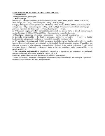 INDYWIDUALNE ZAWODY LEKKOATLETYCZNE 1. Uczestnictwo: startują uczniowie gimnazjów. 2. Konkurencje: Dziewczęta: 100mppł. (rozstaw płotków dla młodziczki), 100m, 300m, 600m, 1000m, skok w dal, skok wzwyż, kula - 3 kg., rzut oszczepem – 600 g., dysk (0,75 kg). Chłopcy: 110mppł.( rozstaw płotków dla młodzika), 100m, 300m, 1000m, 2000m, skok w dal, skok wzwyż, kula - 5 kg., rzut oszczepem – 600 g., dysk (1,0 kg). W skoku wzwyż w finale obowiązuje pierwsza wysokość dla dziewcząt – 130 cm, dla chłopców – 145 cm. 3. W każdym etapie zawodów zawodniczka/zawodnik ma prawo startu w dwóch konkurencjach oprócz biegających 600m, 1000m i 2000m – dla nich start w jednej konkurencji. 4. Obowiązuje zgłoszenie w/g wzoru – patrz zał. nr 4 – jest to warunek uczestnictwa. 5. Zawody wojewódzkie - do finałów awansują mistrzowie powiatów + 4 osoby w każdej konkurencji z najlepszymi wynikami ze wszystkich zawodów powiatowych. 6. W wyjątkowych sytuacjach WSZS ma prawo kwalifikować do finału osoby, które w wyniku zdarzeń losowych nie mogły uczestniczyć w eliminacjach lub nie uzyskały awansu. Warunkiem jest pisemny wniosek z wiarygodnym uzasadnieniem złożony przez szkołę minimum 7 dni przed terminem imprezy finałowej, a dotyczyć może wyłącznie członków kadry wojewódzkiej – co potwierdzi ZZLA. 7. Do zawodów wojewódzkich obowiązuje komunikat – zgłoszenie do zawodów na podstawie przeprowadzonych mistrzostw powiatów – patrz zał. nr 4. Podajemy obowiązkowo wyniki 4 najlepszych z każdej konkurencji. Termin zgłoszenia – minimum 10 dni przed finałem (decyduje data stempla pocztowego). Zgłoszenia niepełne lub po terminie nie będą uwzględnione.