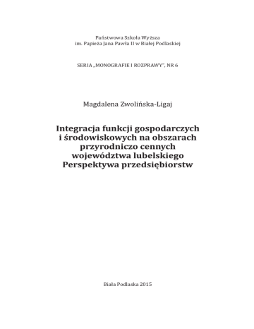 Państwowa Szkoła Wyższa im. Papieża Jana Pawła II w Białej Podlaskiej SERIA „MONOGRAFIE I ROZPRAWY”, NR 6 Magdalena Zwolińska-Ligaj Integracja funkcji gospodarczych i środowiskowych na obszarach przyrodniczo cennych województwa lubelskiego Perspektywa przedsiębiorstw Biała Podlaska 2015 Wydawca: Państwowa Szkoła Wyższa im. Papieża Jana Pawła II w Białej Podlaskiej Recenzenci: prof. zw. dr hab. Mieczysław Adamowicz prof. zw. dr hab. Dionizy Niezgoda Opracowanie przygotowano w ramach projektu badawczego nr 2011/01/D/HS4/03927 pt.: „Ekologiczne uwarunkowania i czynniki rozwoju funkcji gospodarczych na obszarach przyrodniczo cennych województwa lubelskiego” finansowanego ze środków Narodowego Centrum Nauki © Copyright by Państwowa Szkoła Wyższa im. Papieża Jana Pawła II w Białej Podlaskiej ISBN 978-83-64881-16-9 Nakład: 150 egz. Liczba arkuszy wyd.: 19 Wydawnictwo PSW JPII ul. Sidorska 95/97, p. 334R 21-500 Biała Podlaska www.pswbp.pl Skład, druk, projekt okładki: Agencja Reklamowa TOP, ul. Toruńska 148, 87-800 Włocławek tel.: 54 423 20 40, fax: 54 423 20 80, www.agencjatop.pl Spis treści Wstęp . . . . . . . . . . . . . . . . . . . . . . . . . . . . . . . . . . . . . . . . . . . . . . . . . . . . . . . . . . . . . . . . . . . . . . . . . . . . . . . . . . . 5 Rozdział 1. Zrównoważony rozwój i wielofunkcyjność obszarów wiejskich . . . 13 1. Wprowadzenie do problematyki rozwoju . . . . . . . . . . . . . . . . . . . . . . . . . . . . . . . . . . . . . 2. Przestrzenny wymiar procesów rozwojowych . . . . . . . . . . . . . . . . . . . . . . . . . . . . . . . 3. Rozwój obszarów wiejskich – istota i koncepcje . . . . . . . . . . . . . . . . . . . . . . . . . . . . . . 4. Rozwój i istota koncepcji zrównoważonego rozwoju . . . . . . . . . . . . . . . . . . . . . . . . . 5. Zrównoważony rozwój jako przedmiot badań ekonomii . . . . . . . . . . . . . . . . . . . . . 6. Zrównoważony rozwój jako koncepcja rozwoju obszarów wiejskich . . . . . . . . 7. Wielofunkcyjność jako czynnik zrównoważonego rozwoju obszarów wiejskich . . . . . . . . . . . . . . . . . . . . . . . . . . . . . . . . . . . . . . . . . . . . . . . . . . . . . . . . . . . . . . . . . . . . . . . 13 18 28 35 41 55 67 Rozdział 2. Obszar przyrodniczo cenny jako przestrzeń wielofunkcyjna . . . . . . 73 1. Pojęcie i funkcje obszaru przyrodniczo cennego . . . . . . . . . . . . . . . . . . . . . . . . . . . . . . 73 2. Zasoby i funkcje środowiska przyrodniczego a zrównoważony rozwój . . . . . . 78 3. Warunki zrównoważonego rozwoju obszarów przyrodniczo cennych . . . . . . 86 4. Uwarunkowania działalności gospodarczej na obszarach przyrodniczo cennych . . . . . . . . . . . . . . . . . . . . . . . . . . . . . . . . . . . . . . . . . . . . . . . . . . . . . . . . . . . . . . . . . . . . . . . . 92 5. Potencjalne kierunki rozwoju przedsiębiorczości na obszarach przyrodniczo cennych . . . . . . . . . . . . . . . . . . . . . . . . . . . . . . . . . . . . . . . . . . . . . . . . . . . . . . . . . . . . . . . . . . . . . . . . . . 98 Rozdział 3. Przedsiębiorstwo jako podmiot zrównoważonego rozwoju . . . . . . 113 1. Przedsiębiorstwo i jego relacje z otoczeniem . . . . . . . . . . . . . . . . . . . . . . . . . . . . . . . . 113 2. Istota aktywności proekologicznej przedsiębiorstw . . . . . . . . . . . . . . . . . . . . . . . . 119 3. Uwarunkowania aktywności proekologicznej przedsiębiorstw . . . . . . . . . . . 128 4. Ekologiczne aspekty kształtowania rozwoju przedsiębiorstwa . . . . . . . . . . . . 136 5. Transpozycja koncepcji zrównoważonego rozwoju na szczebel mikroekonomiczny . . . . . . . . . . . . . . . . . . . . . . . . . . . . . . . . . . . . . . . . . . . . . . . . . . . . . . . . . . . 143 6. Społeczna odpowiedzialność biznesu jako forma realizacji zrównoważonego rozwoju . . . . . . . . . . . . . . . . . . . . . . . . . . . . . . . . . . . . . . . . . . . . . . . . . . . 147 Rozdział 4. Organizacja badań i charakterystyka próby badawczej . . . . . . . . . . . 155 1. Województwo lubelskie jako obszar badań . . . . . . . . . . . . . . . . . . . . . . . . . . . . . . . . . . 155 2. Obszary przyrodniczo cenne województwa . . . . . . . . . . . . . . . . . . . . . . . . . . . . . . . . 164 3. Metody doboru i charakterystyka gmin wytypowanych do badań . . . . . . . . . . 168 4. Dobór przedsiębiorstw . . . . . . . . . . . . . . . . . . . . . . . . . . . . . . . . . . . . . . . . . . . . . . . . . . . . . . . 176 5. Charakterystyka badanych przedsiębiorstw . . . . . . . . . . . . . . . . . . . . . . . . . . . . . . . . 178 3 Integracja funkcji gospodarczych i środowiskowych na obszarach przyrodniczo cennych... Rozdział 5. Uwarunkowania rozwoju przedsiębiorstw . . . . . . . . . . . . . . . . . . . . . . . . . 195 1. Uwarunkowania ponadlokalne . . . . . . . . . . . . . . . . . . . . . . . . . . . . . . . . . . . . . . . . . . . . . . 196 2. Uwarunkowania lokalne . . . . . . . . . . . . . . . . . . . . . . . . . . . . . . . . . . . . . . . . . . . . . . . . . . . . . 199 2.1. Ogólna ocena warunków rozwoju przedsiębiorczości w gminie . . . . . . 199 2.2. Lokalizacja i środowisko . . . . . . . . . . . . . . . . . . . . . . . . . . . . . . . . . . . . . . . . . . . . . . 204 2.3. Wyposażenie w infrastrukturę techniczną . . . . . . . . . . . . . . . . . . . . . . . . . . . . 207 2.4. Warunki ekonomiczne . . . . . . . . . . . . . . . . . . . . . . . . . . . . . . . . . . . . . . . . . . . . . . . . . 211 2.5. Aktywność władz gminy w zakresie wsparcia przedsiębiorczości . . . 214 3. Czynniki i bariery działalności gospodarczej . . . . . . . . . . . . . . . . . . . . . . . . . . . . . . . . 218 4. Instytucjonalne uwarunkowania przedsiębiorczości . . . . . . . . . . . . . . . . . . . . . . . . 226 Rozdział 6. Aktywność proekologiczna przedsiębiorstw i jej uwarunkowania . . . . . . . . . . . . . . . . . . . . . . . . . . . . . . . 