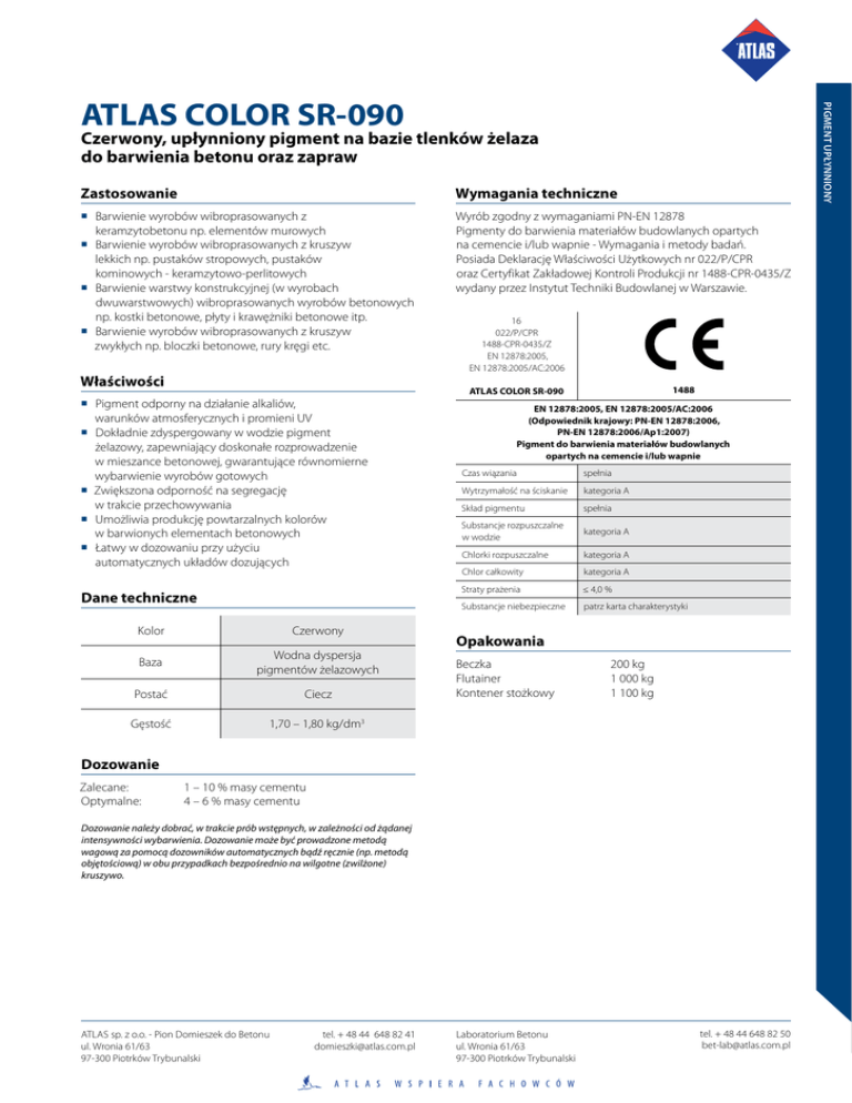 Pigment upłynniony ATLAS COLOR SR-090 Czerwony, upłynniony pigment na bazie tlenków żelaza do barwienia betonu oraz zapraw Zastosowanie Wymagania techniczne Barwienie wyrobów wibroprasowanych z keramzytobetonu np. elementów murowych Barwienie wyrobów wibroprasowanych z kruszyw lekkich np. pustaków stropowych, pustaków kominowych - keramzytowo-perlitowych Barwienie warstwy konstrukcyjnej (w wyrobach dwuwarstwowych) wibroprasowanych wyrobów betonowych np. kostki betonowe, płyty i krawężniki betonowe itp. Barwienie wyrobów wibroprasowanych z kruszyw zwykłych np. bloczki betonowe, rury kręgi etc. Wyrób zgodny z wymaganiami PN-EN 12878 Pigmenty do barwienia materiałów budowlanych opartych na cemencie i/lub wapnie - Wymagania i metody badań. Posiada Deklarację Właściwości Użytkowych nr 022/P/CPR oraz Certyfikat Zakładowej Kontroli Produkcji nr 1488-CPR-0435/Z wydany przez Instytut Techniki Budowlanej w Warszawie. Właściwości 16 022/P/CPR 1488-CPR-0435/Z EN 12878:2005, EN 12878:2005/AC:2006 1488 ATLAS COLOR SR-090 Pigment odporny na działanie alkaliów, warunków atmosferycznych i promieni UV Dokładnie zdyspergowany w wodzie pigment żelazowy, zapewniający doskonałe rozprowadzenie w mieszance betonowej, gwarantujące równomierne wybarwienie wyrobów gotowych Zwiększona odporność na segregację w trakcie przechowywania Umożliwia produkcję powtarzalnych kolorów w barwionych elementach betonowych Łatwy w dozowaniu przy użyciu automatycznych układów dozujących Dane techniczne Kolor Czerwony Baza Wodna dyspersja pigmentów żelazowych Postać Ciecz Gęstość 1,70 – 1,80 kg/dm3 EN 12878:2005, EN 12878:2005/AC:2006 (Odpowiednik krajowy: PN-EN 12878:2006, PN-EN 12878:2006/Ap1:2007) Pigment do barwienia materiałów budowlanych opartych na cemencie i/lub wapnie Czas wiązania spełnia Wytrzymałość na ściskanie kategoria A Skład pigmentu spełnia Substancje rozpuszczalne w wodzie kategoria A Chlorki rozpuszczalne kategoria A Chlor całkowity kategoria A Straty prażenia ≤ 4,0 % Substancje niebezpieczne patrz karta charakterystyki Opakowania Beczka200 kg Flutainer 1 000 kg Kontener stożkowy 1 100 kg Dozowanie Zalecane: Optymalne: 1 – 10 % masy cementu 4 – 6 % masy cementu Dozowanie należy dobrać, w trakcie prób wstępnych, w zależności od żądanej intensywności wybarwienia. Dozowanie może być prowadzone metodą wagową za pomocą dozowników automatycznych bądź ręcznie (np. metodą objętościową) w obu przypadkach bezpośrednio na wilgotne (zwilżone) kruszywo. ATLAS sp. z o.o. - Pion Domieszek do Betonu ul. Wronia 61/63 97-300 Piotrków Trybunalski tel. + 48 44 648 82 41 [email protected] Laboratorium Betonu ul. Wronia 61/63 97-300 Piotrków Trybunalski tel. + 48 44 648 82 50 [email protected] Pigment upłynniony ATLAS COLOR SR-090 Czerwony, upłynniony pigment na bazie tlenków żelaza do barwienia betonu oraz zapraw Trwałość Uwaga 12 miesięcy od daty umieszczonej na opakowaniu. Data produkcji i numer serii umieszczone są na opakowaniu. Szczegółowe informacje dotyczące zdrowia, bezpieczeństwa i ekologii zawarte są w karcie charakterystyki oraz na etykiecie. Przechowywanie i transport Produkt transportować i przechowywać w oryginalnych, nieuszkodzonych pojemnikach w temp. od +5°C do +30°C. Chronić przed mrozem i silnym nasłonecznieniem. Po ok. 2 miesiącach składowania produkt należy dokładnie przemieszać lub przepompować przed użyciem. Niniejsze informacje stanowią podstawowe wytyczne, dotyczące stosowania wyrobu i nie zwalniają z obowiązku wykonywania prac zgodnie z zasadami sztuki budowlanej i przepisami BHP. Wraz z wydaniem niniejszej karty technicznej, wszystkie poprzednie tracą ważność. Data aktualizacji: 2016.05.23/MO Instrukcja aplikacji Pigment upłynniony ATLAS COLOR SR-090 należy dozować bezpośrednio na wilgotne (zwilżone) kruszywo. Po ok. 30-45 sekundach intensywnego mieszania należy dodać cement i ewentualne dodatki mineralne oraz pozostałą wodę zarobową. Łączny czas mieszania zależy od rodzaju i wydajności mieszarki, jednak musi zapewnić ujednorodnienie mieszanki betonowej i powinien być określony w ramach prób wstępnych. Zaleca się aby łączny czas mieszania mieszanki betonowej był dłuższy niż 120 sekund. Beton po zaformowaniu powinien być właściwie pielęgnowany w celu osiągnięcia projektowanych parametrów. Wskazówki Optymalny czas mieszania może się zmieniać w zależności od stosowanych surowców i rodzaju mieszarki Zmiany współczynnika wodno-cementowego w czasie produkcji betonu mogą być przyczyną powstania różnic w wybarwieniu gotowych elementów Ryzyko wystąpienia wykwitów węglanowych można zmniejszyć stosując domieszkę uszczelniającą do betonów wibroprasowanych ATLAS ANGUCEL KO- 919 lub hydrofobizującą ATLAS ANGUCEL ES-200 do betonów towarowych i wibroprasowanych Zmiana rodzaju lub producenta cementu/spoiwa może zmienić odcień końcowy produktu W celu dobrania właściwego odcienia zaleca się wykonać próby przy różnych dozowaniach barwnika Kolor gotowego wyrobu może ulegać zmianom w trakcie eksploatacji ze względu na następujące czynniki: wykwity węglanowe, postępujący proces hydratacji cementu, ścieranie warstwy fakturowej, jak również wnikanie w pory zanieczyszczeń i pyłów ATLAS sp. z o.o. - Pion Domieszek do Betonu ul. Wronia 61/63 97-300 Piotrków Trybunalski tel. + 48 44 648 82 41 [email protected] Laboratorium Betonu ul. Wronia 61/63 97-300 Piotrków Trybunalski tel. + 48 44 648 82 50 [email protected]
