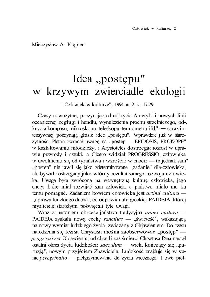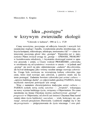 Człowiek w kulturze, 2 Mieczysław A. Krąpiec Idea „postępu" w krzywym zwierciadle ekologii "Człowiek w kulturze", 1994 nr 2, s. 17-29 Czasy nowożytne, poczynając od odkrycia Ameryki i nowych linii oceanicznej żeglugi i handlu, wynalezienia prochu strzelniczego, od-, krycia kompasu, mikroskopu, teleskopu, termometru i Id." -— coraz in tensywniej poczynają głosić ideę „postępu". Wprawdzie już w staro żytności Platon zwracał uwagę na „postęp — EPIDOSIS, PROKOPE" w kształtowaniu młodzieży, i Arystoteles dostrzegał rozrost w upra wie przyrody i sztuki, a Cicero widział PROGRESSIO_ człowieka w uwolnieniu się od tyraństwa i wzroście w cnocie — to jednak sam" „postęp" nie jawił się jako zdeterminowane „zadanie" dla-człowieka, ale bywał dostrzegany jako wtórny rezultat samego rozwoju człowie ka. Uwaga była zwrócona na wewnętrzną kulturę człowieka, jego cnoty, które miał rozwijać sam człowiek, a państwo miało mu ku temu pomagać. Zadaniem bowiem człowieka jest artimi cultura — „uprawa ludzkiego ducha", co odpowiadało greckiej PAJDEJA, której myśliciele starożytni poświęcali tyle uwagi. Wraz z nastaniem chrześcijaństwa tradycyjna animi cultura — PAJDEJA zyskała nową cechę sanctitas — „świętość", wskazującą na nowy wymiar ludzkiego życia, związany z Objawieniem. Do czasu narodzenia się Jezusa Chrystusa można zaobserwować „postęp" — progressiv w Objawieniu; od chwili zaś śmierci Chrystusa Pana nastał ostatni okres życia ludzkości: saeculum — wiek, kończący się „paruzją", nowym przyjściem Zbawiciela. Ludzkość znajduje się w sta nie peregrinatio — pielgrzymowania do życia wiecznego. I owo piel- 18 Mieczysław A. Krąpiec grzymowanie jest spełnieniem się nieustannego „postępu" ku osta tecznemu przeznaczeniu ludzkości. W wiekach średnich koncepcję progressio —perfectio Św. Tomasz związał z aktualizowaniem się w człowieku jego potencjalności na turalnych i tzw. obiedencjalnych, czyli „możności uległości" wobec Stwórcy. Na mocy potencjalności (możności) naturalnych człowiek ma obowiązek aktualizowania tychże potencjalności, jakimi są: ludzki rozum, ludzka wola i emocje. Każda z tych dziedzin może i powinna być w swoim działaniu usprawniona i doprowadzona — w miarę możności — do szczytowego rozwoju, słynnego: optimum potentiae, na mocy czego człowiek będzie mógł działać firmiter, prompte ac delectabiliter, a więc „trwale, natychmiast i z zadowoleniem", speł niając swe ludzkie czyny, w postaci różnorodnego działania rozumu, woli i swych aktów decyzyjnych związanych z ludzkim działaniem rozumnym i wolnym. Jest to wyhodowanie w sobie życia cnót tak intelektualnych jak moralnych, a także cnót związanych z życiem artystyczno-twórczym; albowiem wszędzie należy aktualizować nasze naturalne potencjalności wedle zasad rozumu. Rozum bowiem jest tym czynnikiem, który istotnie czyni człowieka bytem ludzkim. „Możność uległości" wobec Stwórcy jest ludzką naturą racjonalną, o ile ta jest podległa działaniu zbawczemu Boga. Natura bowiem ludzka, jako racjonalna, jest przyporządkowana dobru. Cokolwiek człowiek czyni, czyni to dla realizowania jakiegoś dobra, jego osiąg nięcia, jego u pełnienia. Związek ludzkiej natury z dobrem jako do brem stanowi podstawę wyboru poszczególnych konkretnych dóbr, motywujących ludzkie działania. Cokolwiek jednak wybieramy jako motyw naszego działania, wybieramy to dlatego, że dostrzegamy w tym motywie nasze dobro. Stąd związanie ludzkiej racjonalnej na tury z dobrem jest nieodłączne od każdego człowieka. Przejawia się ono jako, nigdy nie ugaszone, pragnienie szczęścia. W interpretacji teologicznej owo pragnienie szczęścia, będące przejawem przypo rządkowania człowieka dobru —jest nieuświadomionym pragnieniem Boga, jako najwyższego i nieskończonego dobra. Człowiek winien sobie, poprzez pracę swego rozumu, uświadomić sens ostateczny — pragnienie szczęścia, i zwrócić się poprzez pracę swego rozumu ku IDEA „POSTĘPU" W KRZYWYM ZWIERCIADLE EKOLOGII 19 nieskończonemu dobru, którym jest konkretnie Bóg. Jednak owo zwrócenie się ku Bogu i skuteczne działanie nie jest tylko dziełem ludzkim, ale jest także sprawą Bożej pomocy, zwanej łaską. I właśnie skuteczna pomoc Boga, w postaci Jego łaski, pozwala z a k t u a l i z o w a ć ową „możność uległości" ludzkiej racjonalnej natury. Aktu alizowanie ludzkich potencjalności zarówno naturalnych (przyrodzo nych), jak i „możności uległości" w sposób nadprzyrodzony stanowi, zdaniem św. Tomasza, istotę doskonałości człowieka — jego perfectio i w tym sensie: progressas — „postęp" w kierunku spełnienia się człowieczeństwa. A więc filozofia i teologia chrześcijańska (św. Tomasza) akcento wała postęp i doskonałość samego człowieka w jego pracy nad sa mym sobą. To dopiero miało być gwarancją racjonalnych stosunków międzyludzkich i racjonalnego stosunku do całej przyrody. Albowiem w myśl przekazanego w Biblii przykazania Boga: „czyńcie sobie zie mię poddaną" chodzi nie tyle o opanowanie ziemi przez człowieka, ile o transcendowanie tego, co jest „ziemskie", przez człowieka. Na kaz Boga „czyńcie sobie ziemię poddaną" znaczy tyle, że należy nie poddawać się „ziemi", ale ją przekraczać, ją transcendować, uczynić to wszystko, co jest „ziemią", poddanym ludzkiemu duchowi. W tym samym sensie później św. Paweł nawoływał, aby nie służyć sprawom ziemskim, lecz „szukać tego, co jest w górze". Zatem biblijny nakaz „czyńcie sobie ziemię poddaną" jest nakazem o charakterze moral nym, a nie „socjo-technicznym"; jest skierowanym do człowieka ape lem, by przez swą ludzką pracę rozumną górował nad tym wszystkim, co jest „ziemią". Objawienie Boże nie uczyło, jak „wykorzystywać" dobra ziemi, ale jak się doskonal