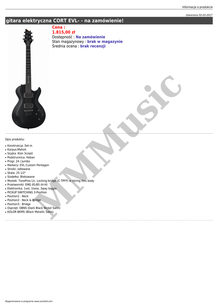 Informacje o produkcie Utworzono 02-03-2017 gitara elektryczna CORT EVL- - na zamówienie! Cena : 1.815,00 zł us ic Dostępność : Na zamówienie Stan magazynowy : brak w magazynie Średnia ocena : brak recenzji ● ● ● ● ● ● ● ● ● ● ● ● ● ● ● ● Konstrukcja: Set-in Korpus:Mahoń Szyjka: Klon 3część Podstrunnica: Heban Progi: 24 / Jumbo Markery: EVL Custom Pentagon Stroiki: odlewane Skala: 25 1/2" Siodełko: Blokowane Mostek: TonePros Lic. Locking bridge (C-TPFP) w /string thru body Przetworniki: EMG 81/85 (H-H) Elektronika: 1vol, 1tone, 3way toggle PICKUP SWITCHING 3-Position Position1 : Neck Position2 : Neck & Bridge Position3 : Bridge Osprzęt: DBNS (Dark Black Nickel Satin) KOLOR BKMS (Black Metallic Satin). M ● M ● M Opis produktu: Wygenerowano w programie www.oscGold.com