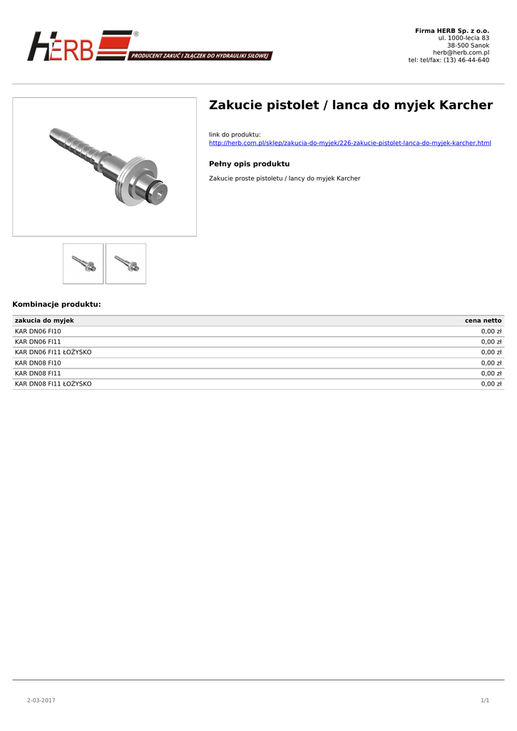 Firma HERB Sp. z o.o. ul. 1000-lecia 83 38-500 Sanok [email protected] tel: tel/fax: (13) 46-44-640 Zakucie pistolet / lanca do myjek Karcher link do produktu: http://herb.com.pl/sklep/zakucia-do-myjek/226-zakucie-pistolet-lanca-do-myjek-karcher.html Pełny opis produktu Zakucie proste pistoletu / lancy do myjek Karcher Kombinacje produktu: zakucia do myjek cena netto KAR DN06 FI10 0,00 zł KAR DN06 FI11 0,00 zł KAR DN06 FI11 ŁOŻYSKO 0,00 zł KAR DN08 FI10 0,00 zł KAR DN08 FI11 0,00 zł KAR DN08 FI11 ŁOŻYSKO 0,00 zł 2-03-2017 1/1