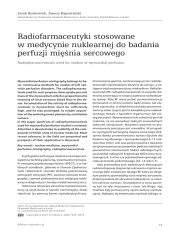 Jacek Kuśmierek, Janusz Kapuściński Zakład Medycyny Nuklearnej Akademii Medycznej w Łodzi, Centralny Szpital Kliniczny w Łodzi Radiofarmaceutyki stosowane w medycynie nuklearnej do badania perfuzji mięśnia sercowego Radiopharmaceuticals used for studies of myocardial perfusion Myocardial perfusion scintigraphy belongs to basic, noninvasive methods for studies of left ventricle perfusion disorders. The radiopharmaceuticals used for such purpose show uptake per unit mass of the myocardium which is proportional to intensity of local coronary blood flow in the tissue. Accumulation of the activity of radiopharmaceuticals in myocardium must be sufficiently high, and its stay prolonged, to enable acquisition of the emited gamma photons by scintilation camera. In the paper spectrum of radiopharmaceuticals used for myocardial perfusion studies is revieved. Attention is devoted also to avaibility of the compounds in Polish units of nuclear medicine. Most recent advances in the field are presented and prospects of their application is discussed. Key words: nuclear medicine, myocardial perfusion scintigraphy, radiopharmaceuticals Scyntygrafia perfuzyjna mięśnia sercowego prowadzona techniką planarną, ewentualnie tomografii emisyjnej pojedynczego fotonu (SPECT), a w niektórych ośrodkach, głównie w Stanach Zjednoczonych i Niemczech, również techniką pozytronowej tomografii emisyjnej (PET, positron emission tomography), stanowi podstawowy atut medycyny nuklearnej w diagnostyce choroby niedokrwiennej serca. Informacje dotyczące ukrwienia mięśnia lewej komory są uzyskiwane w sposób nieinwazyjny, dzięki rejestracji (za pomocą kamer scyntylacyjnych) pro- mieniowania gamma, emitowanego przez radiofarmaceutyki wprowadzane dożylnie do ustroju, a następnie wychwytywane przez miokardium. Radiofarmaceutyk (RF, radiopharmaceutical) to związek chemiczny zawierający w swojej cząsteczce radioaktywny izotop. Rolę RF może pełnić promieniotwórczy pierwiastek w formie kationu bądź anionu lub złożona cząsteczka, w skład której wchodzi promieniotwórczy atom (często jest to kompleks jonu radioaktywnego metalu z ligandem organicznym lub nieorganicznym). Wprowadzana ilość substancji jest tak znikoma, że nie powoduje żadnych zauważalnych zaburzeń ustrojowych. Narażenie pacjenta na promieniowanie jonizujące jest niewielkie. W przypadku scyntygrafii perfuzyjnej mięśnia sercowego efektywna dawka promieniowania wynosi (łącznie dla badania wysiłkowego i spoczynkowego) 6–12 milisiwertów [mSv]. Jest ona porównywalna z dawkami otrzymywanymi przez pacjentów podczas niektórych powszechnie stosowanych badań radiologicznych, na przykład radiografii kręgosłupa lędźwiowo-krzyżowego (ok. 5 mSv) czy prześwietlenia górnego odcinka przewodu pokarmowego (ok. 14 mSv) [1]. Ideą przewodnią prac badawczych dotyczących radioizotopowej diagnostyki ukrwienia mięśnia sercowego było znalezienie takiego RF, który po dożylnym podaniu gromadziłby się w mięśniu sercowym, proporcjonalnie do ukrwienia miokardium, w szerokim zakresie wartości. Gromadzenie w sercu powinno być na tyle intensywne i trwać tak długo, aby możliwe były pomiary przy użyciu kamery scyntylacyjnej. Najlepiej, by ewentualny wychwyt takiego ra- Adres do korespondencji: Zakład Medycyny Nuklearnej Akademii Medycznej w Łodzi ul. Czechosłowacka 8/10, 92–216 Łódź Copyright „ 2001 Via Medica, ISSN 1425–3674 [email protected] 11 Forum Kardiologów, 1/2001 diofarmaceutyku przez inne położone w pobliżu serca narządy był niewielki i nie zakłócał oceny perfuzji mięśnia lewej komory serca. Zasady te, równolegle z doskonaleniem aparatury pomiarowej i metod ilościowej analizy uzyskiwanych informacji, stanowią podstawę rozwoju scyntygrafii perfuzyjnej serca. Podstawowe informacje o mechanizmach transportu i gromadzenia przez mięsień sercowy jednowartościowych kationów zrodziły koncepcję użycia do oceny perfuzji radioizotopów potasu (42K, 43K), rubidu (81Rb, 86Rb), cezu (129Cs, 131Cs) oraz talu (201Tl). Badane początkowo radionuklidy — potas-42 i rubid86 — okazały się mało przydatne. Pierwszym radioizotopem z tej grupy, z powodzeniem zastosowanym do oceny perfuzji serca u ludzi, był radioaktywny potas-43, przy użyciu którego udało się zlokalizować strefy zawału i wywołanego wysiłkiem niedokrwienia serca [2]. Do detekcji zmian pozawałowych stosowano też radioaktywny cez-129 i 131 [3]. Wprowadzenie w 1975 roku radioaktywnego talu-201 miało przełomowy charakter dla nieinwazyjnej diagnostyki ukrwienia serca [4]. Przez ponad 10 lat, to znaczy do czasu zastosowania związków znakowanych radiotechnetem ( 99m Tc), tal-201 był praktycznie jedynym radionuklidem używanym do scyntygraficznych badań perfuzji serca, a obecnie nadal należy do podstawowych. Tal-201 jest szybko wychwytywany z krwi przez miocyty (po 1 min wychwyt osiąga 80% maksimum), głównie w wyniku aktywnego transportu przez błony komórkowe, z wykorzystaniem systemu transportowego ATP-azy sodowo-potasowej. Wychwyt talu jest hamowany przez farmakologiczne inhibitory tego mechanizmu [5], a także hipoksję upośledzającą integralność systemu transportowego błony komórkowej [6]. W wyniku procesu ciągłej wymiany z nowymi porcjami talu z krwi i wolniejszego wypłukiwania RF (wash-out) z obszarów niedokrwienia ubytki gromadzenia spowodowane upośledzeniem ukrwienia miokardium (wywołanym wysiłkiem fizycznym lub farmakologicznym) zanikają zwykle 2–4 godziny po iniekcji. Zjawisko to, zwane procesem redystrybucji, ma istotne znaczenie w różnicowaniu niedokrwienia z martwicą czy blizną oraz w ocenie „żywotności” mięśnia. Niepodważalnym zaletom talu-201 towarzyszą jednak pewne istotne ograniczenia związane z kosztowną cyklotronową produkcją i niektórymi cechami fizycznymi tego radionuklidu. W związku z tym już na początku lat 80. podjęto próby zastosowania do badań serca z
