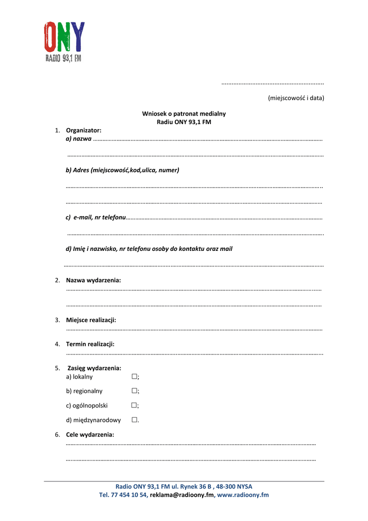............................................................ (miejscowość i data) Wniosek o patronat medialny Radiu ONY 93,1 FM 1. Organizator: a) nazwa ………………………………………………………………………………………………………………………………… …………………………………………………………………………………………………………………..…………………………… b) Adres (miejscowość,kod,ulica, numer) …………………………………………………………………………………………………………...………………………………….. …………………………………………………………………………………………………..…………………………………………… c) e-mail, nr telefonu……………………………………………………………………………………………………………… …………………………………………………………………………………………………………………………………….…………. d) Imię i nazwisko, nr telefonu osoby do kontaktu oraz mail ………………………………………………………..….…………………………….……………………………………………………… 2. Nazwa wydarzenia: …………………………………………………………………………………………………………….……………………………...… …………………………………………………………………………………………….…….………………………………………..… 3. Miejsce realizacji: …………………………………………………..…………………………………………………………………………………………… 4. Termin realizacji: ……………………………………………………………..………………………………………………………………………………... 5. Zasięg wydarzenia: a) lokalny ; b) regionalny ; c) ogólnopolski ; d) międzynarodowy . 6. Cele wydarzenia: ………………………………………………………………………………………………………………………………….………… ….………………………………………………………………………………………………………………………………………… Radio ONY 93,1 FM ul. Rynek 36 B , 48-300 NYSA Tel. 77 454 10 54, [email protected], www.radioony.fm 7. Opis wydarzenia: ………………………………………………..………………………………………………………………………………………… …………………………………………………………………………………………………………………………………………… ………………………………………………………………..………………………………………………………………………… 8. Oczekiwane świadczenia ze strony Radia w związku z planowanym przedsięwzięciem: …………………………………………………………………………………………………………………………………………… ………………………………………………………………………………………………………………………………………….. 9. Proponowana oferta promocyjne na rzecz Radia ONY? (baner w czasie imprezy, płatność gotówką, logo na ulotkach, bilety, promocja w innym medium, jakim?) ……………………………………………………………………………………………..………………………………………………… ……………………………………………………………………………………………………………………………………………….. 10. Do kogo kierowane jest wydarzenie i jaka jest planowana liczba uczestników?: ……………………………………………………………………………………………………………………………………………………… ………………………………………………………………………………………………………………………………..…………………… 11. Czy udział w wydarzeniu jest odpłatny dla uczestników? tak (koszt………………………) nie 12. Czy wydarzenie ma charakter cykliczny? tak nie 13. Czy wystąpiono o objęcie patronatem wydarzenia do innych mediów? (jeśli tak, należy wymienić do jakich). tak nie ………………………………………………………………………………………… 12. Organizator bezwarunkowo i nieodpłatnie wyraża zgodę na prowadzenie przez Radio ONY działań promocyjnych w ramach imprezy objętej patronatem na koszt Radio ONY, których zakres zostanie uzgodniony z Organizatorem. …………………………………………… (podpis organizatora) Radio ONY 93,1 FM ul. Rynek 36 B , 48-300 NYSA Tel. 77 454 10 54, [email protected], www.radioony.fm