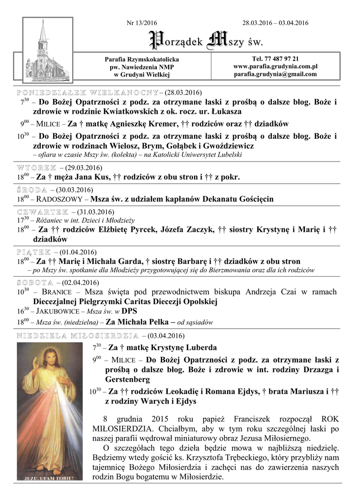 Nr 13/2016 28.03.2016 – 03.04.2016 Porządek Mszy św. Parafia Rzymskokatolicka pw. Nawiedzenia NMP w Grudyni Wielkiej Tel. 77 487 97 21 www.parafia.grudynia.com.pl [email protected] – (28.03.2016) 30 7 – Do Bożej Opatrzności z podz. za otrzymane łaski z prośbą o dalsze błog. Boże i zdrowie w rodzinie Kwiatkowskich z ok. rocz. ur. Łukasza 900 – MILICE – Za † matkę Agnieszkę Kremer, †† rodziców oraz †† dziadków 1030 – Do Bożej Opatrzności z podz. za otrzymane łaski z prośbą o dalsze błog. Boże i zdrowie w rodzinach Wielosz, Brym, Gołąbek i Gwoździewicz – ofiara w czasie Mszy św. (kolekta) – na Katolicki Uniwersytet Lubelski – (29.03.2016) 00 18 – Za † męża Jana Kus, †† rodziców z obu stron i †† z pokr. – (30.03.2016) 18 – RADOSZOWY – Msza św. z udziałem kapłanów Dekanatu Gościęcin 00 – (31.03.2016) 17 – Różaniec w int. Dzieci i Młodzieży 1800 – Za †† rodziców Elżbietę Pyrcek, Józefa Zaczyk, †† siostry Krystynę i Marię i †† 30 dziadków – (01.04.2016) 00 18 – Za †† Marię i Michała Garda, † siostrę Barbarę i †† dziadków z obu stron – po Mszy św. spotkanie dla Młodzieży przygotowującej się do Bierzmowania oraz dla ich rodziców 30 10 – (02.04.2016) – BRANICE – Msza święta pod przewodnictwem biskupa Andrzeja Czai w ramach Diecezjalnej Pielgrzymki Caritas Diecezji Opolskiej 16 – JAKUBOWICE – Msza św. w DPS 1800 – Msza św. (niedzielna) – Za Michała Pelka – od sąsiadów 30 – (03.04.2016) 30 7 – Za † matkę Krystynę Luberda 900 – MILICE – Do Bożej Opatrzności z podz. za otrzymane łaski z prośbą o dalsze błog. Boże i zdrowie w int. rodziny Drzazga i Gerstenberg 1030 – Za †† rodziców Leokadię i Romana Ejdys, † brata Mariusza i †† z rodziny Warych i Ejdys 8 grudnia 2015 roku papież Franciszek rozpoczął ROK MIŁOSIERDZIA. Chciałbym, aby w tym roku szczególnej łaski po naszej parafii wędrował miniaturowy obraz Jezusa Miłosiernego. O szczegółach tego dzieła będzie mowa w najbliższą niedzielę. Będziemy wtedy gościć ks. Krzysztofa Trębeckiego, który przybliży nam tajemnicę Bożego Miłosierdzia i zachęci nas do zawierzenia naszych rodzin Bogu bogatemu w Miłosierdzie. 1. BÓG ZAPŁAĆ za obecność i modlitwę, za wszystkie składki pieniężne. 2. BÓG ZAPŁAĆ rodzinom, które sprzątały kościół oraz które złożyły ofiary na dekoracje. O podjęcie się tej służby na rzecz Parafii proszę kolejne rodziny: − Danuta Kuźniar − Julian Zaczyk − Grażyna Garda − Joanna Sandomierska − Piotr Breitkopf 3. Na dzień 14 maja (sobota) zaplanowana jest jednodniowa PIELGRZYMKA PARAFIALNA w okolice ŻYWCA, obejmująca SANKTUARIUM MATKI BOŻEJ W KĘTACH, Międzybrodzie Żywieckie oraz SANKTUARIUM MATKI BOŻEJ w RYCHWAŁDZIE. Koszt udziału w pielgrzymce wynosić będzie 90 zł. Kwota ta obejmuje przejazd autokarem, obiad, wjazd wyciągiem na Górę Żar oraz rejs łodzią po Jeziorze Żywieckim. Zapisy: Anna Chałek oraz Monika Drobysz 4. Skłam podziękowania dla właścicieli Pałacu w Grudyni Wielkiej za pokrywanie kosztów prania obrusów ołtarzowych 5. CARITAS DIECEZJI OPOLSKIEJ zaprasza wszystkich pracowników, wolontariuszy i przyjaciół Caritas na pielgrzymkę do kościoła jubileuszowego Świętej Rodziny i do grobu biskupa Józefa Marcina Nathana w Branicach. Centralnym punktem pielgrzymki będzie Msza święta o godz. 1030, pod przewodnictwem biskupa Andrzeja Czai, w kościele zwanym powszechnie bazyliką św. Rodziny.