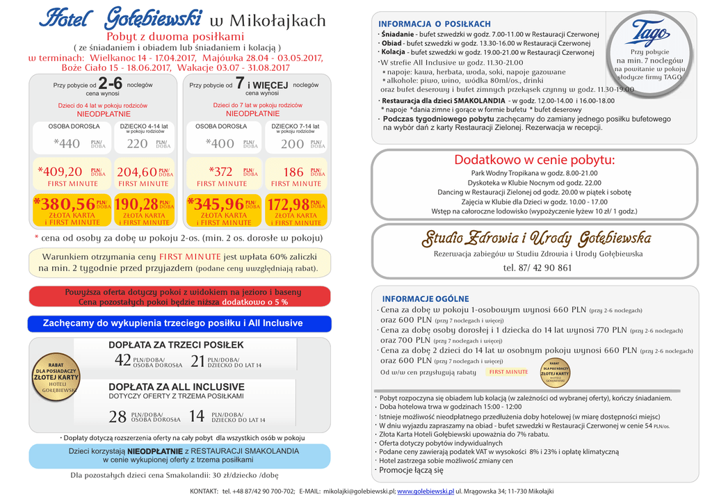 w Mikołajkach Pobyt z dwoma posiłkami ( ze śniadaniem i obiadem lub śniadaniem i kolacją ) w terminach: Wielkanoc 14 - 17.04.2017, Majówka 28.04 - 03.05.2017, Boże Ciało 15 - 18.06.2017, Wakacje 03.07 - 31.08.2017 2-6 noclegów Przy pobycie od cena wynosi Przy pobycie od *409,20 NIEODPŁATNIE DZIECKO 4-14 lat w pokoju rodziców PLN/ DOBA 220 PLN/ DOBA 204,60 FIRST MINUTE *380,56 ZŁOTA KARTA i FIRST MINUTE OSOBA DOROSŁA PLN/ DOBA 190,28 PLN/ DOBA ZŁOTA KARTA i FIRST MINUTE DZIECKO 7-14 lat w pokoju rodziców *400 PLN/ DOBA 200 PLN/ DOBA *372 PLN/ DOBA 186 PLN/ DOBA PLN/ DOBA FIRST MINUTE PLN/ DOBA W strefie All Inclusive w godz. 11.30-21.00 na powitanie w pokoju napoje: kawa, herbata, woda, soki, napoje gazowane słodycze firmy TAGO alkohole: piwo, wino, wódka 80ml/os., drinki oraz bufet deserowy i bufet zimnych przekąsek czynny w godz. 11.30-19.00 Dzieci do 7 lat w pokoju rodziców NIEODPŁATNIE *440 noclegów cena wynosi Dzieci do 4 lat w pokoju rodziców OSOBA DOROSŁA 7 i WIĘCEJ Przy pobycie na min. 7 noclegów FIRST MINUTE *345,96 ZŁOTA KARTA PLN/ DOBA i FIRST MINUTE Dodatkowo w cenie pobytu: FIRST MINUTE 172,98 Podczas tygodniowego pobytu zachęcamy do zamiany jednego posiłku bufetowego na wybór dań z karty Restauracji Zielonej. Rezerwacja w recepcji. PLN/ DOBA ZŁOTA KARTA i FIRST MINUTE Park Wodny Tropikana w godz. 8.00-21.00 Dyskoteka w Klubie Nocnym od godz. 22.00 Dancing w Restauracji Zielonej od godz. 20.00 w piątek i sobotę Zajęcia w Klubie dla Dzieci w godz. 10.00 - 17.00 Wstęp na całoroczne lodowisko (wypożyczenie łyżew 10 zł/ 1 godz.) * cena od osoby za dobę w pokoju 2-os. (min. 2 os. dorosłe w pokoju) Warunkiem otrzymania ceny FIRST MINUTE jest wpłata 60% zaliczki Rezerwacja zabiegów w Studiu i Urody Gołębiewska OFERTA NAZdrowia POWITANIE na min. 2 tygodnie przed przyjazdem (podane ceny uwzględniają rabat). tel. 87/ 42 90 861 Powyższa oferta dotyczy pokoi z widokiem na jezioro i baseny Cena pozostałych pokoi będzie niższa dodatkowo o 5 % Zachęcamy do wykupienia trzeciego posiłku i All Inclusive DOPŁATA ZA TRZECI POSIŁEK 42 HOTELI GOŁĘBIEWSKI PLN/DOBA/ OSOBA DOROSŁA 21 PLN/DOBA/ DZIECKO DO LAT 14 Cena za dobę w pokoju 1-osobowym wynosi 660 PLN (przy 2-6 noclegach) oraz 600 PLN (przy 7 noclegach i więcej) Cena za dobę osoby dorosłej i 1 dziecka do 14 lat wynosi 770 PLN (przy 2-6 noclegach) oraz 700 PLN (przy 7 noclegach i więcej) Cena za dobę 2 dzieci do 14 lat w osobnym pokoju wynosi 660 PLN (przy 2-6 noclegach) oraz 600 PLN (przy 7 noclegach i więcej) Od w/w cen przysługują rabaty FIRST MINUTE HOTELI GOŁĘBIEWSKI DOPŁATA ZA ALL INCLUSIVE DOTYCZY OFERTY Z TRZEMA POSIŁKAMI 28 PLN/DOBA/ OSOBA DOROSŁA 14 PLN/DOBA/ DZIECKO DO LAT 14 Dzieci korzystają NIEODPŁATNIE z RESTAURACJI SMAKOLANDIA w cenie wykupionej oferty z trzema posiłkami Dla pozostałych dzieci cena Smakolandii: 30 zł/dziecko /dobę Pobyt rozpoczyna się obiadem lub kolacją (w zależności od wybranej oferty), kończy śniadaniem. Doba hotelowa trwa w godzinach 15:00 - 12:00 Istnieje możliwość nieodpłatnego przedłużenia doby hotelowej (w miarę dostępności miejsc) W dniu wyjazdu zapraszamy na obiad - bufet szwedzki w Restauracji Czerwonej w cenie 54 PLN/os. Złota Karta Hoteli Gołębiewski upoważnia do 7% rabatu. Oferta dotyczy pobytów indywidualnych Podane ceny zawierają podatek VAT w wysokości 8% i 23% i opłatę klimatyczną Hotel zastrzega sobie możliwość zmiany cen Promocje łączą się KONTAKT: tel. +48 87/42 90 700-702; E-MAIL: [email protected]; www.golebiewski.pl ul. Mrągowska 34; 11-730 Mikołajki