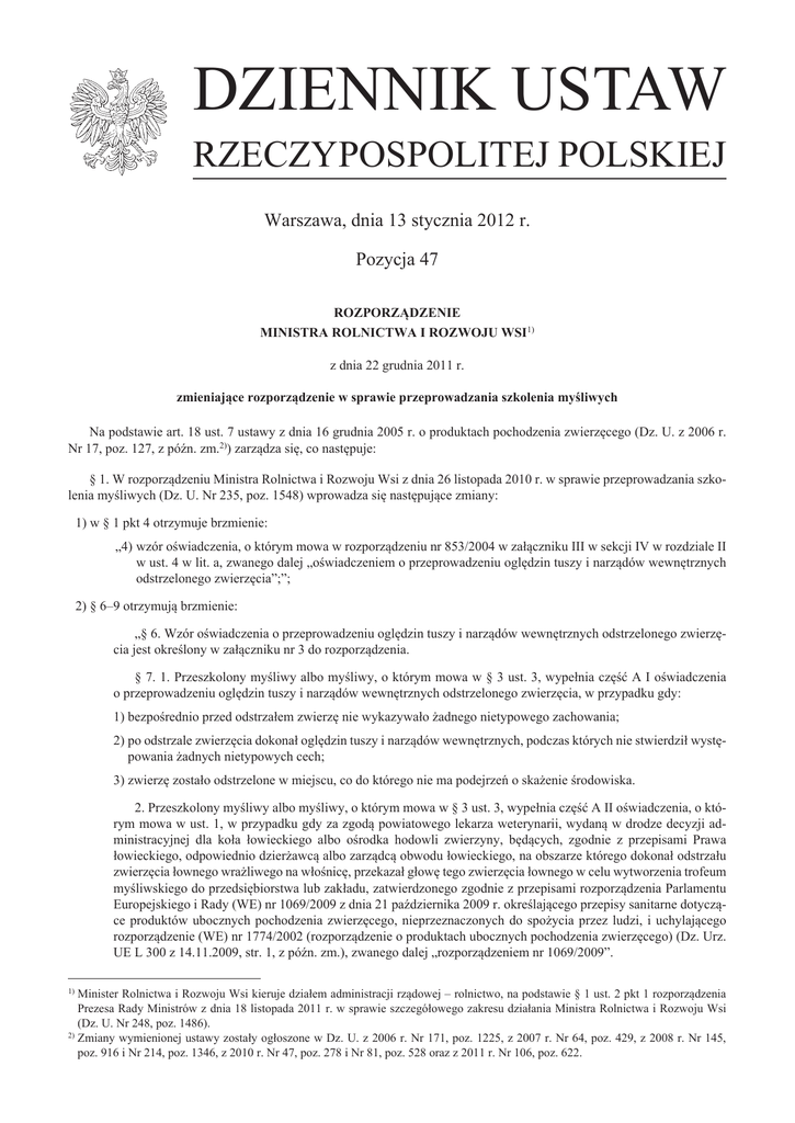DZIENNIK USTAW RZECZYPOSPOLITEJ POLSKIEJ Warszawa, dnia 13 stycznia 2012 r. Pozycja 47 RozpoRządzenie MinistRa Rolnictwa i Rozwoju wsi1) z dnia 22 grudnia 2011 r. zmieniające rozporządzenie w sprawie przeprowadzania szkolenia myśliwych Na podstawie art. 18 ust. 7 ustawy z dnia 16 grudnia 2005 r. o produktach pochodzenia zwierzęcego (Dz. U. z 2006 r. Nr 17, poz. 127, z późn. zm.2)) zarządza się, co następuje: § 1. W rozporządzeniu Ministra Rolnictwa i Rozwoju Wsi z dnia 26 listopada 2010 r. w sprawie przeprowadzania szkolenia myśliwych (Dz. U. Nr 235, poz. 1548) wprowadza się następujące zmiany: 1) w § 1 pkt 4 otrzymuje brzmienie: „4) wzór oświadczenia, o którym mowa w rozporządzeniu nr 853/2004 w załączniku III w sekcji IV w rozdziale II w ust. 4 w lit. a, zwanego dalej „oświadczeniem o przeprowadzeniu oględzin tuszy i narządów wewnętrznych odstrzelonego zwierzęcia”;”; 2) § 6–9 otrzymują brzmienie: „§ 6. Wzór oświadczenia o przeprowadzeniu oględzin tuszy i narządów wewnętrznych odstrzelonego zwierzęcia jest określony w załączniku nr 3 do rozporządzenia. § 7. 1. Przeszkolony myśliwy albo myśliwy, o którym mowa w § 3 ust. 3, wypełnia część A I oświadczenia o przeprowadzeniu oględzin tuszy i narządów wewnętrznych odstrzelonego zwierzęcia, w przypadku gdy: 1) bezpośrednio przed odstrzałem zwierzę nie wykazywało żadnego nietypowego zachowania; 2) po odstrzale zwierzęcia dokonał oględzin tuszy i narządów wewnętrznych, podczas których nie stwierdził występowania żadnych nietypowych cech; 3) zwierzę zostało odstrzelone w miejscu, co do którego nie ma podejrzeń o skażenie środowiska. 2. Przeszkolony myśliwy albo myśliwy, o którym mowa w § 3 ust. 3, wypełnia część A II oświadczenia, o którym mowa w ust. 1, w przypadku gdy za zgodą powiatowego lekarza weterynarii, wydaną w drodze decyzji administracyjnej dla koła łowieckiego albo ośrodka hodowli zwierzyny, będących, zgodnie z przepisami Prawa łowieckiego, odpowiednio dzierżawcą albo zarządcą obwodu łowieckiego, na obszarze którego dokonał odstrzału zwierzęcia łownego wrażliwego na włośnicę, przekazał głowę tego zwierzęcia łownego w celu wytworzenia trofeum myśliwskiego do przedsiębiorstwa lub zakładu, zatwierdzonego zgodnie z przepisami rozporządzenia Parlamentu Europejskiego i Rady (WE) nr 1069/2009 z dnia 21 października 2009 r. określającego przepisy sanitarne dotyczące produktów ubocznych pochodzenia zwierzęcego, nieprzeznaczonych do spożycia przez ludzi, i uchylającego rozporządzenie (WE) nr 1774/2002 (rozporządzenie o produktach ubocznych pochodzenia zwierzęcego) (Dz. Urz. UE L 300 z 14.11.2009, str. 1, z późn. zm.), zwanego dalej „rozporządzeniem nr 1069/2009”. Minister Rolnictwa i Rozwoju Wsi kieruje działem administracji rządowej – rolnictwo, na podstawie § 1 ust. 2 pkt 1 rozporządzenia Prezesa Rady Ministrów z dnia 18 listopada 2011 r. w sprawie szczegółowego zakresu działania Ministra Rolnictwa i Rozwoju Wsi (Dz. U. Nr 248, poz. 1486). 2) Zmiany wymienionej ustawy zostały ogłoszone w Dz. U. z 2006 r. Nr 171, poz. 1225, z 2007 r. Nr 64, poz. 429, z 2008 r. Nr 145, poz. 916 i Nr 214, poz. 1346, z 2010 r. Nr 47, poz. 278 i Nr 81, poz. 528 oraz z 2011 r. Nr 106, poz. 622. 1) Dziennik Ustaw –2– Poz. 47 3. Przeszkolony myśliwy albo myśliwy, o którym mowa w § 3 ust. 3, wypełnia część B oświadczenia, o którym mowa w ust. 1, w przypadku gdy: 1) bezpośrednio przed odstrzałem zwierzę wykazywało nietypowe zachowanie; 2) po odstrzale zwierzęcia dokonał oględzin tuszy i narządów wewnętrznych, podczas których stwierdził występowanie nietypowych cech, lub 3) zwierzę zostało odstrzelone w miejscu, co do którego istnieje podejrzenie o skażenie środowiska. § 8. 1. W przypadku, o którym mowa w § 7 ust. 1, oświadczenie o przeprowadzeniu oględzin tuszy i narządów wewnętrznych odstrzelonego zwierzęcia dołącza się do tuszy odstrzelonego zwierzęcia albo jednej z tusz, jeżeli jest ono wypełnione dla większej liczby tusz zwierząt łownych, w celu umożliwienia uwzględnienia informacji w nim zawartych urzędowemu lekarzowi weterynarii podczas przeprowadzania badania i oceny mięsa. 2. Kopię oświadczenia, o którym mowa w ust. 1, pozostawia się w dokumentacji właściwego ze względu na miejsce odstrzelenia zwierzęcia dzierżawcy albo zarządcy obwodu łowieckiego. 3. W przypadku, o którym mowa w § 7 ust. 2, kopię oświadczenia, o którym mowa w ust. 1, przekazuje się również do przedsiębiorstwa lub zakładu, zatwierdzonego zgodnie z przepisami rozporządzenia nr 1069/2009. 4. W przypadku, o którym mowa w § 7 ust. 3, oświadczenie o przeprowadzeniu oględzin tuszy i narządów wewnętrznych odstrzelonego zwierzęcia sporządza się oddzielnie dla każdego odstrzelonego zwierzęcia i dołącza się do tuszy tego zwierzęcia w celu umożliwienia uwzględnienia informacji w nim zawartych urzędowemu lekarzowi weterynarii podczas przeprowadzania badania i oceny mięsa. 5. Kopię oświadczenia, o którym mowa w ust. 4: 1) przekazuje się niezwłocznie powiatowemu lekarzowi weterynarii właściwemu ze względu na miejsce odstrzelenia zwierzęcia; 2) pozostawia się w dokumentacji właściwego ze względu na miejsce odstrzelenia zwierzęcia dzierżawcy albo zarządcy obwodu łowieckiego. § 9. 1. Informacje, o których mowa w rozporządzeniu nr 853/2004 w załączniku III w sekcji IV w rozdziale III w ust. 2, przeszkolony myśliwy albo myśliwy, o którym mowa w § 3 ust. 3, przekazuje właściwemu ze względu na miejsce odstrzelenia drobnej zwierzyny łownej powiatowemu lekarzowi weterynarii. 2. Wraz z informacjami, o których mowa w ust. 1, przekazuje się ponadto: 1) imię i nazwisko, miejsce zamieszkania oraz adres przeszkolonego myśliwego albo myśliwego, o którym mowa w § 3 ust. 3; 2) liczbę odstrzelonych zwierząt; 3) miejsce, datę i godzin