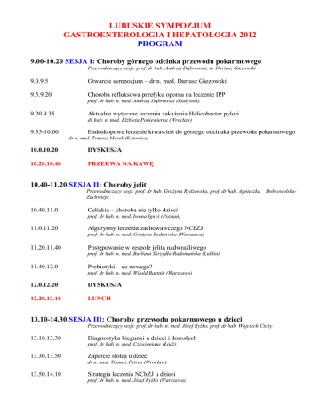 LUBUSKIE SYMPOZJUM GASTROENTEROLOGIA I HEPATOLOGIA 2012 PROGRAM 9.00-10.20 SESJA I: Choroby górnego odcinka przewodu pokarmowego Przewodniczący sesji: prof. dr hab. Andrzej Dąbrowski, dr Dariusz Giezowski 9.0.9.5 9.5.9.20 Otwarcie sympozjum – dr n. med. Dariusz Giezowski Choroba refluksowa przełyku oporna na leczenie IPP prof. dr hab. n. med. Andrzej Dąbrowski (Białystok) 9.20.9.35 Aktualne wytyczne leczenia zakażenia Helicobacter pylori dr hab. n. med. Elżbieta Poniewierka (Wrocław) 9.35-10.00 Endoskopowe leczenie krwawień do górnego odcinaka przewodu pokarmowego dr n. med. Tomasz Marek (Katowice) 10.0.10.20 DYSKUSJA 10.20.10.40 PRZERWA NA KAWĘ 10.40-11.20 SESJA II: Choroby jelit Przewodniczący sesji: prof. dr hab. Grażyna Rydzewska, prof. dr hab. Agnieszka Zachwieja 10.40.11.0 Dobrowolska- Celiakia – choroba nie tylko dzieci prof. dr hab. n. med. Iwona Ignyś (Poznań) 11.0.11.20 Algorytmy leczenia zachowawczego NChZJ prof. dr hab. n. med. Grażyna Rydzewska (Warszawa) 11.20.11.40 Postępowanie w zespole jelita nadwrażliwego prof. dr hab. n. med. Barbara Skrzydło-Radomańska (Lublin) 11.40.12.0 Probiotyki – co nowego? prof. dr hab. n. med. Witold Bartnik (Warszawa) 12.0.12.20 DYSKUSJA 12.20.13.10 LUNCH 13.10-14.30 SESJA III: Choroby przewodu pokarmowego u dzieci Przewodniczący sesji: prof. dr hab. n. med. Józef Ryżko, prof. dr hab. Wojciech Cichy 13.10.13.30 Diagnostyka biegunki u dzieci i dorosłych prof. dr hab. n. med. Czkwianianc (Łódź) 13.30.13.50 Zaparcie stolca u dzieci dr n. med. Tomasz Pytrus (Wrocław) 13.50.14.10 Strategia leczenia NChZJ u dzieci prof. dr hab. n. med. Józef Ryżko (Warszawa) 14.10-14.25 DYSKUSJA 14.25.14.40 PRZERWA KAWOWA 14.40-16.30 SESJA IV: Choroby wątroby i trzustki Przewodniczący sesji: prof. dr hab. Krzysztof Linke, prof. dr hab.Jerzy T. Marcinkowski 14.40.14.55 Rozpoznawanie i leczenie cholestatycznych chorób wątroby prof. dr hab. n. med. Piotr Milkiewicz (Szczecin) 14.55.15.10 Choroby wątroby u kobiet w ciąży prof. dr hab. n. med. Grzegorz Bręborowicz (Poznań) 15.10.15.30 Leczenie chirurgiczne guzów trzustki prof. dr hab. n. med. Maciej Wójcicki (Szczecin) 15.30.16.30 DYSKUSJA PANELOWA Tematy: 1. Jak interpretować odchylenia GGTP i amylazy? 2. Rola BAC, biopsji histologicznej, USG, MR i TK w diagnostyce zmian ogniskowych w wątrobie i trzustce. Moderator: prof. dr hab. n. med. Witold Bartnik (Warszawa) Uczestnicy: prof. dr hab. Andrzej Dąbrowski (Białystok), dr hab. Maciej Gonciarz (Sosnowiec), prof. dr hab. Tomasz Mach (Kraków), prof. dr hab. Przemysław Majewski (Poznań), prof. dr hab. Piotr Milkiewicz (Szczecin, dr Andrzej Moszko (Zielona Góra), dr hab. Bożena WalewskaZielecka (Warszawa), prof. dr hab. Maciej Wójcicki (Szczecin) 16.30 ZAKOŃCZENIE SYMPOZJUM KONCERT I KOKTAJL