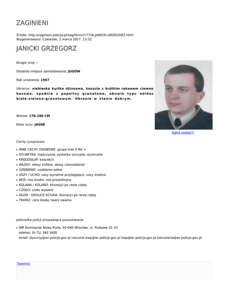 ZAGINIENI Źródło: http://zaginieni.policja.pl/zag/form/r17726,JANICKI-GRZEGORZ.html Wygenerowano: Czwartek, 2 marca 2017, 13:32 JANICKI GRZEGORZ Drugie imię: Ostatnie miejsce zameldowania: JUGÓW Rok urodzenia: 1967 Ubranie: niebieska kurtka dżinsowa, koszula z krótkim rękawem ciemno bezowa, spodnie z popeliny granatowe, obuwie typu adidas biało-zielono-granatowym. Ubranie w stanie dobrym. Wzrost: 176-180 CM Kolor oczu: JASNE Zgłoś osobę!!! Cechy rysopisowe ● INNE CECHY OSOBOWE: grupa krwi 0 RH + ● SYLWETKA: mężczyzna, sylwetka szczupła, wysmukła ● KRĘGOSŁUP: kaszak(i) ● WŁOSY: włosy krótkie, włosy ciemnoblond ● UZĘBIENIE: uzębienie pełne ● USZY / UCHO: uszy wyraźnie przylegające, uszy średnie ● NOS: nos średni, nos prostolinijny ● KOLANA / KOLANO: blizna(y) po ranie ciętej ● CZOŁO: czoło wysokie ● DŁOŃ - OKOLICE KCIUKA: blizna(y) po ranie ciętej ● TWARZ: cera blada, twarz owalna Jednostka policji prowadząca poszukiwania ● WR Komisariat Nowa Ruda, 50-040 Wrocław, ul. Podwale 31-33 telefon: (0-71) 340 3400 email: [email protected] [email protected] [email protected] [email protected] Tweetnij