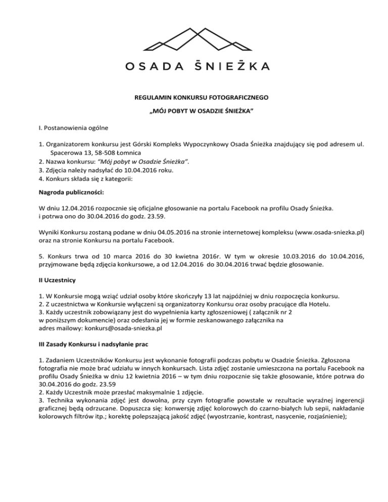 REGULAMIN KONKURSU FOTOGRAFICZNEGO „MÓJ POBYT W OSADZIE ŚNIEŻKA” I. Postanowienia ogólne 1. Organizatorem konkursu jest Górski Kompleks Wypoczynkowy Osada Śnieżka znajdujący się pod adresem ul. Spacerowa 13, 58-508 Łomnica 2. Nazwa konkursu: “Mój pobyt w Osadzie Śnieżka”. 3. Zdjęcia należy nadsyłać do 10.04.2016 roku. 4. Konkurs składa się z kategorii: Nagroda publiczności: W dniu 12.04.2016 rozpocznie się oficjalne głosowanie na portalu Facebook na profilu Osady Śnieżka. i potrwa ono do 30.04.2016 do godz. 23.59. Wyniki Konkursu zostaną podane w dniu 04.05.2016 na stronie internetowej kompleksu (www.osada-sniezka.pl) oraz na stronie Konkursu na portalu Facebook. 5. Konkurs trwa od 10 marca 2016 do 30 kwietna 2016r. W tym w okresie 10.03.2016 do 10.04.2016, przyjmowane będą zdjęcia konkursowe, a od 12.04.2016 do 30.04.2016 trwać będzie głosowanie. II Uczestnicy 1. W Konkursie mogą wziąć udział osoby które skończyły 13 lat najpóźniej w dniu rozpoczęcia konkursu. 2. Z uczestnictwa w Konkursie wyłączeni są organizatorzy Konkursu oraz osoby pracujące dla Hotelu. 3. Każdy uczestnik zobowiązany jest do wypełnienia karty zgłoszeniowej ( załącznik nr 2 w poniższym dokumencie) oraz odesłania jej w formie zeskanowanego załącznika na adres mailowy: [email protected] III Zasady Konkursu i nadsyłanie prac 1. Zadaniem Uczestników Konkursu jest wykonanie fotografii podczas pobytu w Osadzie Śnieżka. Zgłoszona fotografia nie może brać udziału w innych konkursach. Lista zdjęć zostanie umieszczona na portalu Facebook na profilu Osady Śnieżka w dniu 12 kwietnia 2016 – w tym dniu rozpocznie się także głosowanie, które potrwa do 30.04.2016 do godz. 23.59 2. Każdy Uczestnik może przesłać maksymalnie 1 zdjęcie. 3. Technika wykonania zdjęć jest dowolna, przy czym fotografie powstałe w rezultacie wyraźnej ingerencji graficznej będą odrzucane. Dopuszcza się: konwersję zdjęć kolorowych do czarno-białych lub sepii, nakładanie kolorowych filtrów itp.; korektę polepszającą jakość zdjęć (wyostrzanie, kontrast, nasycenie, rozjaśnienie); 4. Nie będą akceptowane prace: -z których jakiekolwiek elementy zostały usunięte lub dodane w wyniku obróbki graficznej; powstałe w wyniku połączenia różnych fotografii (kolaże i fotomontaże), o nieprawidłowej ekspozycji, nieostre nawołujące do przemocy, rasizmu lub faszyzmu, zawierające wulgaryzmy, powszechnie uznawane za obraźliwe, treści o charakterze pornograficznym, mogące obrazić uczucia naruszające prawa osób trzecich (w tym w szczególności dóbr osobistych i praw autorskich), z innych względów odrzucone przez Jury. Dodatkowe obostrzenia: Musisz być autorem wszystkich plików, Nie możesz umieszczać obrazów przedstawiających zastrzeżone logotypy lub chronione prawem znaki towarowe Nie możesz umieszczać plików przedstawiających budynki, dobra lub miejsca chronione przepisami prawa własności intelektualnej 5. W kategorii „Nagroda Publiczności” po terminie nadsyłania prac rozpocznie się konkurs internetowy. Pięć prac, które uzyskają najwięcej kliknięć ‘Lubię to’ na portalu Facebook do 30.04.2016 do godz. 23.59 zostaną zakwalifikowane do kolejnego etapu, w którym zwycięzca wyłoniony zostanie przez Jury Konkursu. 6. Prace konkursowe należy nadsyłać w załączniku na adres [email protected] 7. Prace muszą spełniać następujące kryteria: minimalne wymiary 2400x1600px, w formacie JPG, Należy wypełnić oraz dołączyć do zgłoszenia (w formie załącznika) formularz zgłoszeniowy (załącznik nr 2). V Jury 1. Oceny nadesłanych prac dokona Jury powołane przez Organizatora. 2. Jury zastrzega sobie prawo dyskwalifikacji zdjęć nierealizujących założonego tematu Konkursu, niespełniających zasad Konkursu lub łamiących regulamin. Z udziału w Konkursie mogą zostać wykluczone prace noszące wady formalne (słaba jakość zdjęć, zbyt mała rozdzielczość itp.). Odrzuceniu podlegają zdjęcia, na których znajdują się znaki (daty, znaki wodne, podpisy, ramki). 3. Decyzje Jury są ostateczne i nie podlegają weryfikacji. 4. W skład Jury wchodzą: Dariusz Surynt – Prezes Zarządu Teresa Królak – Dyrektor Marketingu Anna Brzózko Jaworska – Kierownik Marketingu VI Nagrody 1. W konkursie przewidziano nagrody: I miejsce - weekendowy pobyt w kompleksie Osada Śnieżka dla dwóch osób dorosłych i 2 dzieci do lat 16, pobyt obejmuje wyżywienie: śniadanie i obiadokolację II miejsce - bon SPA o wartości 300 zł do wykorzystania w części Beauty lub Medi – Care kompleksu Osada Śnieżka III miejsce - kolacja a ’ la carte o wartości 200 zł w restauracji „Tabakiera” 2. Laureaci zostaną powiadomieni o werdykcie Jury drogą e-mailową. VII Postanowienia końcowe 1. Uczestnik Konkursu z chwilą nadesłania prac na Konkurs oświadcza, że: 1. Akceptuje niniejszy Regulamin. 2. Jest autorem zdjęć oraz posiada zgodę osób biorących udział przy powstawaniu pracy modeli, modelek, wizażystów itd.) na uczestnictwo w Konkursie oraz publikację. 3. Odpowiedzialność za wszelkie roszczenia osób trzecich, które mogłyby zostać skierowane do Organizatorów Konkursu, przyjmuje na siebie Uczestnik Konkursu; 4. Wyraża zgodę na przetwarzanie swoich danych osobowych na potrzeby konkursu zgodnie z ustawą o Ochronie Danych Osobowych dn.29.08.1997 r. Dz.U. Nr 133 poz.833 z póz. zm.; 5. Udziela Organizatorowi przez Uczestnika Konkursu nieodpłatnej licencji niewyłącznej, uprawniającej Organizatora do korzystania przez czas nieoznaczony oraz bez ograniczeń terytorialnych z przesłanych zdjęć na wszystkich polach eksploatacji, a w szczególności obejmującej uprawnienie do: utrwalania, zwielokrotnienia wszelkimi technikami, w tym przede wszystkim techniką drukarską; wprowadzenia do obrotu w kraju i za granicą; wprowadzenia do pamięci komputera; publikacji w tytułach Organizatora; publikacji na s