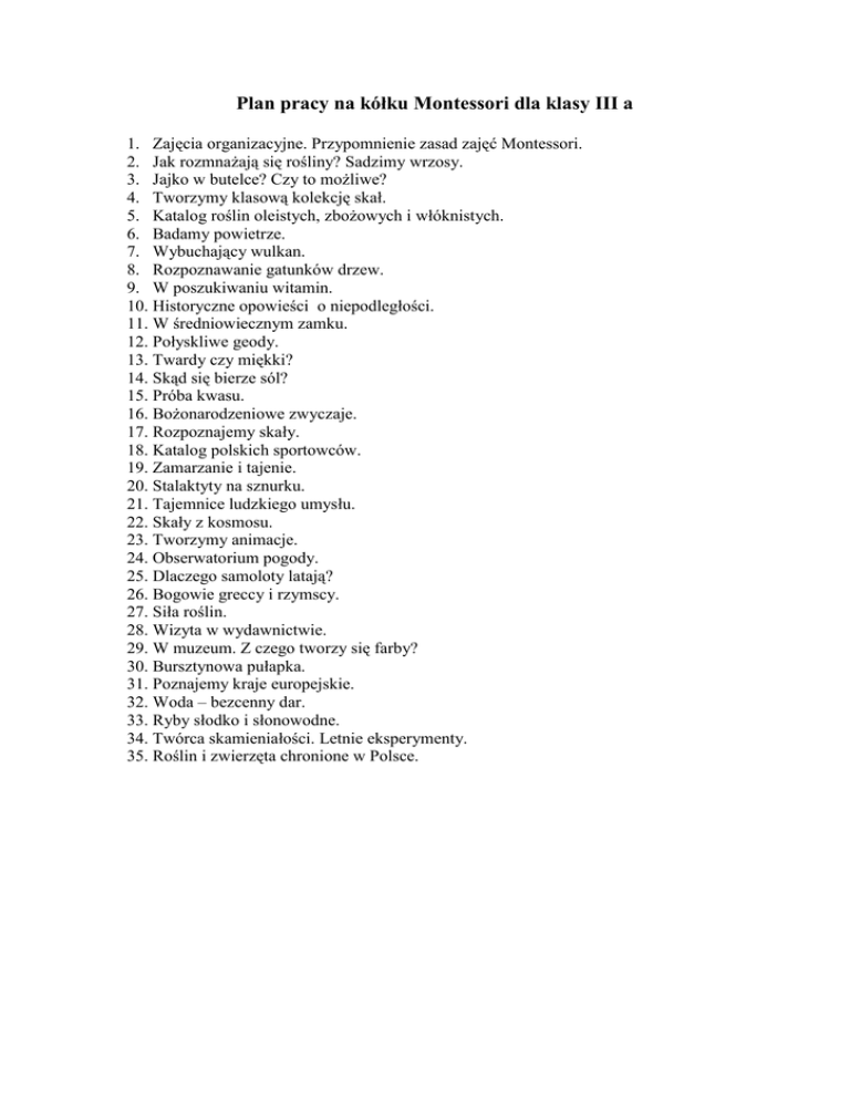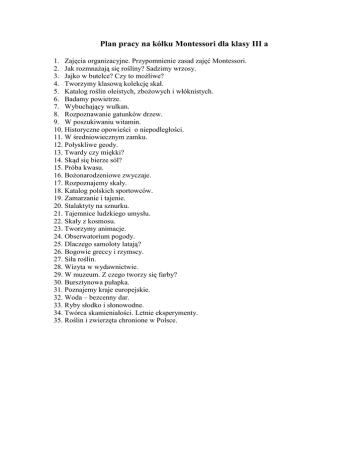 Plan pracy na kółku Montessori dla klasy III a 1. Zajęcia organizacyjne. Przypomnienie zasad zajęć Montessori. 2. Jak rozmnażają się rośliny? Sadzimy wrzosy. 3. Jajko w butelce? Czy to możliwe? 4. Tworzymy klasową kolekcję skał. 5. Katalog roślin oleistych, zbożowych i włóknistych. 6. Badamy powietrze. 7. Wybuchający wulkan. 8. Rozpoznawanie gatunków drzew. 9. W poszukiwaniu witamin. 10. Historyczne opowieści o niepodległości. 11. W średniowiecznym zamku. 12. Połyskliwe geody. 13. Twardy czy miękki? 14. Skąd się bierze sól? 15. Próba kwasu. 16. Bożonarodzeniowe zwyczaje. 17. Rozpoznajemy skały. 18. Katalog polskich sportowców. 19. Zamarzanie i tajenie. 20. Stalaktyty na sznurku. 21. Tajemnice ludzkiego umysłu. 22. Skały z kosmosu. 23. Tworzymy animacje. 24. Obserwatorium pogody. 25. Dlaczego samoloty latają? 26. Bogowie greccy i rzymscy. 27. Siła roślin. 28. Wizyta w wydawnictwie. 29. W muzeum. Z czego tworzy się farby? 30. Bursztynowa pułapka. 31. Poznajemy kraje europejskie. 32. Woda – bezcenny dar. 33. Ryby słodko i słonowodne. 34. Twórca skamieniałości. Letnie eksperymenty. 35. Roślin i zwierzęta chronione w Polsce.