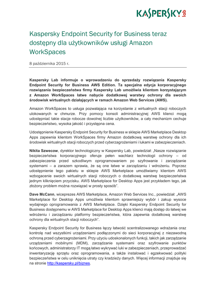 Kaspersky Endpoint Security for Business teraz dostępny dla użytkowników usługi Amazon WorkSpaces 8 października 2015 r. Kaspersky Lab informuje o wprowadzeniu do sprzedaży rozwiązania Kaspersky Endpoint Security for Business AWS Edition. Ta specjalna edycja korporacyjnego rozwiązania bezpieczeństwa firmy Kaspersky Lab umożliwia klientom korzystającym z Amazon WorkSpaces łatwe nabycie dodatkowej warstwy ochrony dla swoich środowisk wirtualnych działających w ramach Amazon Web Services (AWS). Amazon WorkSpaces to usługa pozwalająca na korzystanie z wirtualnych stacji roboczych ulokowanych w chmurze. Przy pomocy konsoli administracyjnej AWS klienci mogą udostępniać takie stacje robocze dowolnej liczbie użytkowników, a cały mechanizm cechuje bezpieczeństwo, wysoka jakość i przystępna cena. Udostępnienie Kaspersky Endpoint Security for Business w sklepie AWS Marketplace Desktop Apps zapewnia klientom WorkSpaces firmy Amazon dodatkową warstwę ochrony dla ich środowisk wirtualnych stacji roboczych przed cyberzagrożeniami i lukami w zabezpieczeniach. Nikita Szwecow, dyrektor technologiczny w Kaspersky Lab, powiedział: „Nasze rozwiązanie bezpieczeństwa korporacyjnego oferuje pełen wachlarz technologii ochrony – od zabezpieczenia przed szkodliwym oprogramowaniem po szyfrowanie i zarządzanie systemami – a zarazem sprawia, że są one łatwe w zarządzaniu i wdrożeniu. Poprzez udostępnienie tego pakietu w sklepie AWS Marketplace umożliwiamy klientom AWS wzbogacenie swoich wirtualnych stacji roboczych o dodatkową warstwę bezpieczeństwa jednym kliknięciem przycisku. AWS Marketplace for Desktop Apps jest przykładem tego, jak złożony problem można rozwiązać w prosty sposób”. Dave McCann, wiceprezes AWS Marketplace, Amazon Web Services Inc., powiedział: „AWS Marketplace for Desktop Apps umożliwia klientom sprawniejszy wybór i zakup wysoce wydajnego oprogramowania z AWS Marketplace. Dzięki Kaspersky Endpoint Security for Business dostępnemu w AWS Marketplace for Desktop Apps klienci mają dostęp do łatwej we wdrożeniu i zarządzaniu platformy bezpieczeństwa, która zapewnia dodatkową warstwę ochrony dla wirtualnych stacji roboczych”. Kaspersky Endpoint Security for Business łączy łatwość scentralizowanego wdrażania oraz kontrolę nad wszystkimi urządzeniami podłączonymi do sieci korporacyjnej z niezawodną ochroną przed cyberzagrożeniami. Przy użyciu udoskonalonych funkcji, takich jak zarządzanie urządzeniami mobilnymi (MDM), zarządzanie systemami oraz szyfrowanie punktów końcowych, administratorzy IT mogą łatwo wykrywać luki w zabezpieczeniach, przeprowadzać inwentaryzację sprzętu oraz oprogramowania, a także instalować i egzekwować polityki bezpieczeństwa w celu uniknięcia utraty czy kradzieży danych. Więcej informacji znajduje się na stronie http://kaspersky.pl/biznes. Informację można wykorzystać dowolnie z zastrzeżeniem podania firmy Kaspersky Lab jako źródła. Wszystkie informacje prasowe http://www.kaspersky.pl/news. Kaspersky Lab Polska są dostępne na stronie Dalszych informacji udziela Piotr Kupczyk Dyrektor biura komunikacji z mediami, Kaspersky Lab Polska E-mail: [email protected] Tel. bezpośredni: 22 206 59 61 Tel. kom.: 518 935 846 Informacje o Kaspersky Lab Kaspersky Lab jest jedną z najszybciej rozwijających się i największą prywatną firmą z branży cyberbezpieczeństwa na świecie. Firma znalazła się w pierwszej czwórce producentów rozwiązań bezpieczeństwa punktów końcowych w klasyfikacji ogólnoświatowej (IDC, 2014). Od 1997 r. Kaspersky Lab pozostaje innowatorem w dziedzinie bezpieczeństwa IT i oferuje skuteczne rozwiązania bezpieczeństwa cyfrowego dla korporacji, małych i średnich firm oraz klientów indywidualnych. Kaspersky Lab jest międzynarodową firmą działającą w niemal 200 krajach, zapewniając ochronę ponad 400 milionom użytkowników na całym świecie. Polskie przedstawicielstwo firmy istnieje od 2000 r. Informacje o bezpieczeństwie przygotowywane przez ekspertów z firmy są dostępne w serwisie SecureList.pl oraz na oficjalnym blogu Kaspersky Lab – Kaspersky Daily. Więcej informacji można uzyskać na stronie www.kaspersky.pl.