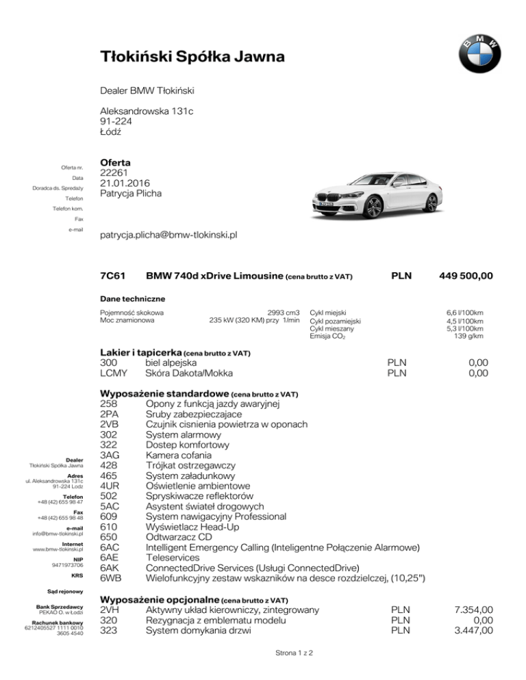 7åRNLĤVNL 6SyåND Jawna Dealer BMW 7æRNLĥVNL Aleksandrowska 131c 91-224 ļyGĵ Oferta nr. Data Doradca ds. 6SUHGDį\ Telefon Oferta 22261 21.01.2016 Patrycja Plicha Telefon kom. Fax e-mail [email protected] 7C61 BMW 740d xDrive Limousine (cena brutto z VAT) PLN 449 500,00 Dane techniczne 3RMHPQRĬĕ skokowa Moc znamionowa 2993 cm3 235 kW (320 KM) przy 1/min Cykl miejski Cykl pozamiejski Cykl mieszany Emisja CO2 Lakier i tapicerka (cena brutto z VAT) 300 biel alpejska LCMY Skóra Dakota/Mokka Dealer 7æRNLĥVNL 6SyæND Jawna Adres ul. Aleksandrowska 131c 91-224 Lodz Telefon +48 (42) 655 98 47 Fax +48 (42) 655 98 48 e-mail [email protected] Internet www.bmw-tlokinski.pl NIP 9471973706 KRS 6,6 l/100km 4,5 l/100km 5,3 l/100km 139 g/km PLN PLN 0,00 0,00 :\SRVDĮenie standardowe (cena brutto z VAT) 258 Opony z IXQNFMĔ jazdy awaryjnej 2PA Sruby zabezpieczajace 2VB Czujnik cisnienia powietrza w oponach 302 System alarmowy 322 Dostep komfortowy 3AG Kamera cofania 428 Trójkat ostrzegawczy 465 System ]DæDGXQNRZ\ 4UR 2ĬZLHWOHQLH ambientowe 502 Spryskiwacze reflektorów 5AC Asystent ĬZLDWHæ drogowych 609 System nawigacyjny Professional 610 :\ĬZLHWODF] Head-Up 650 Odtwarzacz CD 6AC Intelligent Emergency Calling (Inteligentne 3RæĔF]HQLH Alarmowe) 6AE Teleservices 6AK ConnectedDrive Services 8VæXJL ConnectedDrive) 6WB Wielofunkcyjny zestaw wskazników na desce rozdzielczej, (10,25") 6ēG rejonowy Bank Sprzedawcy PEKAO O. w ļRG]L Rachunek bankowy 6212405527 1111 0010 3605 4540 :\SRVDĮHQLH opcjonalne (cena brutto z VAT) 2VH Aktywny XNæDG kierowniczy, zintegrowany 320 Rezygnacja z emblematu modelu 323 System domykania drzwi Strona 1 z 2 PLN PLN PLN 7.354,00 0,00 3.447,00 Oferta nr. Data Oferta 22261 21.01.2016 337 21H Pakiet sportowy M 20" Obrecze kól ze stopu lekkiego Double Spoke 648 M, dwukolorowe Kierownica sportowa, skórzana Sportowa automatyczna skrzynia biegów Komfortowe fotele przednie, regulowane elektryczne Lsitwy ozdobne drewno szlachetne Fineline czarne z metalicznym szlifem Diodowe swiatla przeciwmgielne Pakiet aerodynamiczny M Podsufitka Individual w kolorze antracytowym PLN PLN 26.167,00 6 591,00 PLN PLN PLN PLN 0,00 0,00 0,00 0,00 PLN PLN PLN 0,00 0,00 0,00 Wielofunkcyjny kluczyk samochodowy z wyswietlaczem LCD Szklany dach, elektryczny z IXQNFMĔ otwierania i podnoszenia Przyciemniana szyba tylna i tylne szyby boczne Pakiet ogrzewania Comfort, przod Klimatyzacja automatyczna z UHJXODFMĔ 4-VIHURZĔ Pakiet Ambient Air Aplikacje ceramiczne na elementach REVæXJL Adaptacyjne reflektory diodowe Systemy asystujace kierowcy Zestaw HiFi Harman Kardon Surround Sound Telefonia komfortowa z ladowaniem bezprzewodowym Obsluga za pomoca gestow System sterowania BMW Touch Command Service Inclusive - 5 years/100.000 km Polska wersja Mę]\NRZD Polska instrukcja obslugi BMW ConnectedDrive Plus Real Time Traffic Information Concierge Services (Serwis informacyjny) Remote Services 8VæXJL Zdalne) Internet PLN 1.268,00 PLN 7.557,00 PLN PLN PLN PLN PLN PLN PLN PLN PLN PLN PLN PLN PLN PLN PLN PLN PLN PLN PLN 2.635,00 1.724,00 4.412,00 1.624,00 2.892,00 8.874,00 0,00 6.086,00 567,00 965,00 2.486,00 0,00 0,00 0,00 2.535,00 0,00 0,00 0,00 0,00 :\SRVDĮenie opcjonalne razem PLN 87 184,00 Cena katalogowa (cena brutto z VAT) PLN 536 684,00 Cena FDåNRZLWD netto (bez VAT) PLN 436 328,46 Total cena brutto z VAT PLN 536 684,00 255 2TB 456 4LM 5A1 715 775 3DS 403 420 4HB 4NB 4NM 4U1 552 5AS 688 6NW 6U8 6U9 7NH 8A1 8AT ZD5 6AM 6AN 6AP 6AR Nota prawna Podane ceny VĔ cenami detalicznymi, ]DZLHUDMĔF\PL podatek VAT oraz podatek akcyzowy. Strona 2 z 2 Przykładowa kalkulacja Model. 740d xDrive Limousine Przegląd cen. cena Cena Cena brutto Wyposażenie dodatkowe brutto 449 500,00 PLN 87 184,00 PLN Całkowita cena pojazdu 536 684,00 PLN Przykładowa kalkulacja finansowa. Miesięczna rata brutto 6 008,96 PLN BMW Comfort Lease Decydując się na BMW Comfort Lease zyskujesz możliwość swobodnego wyboru parametrów umowy tak, by była ona najlepiej dostosowana do Twoich oczekiwań. Oferta łączy w sobie zalety podatkowe leasingu operacyjnego z niskim obciążeniem miesięcznym, minimalizację kosztów finansowania pojazdu, gwarancję odkupu i możliwość zmiany samochodu na nowy, po zakończeniu umowy leasingu. Unikatowa konstrukcja BMW Comfort Lease sprawia, że nowe BMW jest teraz także w Twoim zasięgu. Cena z wyposażeniem dodatkowym 536 684,00 zł Opłata wstępna 25,00 % Opłata wstępna 134 171,00 zł Okres leasingu 36 Miesiące Deklarowany średnioroczny przebieg 20 000 km Gwarantowana wartość końcowa 48,81 % Gwarantowana wartość końcowa 261 974,56 zł Miesięczna rata brutto 6 008,96 zł 21.01.16 15:06 BMW Financial Services Polska Przykładowa kalkulacja Warunki finansowania. Parametry finansowania możesz dobrać wedle indywidualnych preferencji. Opłata wstępna od 0% do 35%, okres finansowania 24-60 miesięcy, wartość końcowa uzależniona od długości okresu finansowania oraz deklarowanego, średniorocznego przebiegu w kilometrach. Przykładowa kalkulacja została przygotowana w oparciu o zmienną stawkę WIBOR 1M dla PLN i w przypadku jej zmiany wysokość miesięcznych rat leasingowych może się różnić. Nota prawna. Prezentowane powyżej kwoty zawierają podatek VAT. Przedstawiona propozycja jest niewiążąca i nie stanowi oferty w rozumieniu art. 66 Kodeksu Cywilnego. Niniejsze parametry mają charakter wstępny. Ostateczne warunki zależą od oceny sytuacji finansowo-prawnej Leasingobiorcy oraz zaproponowanej struktury zabezpieczeń i zostaną uregulowane w umowie leasingowej. Po szczegółową ofertę zapraszamy do najbliższego Dealera BMW, gdzie Doradca ds. Finasowania przedstawi kalkulację, dopasowaną do Twoich potrzeb. BMW Comfort Lease jest oferowany w Polsce przez BMW Financial Services Polska Sp. z o.o. 21.01.16 15:06 BMW Financial Services Polska