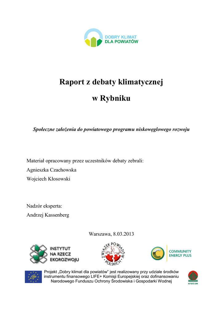 Raport z debaty klimatycznej w Rybniku Społeczne założenia do powiatowego programu niskowęglowego rozwoju Materiał opracowany przez uczestników debaty zebrali: Agnieszka Czachowska Wojciech Kłosowski Nadzór eksperta: Andrzej Kassenberg Warszawa, 8.03.2013 Projekt „Dobry klimat dla powiatów” jest realizowany przy udziale środków instrumentu finansowego LIFE+ Komisji Europejskiej oraz dofinansowaniu Narodowego Funduszu Ochrony Środowiska i Gospodarki Wodnej Społeczne założenia Programu Niskowęglowego Rozwoju powiatu rybnickiego 2 WNIOSKI Z DEBATY KLIMATYCZNEJ W RYBNIKU Debata w Rybniku odbyła się dnia 27 lutego 2013r. w sali sesyjnej Starostwa Powiatowego w Rybniku. Patronat objęli Minister Środowiska i Starosta Rybnicki. Na Debatę zostali zaproszeni i udział w niej wzięli przedstawiciele Starostwa Powiatowego - specjaliści i inspektorzy z Referatu Ochrony Środowiska, Rolnictwa i Leśnictwa, Przewodniczący Rady Powiatu, członkowie Komisji Rolnictwa, Ochrony Środowiska i Gospodarki Wodnej Rady Powiatu, przedstawiciele z: Urzędu Miasta w Rybniku, Urzędu Gminy Lyski, Urzędu Gminy i Miasta Czerwionka-Leszczyny, Urzędu Gminy Gaszowice, liczni przedstawiciele organizacji pozarządowych z następujących instytucji: Stowarzyszenie LYSKOR, Stowarzyszenie Inżynierów i Techników Górnictwa - Zarząd Oddziału Rybnik, Związek Subregionu Zachodniego z siedzibą w Rybniku, Fundacja Ekologiczna EKOTERM SILESIA, Forum Organizacji Pozarządowych Subregionu Zachodniego, Stowarzyszenie Sumina na Rzecz Odnowy i Rozwoju Górnego Śląska oraz Doradca w Inkubatorze Ekonomii Społecznej Subregionu Zachodniego i przedstawicielka Powiatowej Stacji Sanitarno-Epidemiologiczna w Rybniku. Debata miała na celu wypracowanie społecznych założeń do powiatowego programu niskowęglowego rozwoju. W czasie Debaty zostały wymienione następujące uwarunkowania (w postaci zagrożeń i szans), które mają wpływ na rozwój gospodarki regionu a wynikają z kwestii zmian klimatycznych: ZAGROŻENIA: Susze Powodzie Zmniejszenie powierzchni terenów zielonych Negatywny wpływ na rolnictwo: o Zmniejszenie plonów o Zmiana gatunków roślin uprawnych o Przekwalifikowanie rolników o Chemizacja rolnictwa Zmiana sposobów odżywiania Wzmożona zachorowalność Wzrost zanieczyszczeń powietrza Zubożenie społeczeństwa Utrata miejsc pracy Niska świadomość ekologiczna społeczeństwa (m.in. stosowanie paliw do ogrzewania niskiej jakości) Zła edukacja Sprzedaż węgla odpadowego (muły) Brak lub małe egzekwowanie prawa Wysoki koszt paliw konwencjonalnych Wysoki koszt instalacji produkującej energię z OŹE We wszystkich grupach za szczególnie ważne uznano te zagrożenia, które wiążą się ze zmianami negatywnymi w środowisku, w tym skażeniem powietrza i wód oraz niską Społeczne założenia Programu Niskowęglowego Rozwoju powiatu rybnickiego 3 świadomością ekologiczną społeczeństwa, która bezpośrednio wpływa na zanieczyszczenie środowiska. Jako szanse grupy wymieniły, co następuje: SZANSE: Otwarcie się na nowe technologie i tym samym popularyzacja nowoczesnych technologii i rozwiązań energooszczędnych Innowacyjność Nowe technologie generujące nowe miejsca pracy Rozwój OŹE i wykorzystanie odpadów Gospodarka odpadami Zakaz sprzedaży węgla niskokalorycznego Zagospodarowanie bioodpadów Wykorzystanie metanu z kopalń Wykorzystanie wód geotermalnych z kopalń Wykorzystanie ciepłej wody z Zalewu Rybnickiego Budowa spalarni w powiecie i wykorzystanie energii Spadek zanieczyszczeń powietrza a tym samym poprawa jakości powietrza i środowiska Wzrost środków UE na likwidację niskiej emisji Możliwości pozyskiwania zewnętrznych środków finansowania Dialog pomiędzy grupami społecznymi Integracja społeczeństwa wokół celów ekologicznych Rozwój rolnictwa ekologicznego Powrót do tradycji (odżywianie) Poprawa zdrowia Wzrost alternatywnych kierunków zbytu artykułów rolnych (rolnictwo na potrzeby energetyki) oraz nowe uprawy (wierzba energetyczna) Korzystanie z dobrych przykładów Wyższa świadomość społeczeństwa Nowe budownictwo ekologiczne wsparte przez fundusze WFOŚiGW Wzrost popytu na różnego rodzaju usługi (np. budowa „ciepłych” domów) Uczestnicy Debaty kontynuując pracę w trzech grupach wypracowali następujące propozycje i wizje Powiatu (zebrane w grupy tematyczne) w 2030 r., biorąc pod uwagę zmiany klimatyczne: 1. TRANSPORT Perfekcyjna komunikacja zbiorowa (tani, ekologiczny transport publiczny dostosowany do potrzeb) Trasa średnicowa Pszczyna –Racibórz przez Powiat Rybnicki Dobre drogi Stworzenie linii kolejowej – gęste przystanki, szynobusy, w tym likwidacja sieci napowietrznych i utworzenie podziemnej kolei Bogata sieć ścieżek rowerowych z trasami szybkiego ruchu rowerowego Rozwój infrastruktury turystycznej zachęcający do aktywnego wypoczynku (parkingi, ścieżki rowerowe) Lotnisko o zasięgu krajowym 2. ŚRODOWISKO Społeczne założenia Programu Niskowęglowego Rozwoju powiatu rybnickiego 4 Czyste i kolorowe środowisko Czyste powietrze, woda, gleba Dużo zieleni Nie mamy odpadów 3. ŚWIADOMOŚĆ EKOLOGICZNA I SPOŁECZEŃSTWO Świadome społeczeństwo dbające o środowisko Zamożne społeczeństwo Atrakcyjne miejsca pracy (brak migracji) Uproszczenie procedur z pozyskiwaniem środków finansowych 4. BUDOWNICTWO I ZAGOPODAROWANIE PRZESTRZENNE Uporządkowana urbanistyka miasta, ład przestrzenny Zadbane i zalesione tereny zielone, duża ilość wody i fontann Nowoczesne (energooszczędne i pasywne) skoncentrowane budownictwo, wykorzystujące zintegrowane technologie pozyskiwania energii odnawialnej (geotermy, energia słoneczna, fotowoltaika - energia do ogrzewania domów za darmo) Termomodernizacja istniejących budynków Nowoczesne ogrzewanie wszystkich domów ciepłociągami 5. ODNAWIALNE ŹRÓDŁA ENERGII I ICH WYKORZYSTANIE Czyste i nowoczesne technologie przemysłowe Wzrost popularności OŹE W