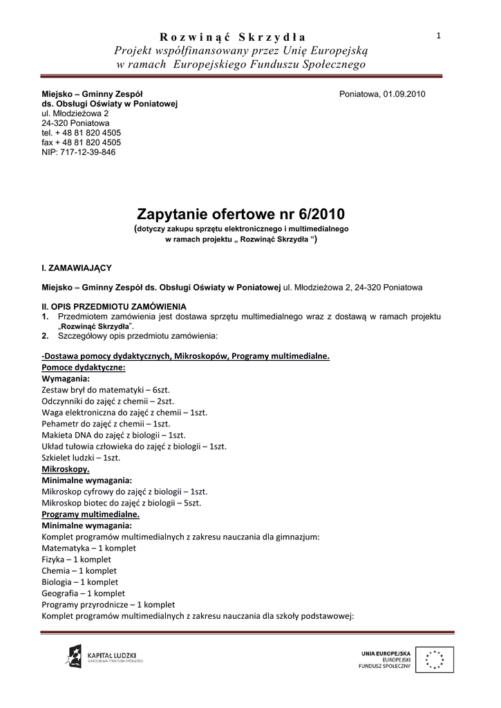 Rozwinąć Skrzydła Projekt współfinansowany przez Unię Europejską w ramach Europejskiego Funduszu Społecznego Miejsko – Gminny Zespół ds. Obsługi Oświaty w Poniatowej ul. Młodzieżowa 2 24-320 Poniatowa tel. + 48 81 820 4505 fax + 48 81 820 4505 NIP: 717-12-39-846 1 Poniatowa, 01.09.2010 Zapytanie ofertowe nr 6/2010 (dotyczy zakupu sprzętu elektronicznego i multimedialnego w ramach projektu „ Rozwinąć Skrzydła ”) I. ZAMAWIAJĄCY Miejsko – Gminny Zespół ds. Obsługi Oświaty w Poniatowej ul. Młodzieżowa 2, 24-320 Poniatowa II. OPIS PRZEDMIOTU ZAMÓWIENIA 1. Przedmiotem zamówienia jest dostawa sprzętu multimedialnego wraz z dostawą w ramach projektu „Rozwinąć Skrzydła”. 2. Szczegółowy opis przedmiotu zamówienia: -Dostawa pomocy dydaktycznych, Mikroskopów, Programy multimedialne. Pomoce dydaktyczne: Wymagania: Zestaw brył do matematyki – 6szt. Odczynniki do zajęć z chemii – 2szt. Waga elektroniczna do zajęć z chemii – 1szt. Pehametr do zajęć z chemii – 1szt. Makieta DNA do zajęć z biologii – 1szt. Układ tułowia człowieka do zajęć z biologii – 1szt. Szkielet ludzki – 1szt. Mikroskopy. Minimalne wymagania: Mikroskop cyfrowy do zajęć z biologii – 1szt. Mikroskop biotec do zajęć z biologii – 5szt. Programy multimedialne. Minimalne wymagania: Komplet programów multimedialnych z zakresu nauczania dla gimnazjum: Matematyka – 1 komplet Fizyka – 1 komplet Chemia – 1 komplet Biologia – 1 komplet Geografia – 1 komplet Programy przyrodnicze – 1 komplet Komplet programów multimedialnych z zakresu nauczania dla szkoły podstawowej: Rozwinąć Skrzydła Projekt współfinansowany przez Unię Europejską w ramach Europejskiego Funduszu Społecznego 2 Matematyka – 5 kompletów Przyrody – 5 kompletów 3. 4. W celu realizacji zamówienia Zamawiający, przekaże Wykonawcy materiały w postaci pliku graficznego JPG. Zamawiający niedopuszcza możliwości składania ofert częściowych. III. TERMIN WYKONANIA ZAMÓWIENIA Termin wykonania przedmiotu zamówienia: do 20.09.2010 r. IV. OPIS SPOSBU PRZYGOTOWANIA OFERTY Oferta powinna być: - posiadać datę sporządzenia, - zawierać adres lub siedzibę oferenta, numer telefonu, V. MIEJSCE ORAZ TERMIN SKŁADANIA OFERT 1. Oferta powinna być przesłana za pośrednictwem: poczty elektronicznej na adres: [email protected] , faksem na nr: + 48 81 820 4505, poczty, kuriera lub też dostarczona osobiście na adres: ul. Młodzieżowa 2, 24-320 Poniatowa do dnia 10.09.2010. do godz.10.00. 2. 3. 4. Oferty złożone po terminie nie będą rozpatrywane Oferent może przed upływem terminu składania ofert zmienić lub wycofać swoją ofertę. W toku badania i oceny ofert Zamawiający może żądać od oferentów wyjaśnień dotyczących treści złożonych ofert. VI. OCENA OFERT Zamawiający dokona oceny ważnych ofert na podstawie następujących kryteriów: 1 - Cena 100% VII. DODATKOWE INFORMACJE Dodatkowych informacji udziela dyrektor Edwin Kaczmarski pod numerem telefonu 81 820 45 05 oraz adresem email: [email protected]